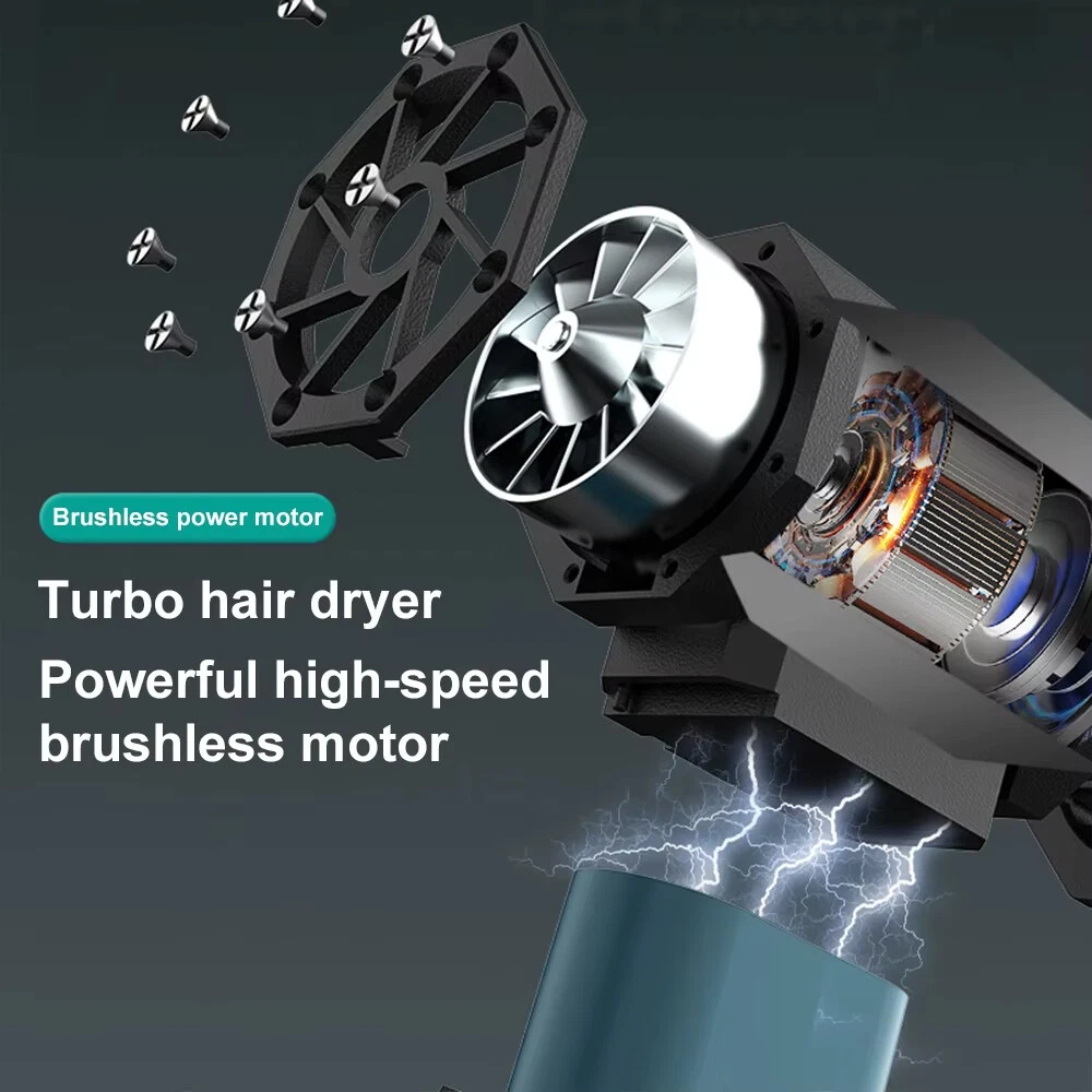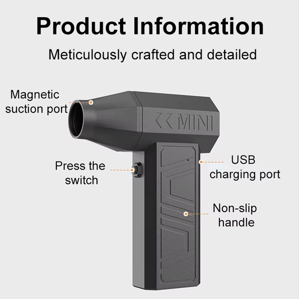 Descri ption : The genuine X3 upgraded version of the violent turbofan uses a brushless DC high-speed motor with a maximum output speed of 130,000 RPM. It can generate super strong wind speeds of up to 52 meters per second, which is equivalent to a 16-level typhoon. It is powerful, durable and stable, and will not burn under long loads. It also has charging protection and overheating protection functions. It has a long battery life of up to 4 hours in one gear. It has two built-in 21700 batteries with a battery capacity of 3000mAh, which makes it last longer! It can adjust the speed in three gears, giving you a different experience. Features: 1. High-quality Components: this mini turbojet fan adopts super-quality imported high-speed bearings, brand-new CNC metal turbine, brushless motor and hand-wound motor to generate pressure and wind speed exceeding 52+m/s. Available with 3 wind speed settings. 2. Wireless Design with Long Battery Life: Built-in 3000mAh battery realize wireless operation without external power supply. Enjoy the convenience of lasting use. 3. High-quality Structure: the machine has four shark gills to actively dissipate heat, and the hot air can be effectively discharged from the engine room, thus ensuring long-term operation. 4. Portable and Compact: With its mini size and lightweight design, it is very convenient to carry. The compact body of the turbo fan is easy to carry and convenient to use outside. 5. Uses: air cushion blowing and inhaling, computer equipment cleaning, industrial dust blowing, charcoal burning and combustion-supporting, car cleaning and snow blowing, photo studio shooting, pet drying and many other uses. 6. Premium Construction: Pocket Style: Wireless design is stylish and sophisticated. The TYPE-C charging interface supports 20W fast charging, and its compact size is easier to operate with one hand, ensuring fast and efficient power replenishment. 7. Easy-to-use operation: adopts three-speed speed adjustment and has indicator light display. The portable turbofan's user-friendly design ensures effortless functionality. In addition, the charging pad also has protection and overheating protection functions for safe and reliable charging. The internal brushless motor enables high speeds up to 130000RPM (revolutions per minute). Description: 1. Electric Adjustment: 30A 2. Power: 180W 3. Continuous Use Time: 4 hours at the first gear 4. Battery Capacity: 3000mAh 5. Shell Material: ABS Package Includes: 1 x Turbofan 1 x Type-C Cable 1 x Magnetic Nozzle On Jan 4, 2025 at 09:10:19 PST, seller added the following information: