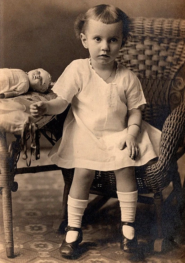 RPPC VINTAGE OLD ANTIQUE REAL PHOTO POSTCARD GIRL KID DRESS DOLL WICKER CHAIR