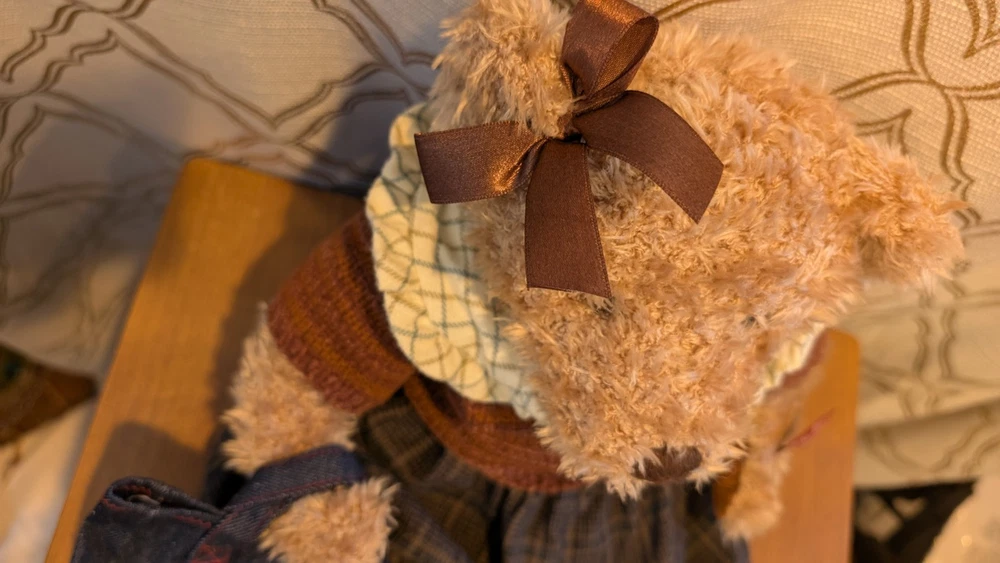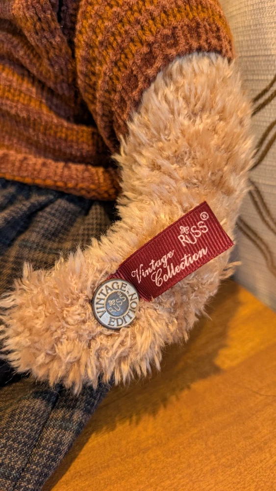 RUSS BERRIE VTG COLLECTION- Handmade LADY MEREDITH Teddy Bear With Bag, 14” is a unique and collectible plush bear that was manufactured in 2004. It is a Vintage Edition Bear that comes with a beige color and fake fur material. The bear has a unique character, Lady Meredith, and is sold as a single unit. It is an original bear that is handmade and comes with clothing and a bag. This bear is suitable for all occasions and is a perfect gift for anyone who loves bears.
