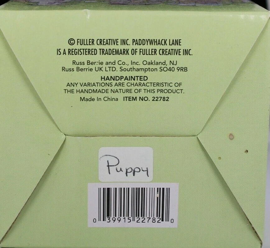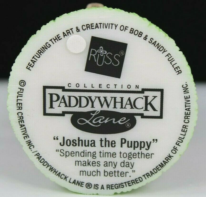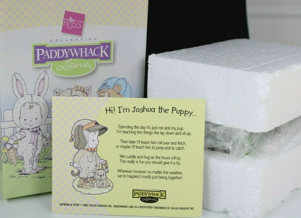 RUSS COLLECTION PADDYWHACK LANE 2002 JOSHUA THE PUPPY FIGURINE HANDPAINTED NEW BEAUTIFUL COLLECTIBLE PADDYWHACK LANE FIGURINE FROM THE RUSS COLLECTION ITS JOSHUA THE PUPPY, HE IS HAPPIEST WHEN HE CAN SPEND ALL DAY WITH HIS FRIEND SPENDING TIME TOGETHER MAKES ANY DAY MUCH BETTER JUST OVER 3 INCHES TALL AND 2 INCHES WIDE✨✨✨ FEATURES THE CREATIVE ART OF BOB AND SANDY FULLER VINTAGE YET BRAND NEW NEVER OPENED PREVIOUSLY HAD BEEN IN STORAGE AT A RETAIL WAREHOUSE FOR ALMOST 20 YEARS WE UNBOXED TO INSPECT FOR CONDITION AND PHOTO HAS ORIGINAL TAG AND PACKAGING GREAT PAINT AND AMAZING DETAIL HANDCRAFTED HANDPAINTED COLLECTIBLE FIGURE IS IN LIKE NEW CONDITION BOX IS IN GOOD CONDITION✨ A MINOR CREASE ON THE FRONT LEFT HARD TO SEE A STICKER ON THE BOTTOM OF BOX SAYS PUPPY 2002 VINTAGE WOULD MAKE AN AWESOME GIFT! ADD TO YOUR COLLECTION Will ship to you with great care. Will ship to the United States and Protectorates via USPS International shipments will ship via Ebay's Global Shipping Program (GSP) International packages will ship within one business day to eBay's GSP. eBay's GSP will then ship the package internationally. Handling and Shipping times may vary with GSP. Brought to you by The VinKris Collection