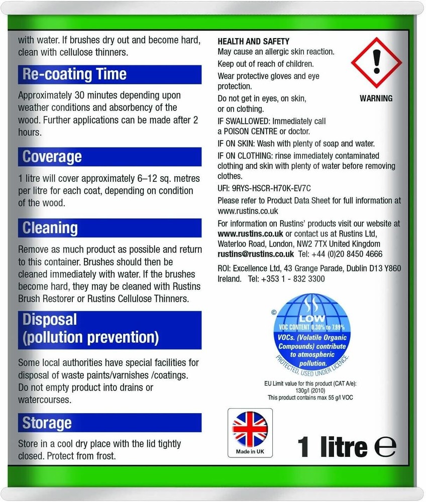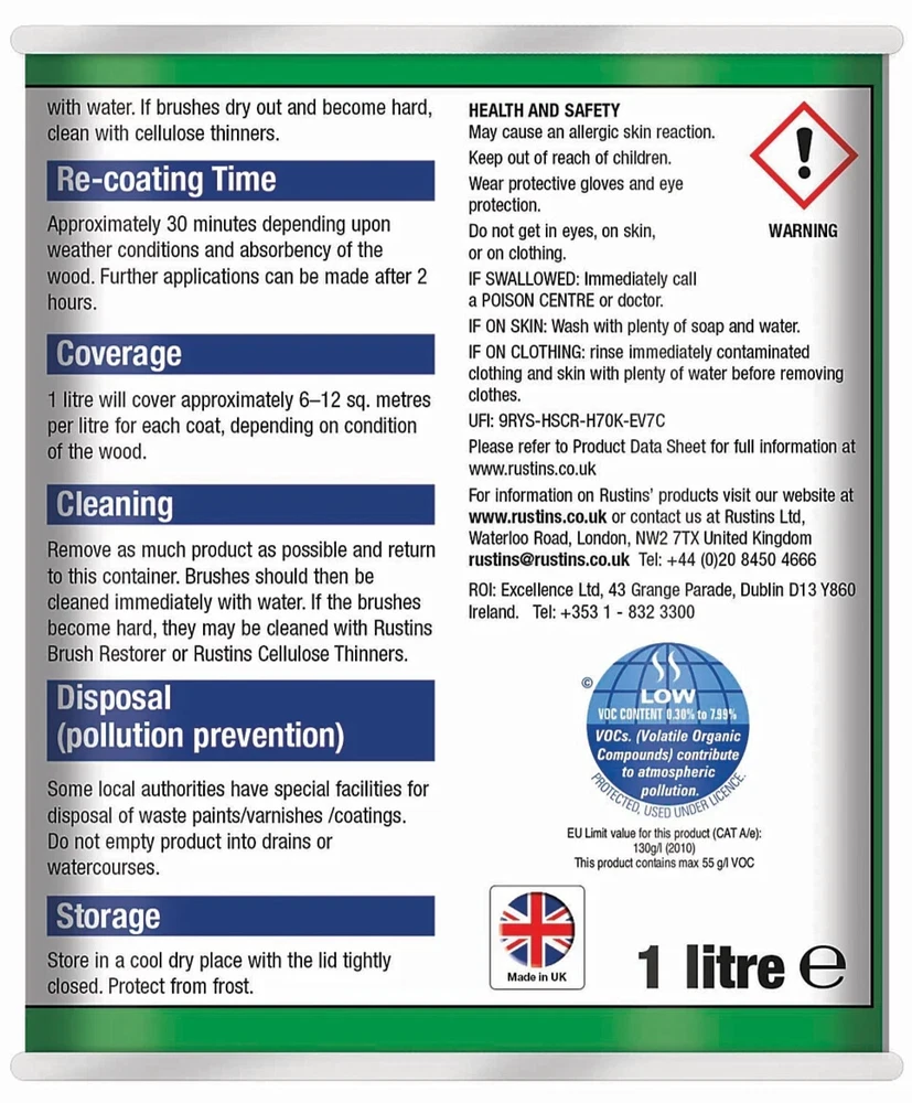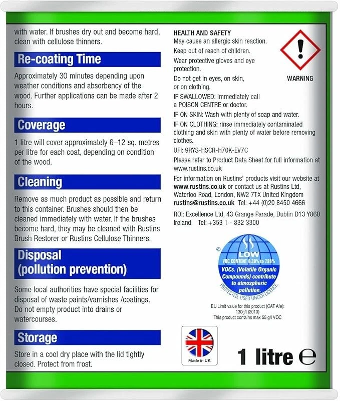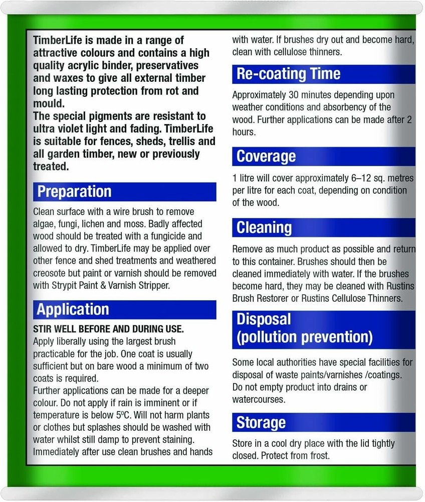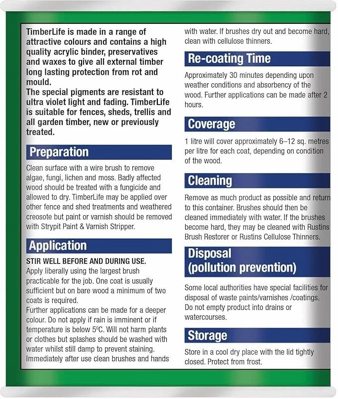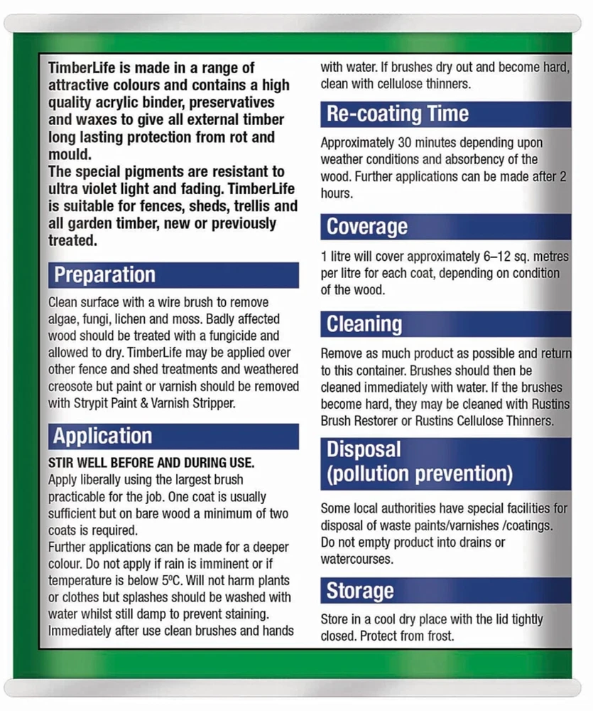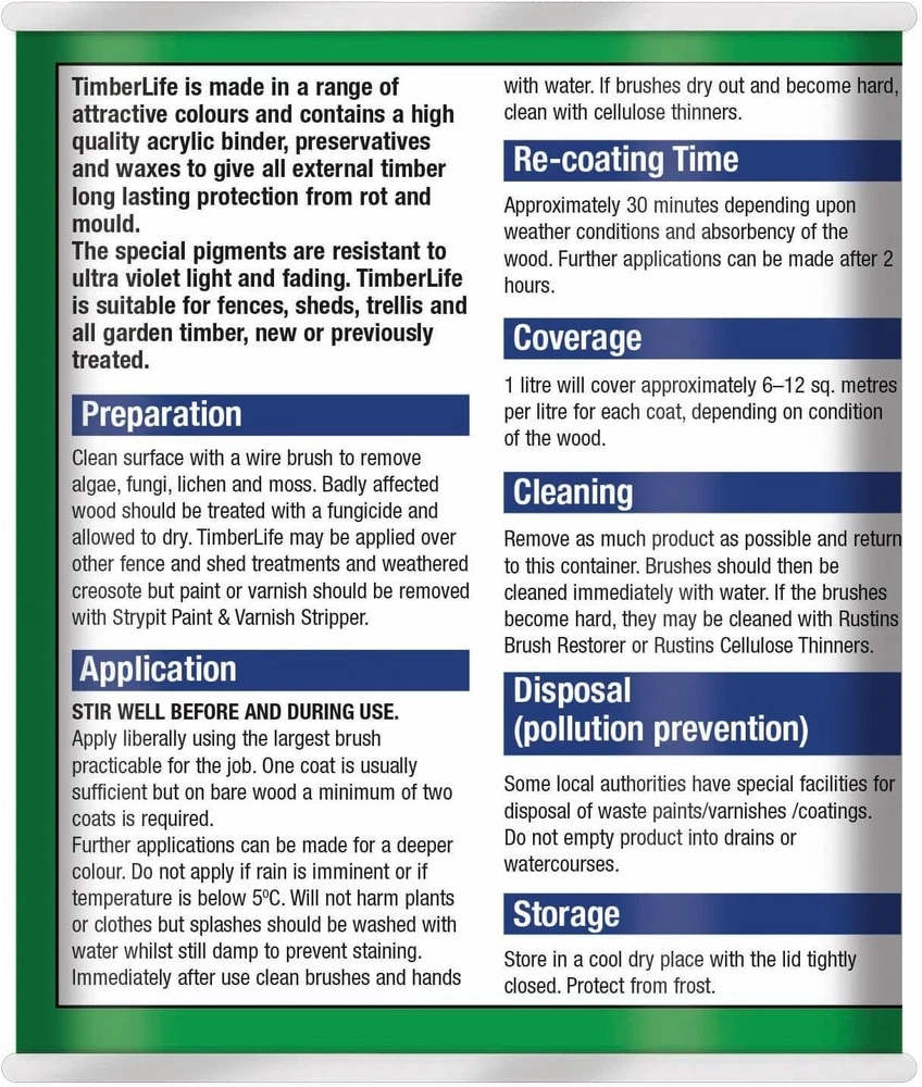 Powered by Frooition Helpful Links Add to Favourite Sellers Sign up to Newsletter View Feedback Contact Seller Visit seller's eBay Shop About Seller Page clearance DIY Tools Home Appliances Outdoor & Garden Kitchen & Homeware Toys & Games Sporting Goods Health & Beauty Baby & Toddler Electronics Musical Instruments Rustins TimberLife 1L Rustins TimberLife 1L Fast Delivery Secure Payments Ask a Question Follow SuperGift More Items! View more great items 2 X 400ML STOVE PAINT HEAT RESISTANT BLACK MATT SPRAY PAINT HIGH TEMPERATURE £12.99 SPRAY PAINTS ALL PURPOSE AEROSOL MATT GLOSS SATIN PRIMER GLITTER NEON METALLIC £5.75-£10.95 300ML WHITE RADIATOR PAINT GLOSS FINISH PAINT TIN QUICK DRYING FOR METAL PAINT £6.99 2 X 300ML BRILLIANT WHITE RADIATOR SPRAY PAINT HEAT RESISTANT QUICK DRY AEROSOL £10.95 Item Descriptio RUSTINS TIMBERLIFE 1L Rustins Timberlife 5 Year Treatment is a durable, water-based wood preservative designed for long-lasting protection of exterior timber. Specially formulated to penetrate and protect garden woodwork such as fences, sheds, pergolas, gates, and decking, it offers up to 5 years of weather-resistant performance in a beautiful, natural finish. The quick-drying, low-odour formula is easy to apply and provides excellent protection against UV damage, moisture, and fungal growth, helping extend the life and appearance of your outdoor timber. Features: ✅ Up to 5 years of protection for exterior wood ✅ Quick drying – touch dry in approx. 30 minutes ✅ Water-based – low odour and easy cleanup ✅ Resists UV damage, rain, and fungal growth ✅ Ideal for softwood and hardwood garden timber ✅ Easy brush-on application ✅ Available in a range of natural wood colours Item Specification Brand Rustins Colour Multicoloured Material Water-based Type Wood Preserver Weight 1L EAN 5015332743032 MPN RUS-TIO-1LT-1 About Us About Us Delivery Returns Terms Contact About Us Discover SuperGift utilising the latest technologies to make your shopping experience even better. Our pages are fully responsive and offer a unique online shopping experience such as frequently bought items and recommended gifts. We want to be the first to know all about your needs, and that's why we have SuperGift online Browse our store and search your next needed product. Delivery Delivery Please be advised that bulk order may require palletising. In the event this occurs, the courier will contact you to discuss how to move forward. If you have any issues, you can also contact us. Please be aware while we guarantee that we will dispatch your order however we cannot be held responsible for any delays with the courier. All orders are dispatched with Royal Mail or DPD local. Dispatch time - Same day if ordered before 2pm (working days only) Important information: We are only able to dispatch your order to the address registered on your PayPal account at the time of payment. Please ensure any address changes are updated prior to ordering. If you live in any of the following regions, your delivery may have a higher cost: Scottish Highlands, Orkney, Shetland and Western Scottish Islands and Northern Ireland. We are not able to ship to: BFPO Channel Islands Republic of Ireland (Eire) Isle of Man Please be aware that in certain circumstances our couriers are unable to deliver to some postcode areas. In this instance we will cancel and refund your order. ? All delivery times are subject to change, especially during peak periods. Returns Returns SuperGift Cancellation Returns and Refunds Policy At SuperGift we strive to ensure that our customers enjoy an outstanding online shopping experience. Occasionally our customers may need assistance and our Customer Services Team will do their best to support and assist in any way necessary. Returning an item to SuperGift I have changed my mind and would like to return my purchase To return an item(s) please notify Customer Services at SuperGift by email via My eBay. Please state the order number and a reason why you may wish to return the product to us. Please allow up to 48 hours for a response. The returned goods do not need to be in their SuperGift packaging however they need to be in their original, sellable condition. Please include a note within the returned package with a reason for return (even if you have just changed your mind) as well as your name and address. Buyers have 30 days to return a product to SuperGift for a refund or an exchange. Return postage is at the buyers own cost and risk. Our returns policy does not affect your statutory rights. Faulty or Damaged Items My item has arrived damaged or faulty If your purchase arrives damaged or faulty, please contact SuperGift within 7 days of receiving the item. Customer Services at SuperGift will be happy to support customers in resolving such issues. You may be asked to provide photographic images of the damage or product fault for Customer Services to investigate and resolve. By providing these, Customer Services can suggest the most appropriate resolutions. If asked to return a damaged or faulty item, SuperGift are responsible for the cost of postage. Customers have 30 days from purchase to return a faulty or damaged item to SuperGift for an exchange (stock permitting) or refund. If you return goods claiming they are defective, we will examine the returned goods and will notify you of your refund via e-mail. We will process the refund as soon as possible. If a refund or reimbursement is payable to you, we will transfer the money using the same method originally used by you to pay for your purchase. Please note, if SuperGift organise for a courier to collect a faulty / damaged item from your home and they are unable to access the item, a fee of £15.00 will be deducted from the total refund given. My item has developed a fault within 30 days of delivery. Within 30 days of the receipt of goods (or for perishable goods within their use by date) you will be offered the choice of a repair, replacement or ful