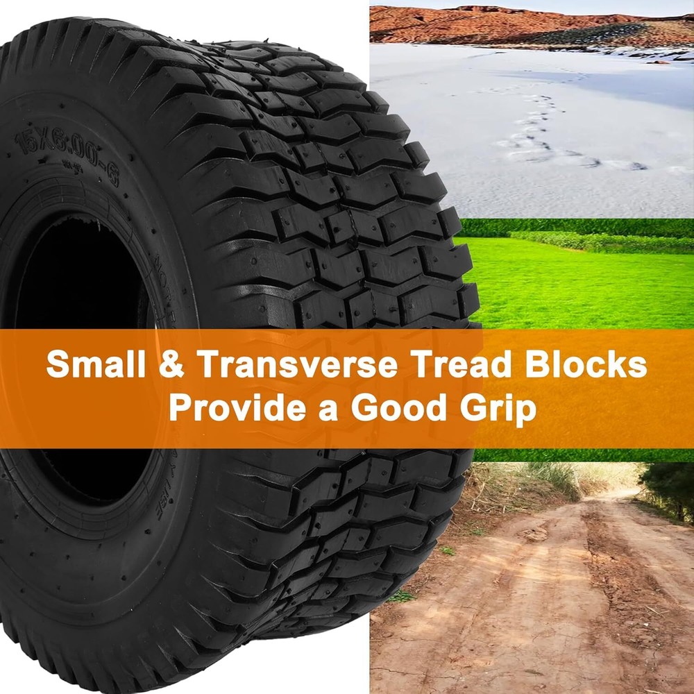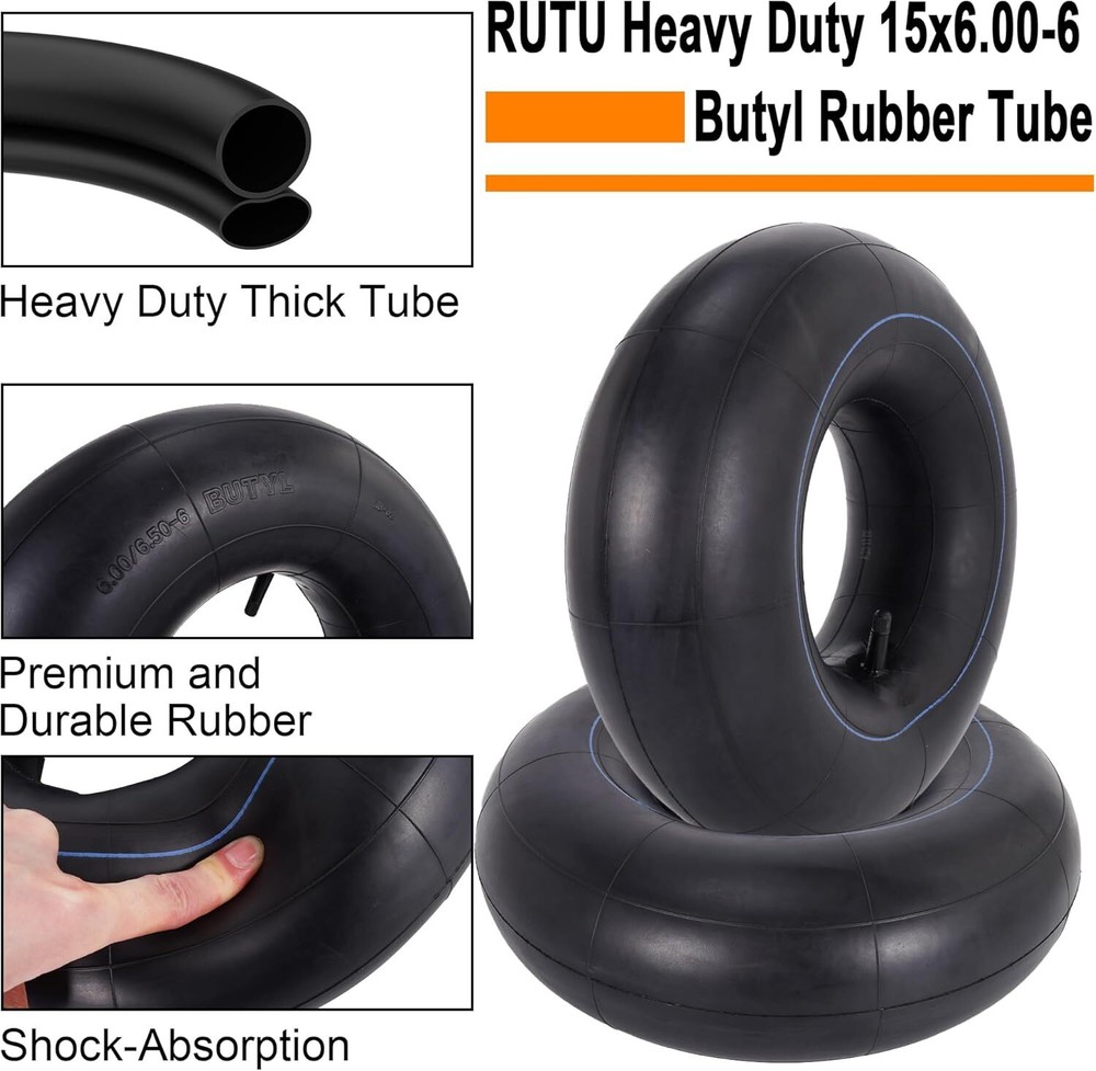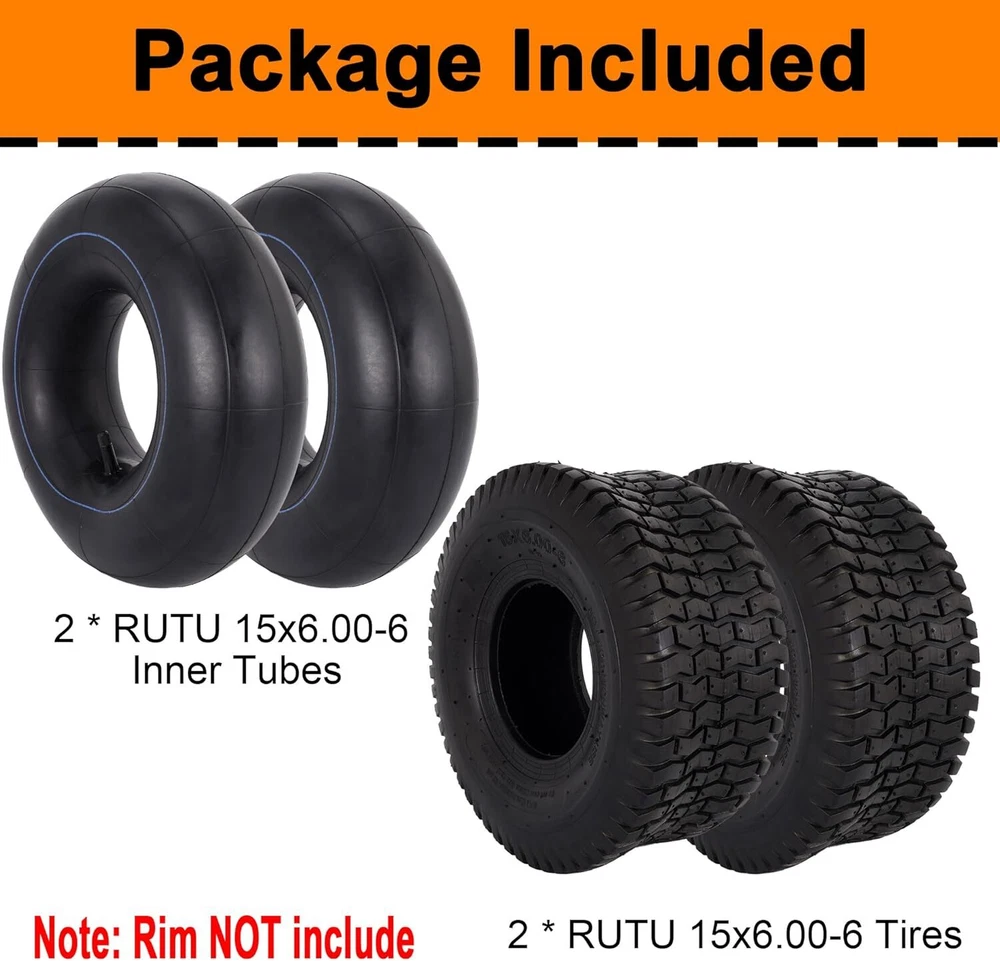 Store New Arrivals Add to Favorite View Feedback Contact RUTU 15x6.00-6 Lawn Mower Tires & Inner Tubes Set (2 Tires + 2 Tubes) - Durable, Wear-Resistant RUTU 15x6.00-6 Lawn Mower Tires & Inner Tubes Set (2 Tires + 2 Tubes) - Durable, Wear-Resistant Product Description: Overview: The RUTU 15x6.00-6 Lawn Mower Tire and Inner Tube Set is designed to provide high-quality performance for a variety of outdoor equipment. This set includes two 15x6.00-6 tires and two matching inner tubes, perfect for riding lawnmowers, garden tractors, wheelbarrows, and more. Featuring a wear-resistant rubber construction, these tires ensure durability and stability, even on the toughest surfaces, making them ideal for year-round use. Key Features: Complete Set: The set includes two 15x6.00-6 outer tires and two 15x6.00-6 inner tubes. Please note that rims are not included . Wide Compatibility: These 15x6.00-6 tires are suitable for a wide range of equipment, including riding lawnmowers, yard tractors, lawn wagons, garden trailers, wheelbarrows, and tillers. Ensure you verify your tire size before purchasing to ensure a perfect fit. Wear-Resistant Outer Tires: Crafted from high-strength, wear-resistant rubber, these tires are built to last. They offer excellent durability and can roll easily on various surfaces, providing reliable performance in all seasons. High-Quality Inner Tubes: The 15x6.00-6 inner tubes are made from premium rubber, offering superior air tightness and elasticity. These tubes are resistant to ozone cracking and dry rot, ensuring long-lasting durability even in tough outdoor conditions. Superior Traction & Stability: The tires feature small, transverse tread blocks that provide optimal traction and stability, even on wet, muddy grass. This allows for easy handling and protects the turf from damage during operation. Specifications: Tire Size: 15x6.00-6 Included: 2 tires + 2 inner tubes (Rims not included) Material: High-strength, wear-resistant rubber (Tires), premium rubber (Inner Tubes) Compatibility: Riding lawnmowers, garden tractors, wheelbarrows, tillers, and more Tread Design: Small, transverse blocks for superior traction and stability Why Choose This Tire & Inner Tube Set? This tire and inner tube set offers an affordable and reliable solution for your lawn care equipment. Built for durability, easy handling, and stability, it’s the perfect replacement set to keep your outdoor equipment in top shape throughout the year. FAQs: Do the tires come with rims? No, this set includes only the tires and inner tubes. Rims are not included. Will these tires fit my lawn mower? These tires are designed for equipment that requires 15x6.00-6 tires, such as riding lawnmowers, yard tractors, and garden trailers. Please verify your tire size before purchasing. Are these tires suitable for use in all seasons? Yes, the tires are made from durable, wear-resistant rubber and can perform well in any season, providing reliable traction even in wet or muddy conditions. How do I know if these inner tubes will fit my equipment? These inner tubes are made to fit the 15x6.00-6 tires. Ensure your equipment uses the same size before purchasing. What kind of tread design do the tires have? The tires feature small, transverse tread blocks, offering excellent traction and stability, ideal for use on grass and other surfaces. Are these inner tubes resistant to cracking or dry rot? Yes, the inner tubes are made of high-quality rubber and are resistant to ozone cracking and dry rot, ensuring they last longer. Can these tires be used on wheelbarrows? Yes, these tires are suitable for wheelbarrows, as well as other lawn and garden equipment such as lawnmowers and garden trailers. How durable are the tires? The tires are made from high-strength, wear-resistant rubber, ensuring long-lasting durability even under heavy use. Are the tires easy to install? Yes, these tires are easy to install with the inner tubes. Just mount the tire on the rim and inflate the tube. Can I use these tires in muddy or wet conditions? Yes, the tires are designed with tread blocks that ensure great traction and stability, even in wet, muddy grass. Speed Rating A3 Rim Size 6 Inches Tire Aspect Ratio 65 Tire Diameter 15 Inches Maximum Pressure 30 Pound per Square Inch Section Width 6.22 Inches Item Diameter 15 Inches Load Capacity 570 Pounds Rim Width 4.5 Inches Load Index 63 Speed Rating A3 Tread Type Non-Directional Seasons Year Round Load Index 63 Tread Depth 3 Millimeters Ply Rating 4-Ply Rim Size 6 Inches Tire Aspect Ratio 65 Size 15X6.00-6nhs Tires and Tubes PRODUCT DIMENSIONS : . Weight: 11.88 lb About Us Welcome to Perishey, your premier destination for high-quality products at unbeatable prices. Our commitment to excellence ensures that you receive top-notch service and premium items across a variety of categories. Our professional customer support team is always ready to assist you with any inquiries or needs, ensuring a seamless shopping experience. We take pride in serving you and strive to bring a smile to your face with our exceptional service and products. Visit our eBay store to explore our full range of offerings and discover the great deals we have in store for you. Thank you for choosing Laelegencia. Payment policy We have eBay Managed Payments, allowing you to pay with any payment method that eBay accepts. Please ensure that your shipping addresses are accurate. Immediate payment is required before we can send out your package. Shipping policy We are always working hard to ensure your package arrives as soon as possible. Please understand that some factors like weather, high postal traffic, and the performance of shipping companies are outside of our control. In most cases, your package will arrive before due time as it is a high priority for us. If there are any unexpected delays, please let us know and we will take care of it immediately. We have multiple locations in the US; residents of these states will be charged tax acco