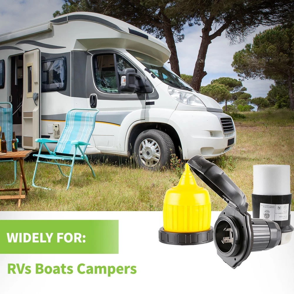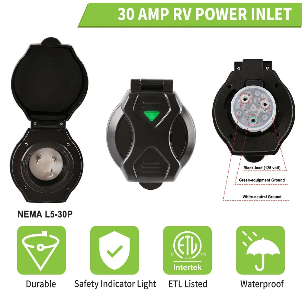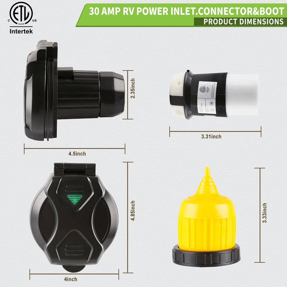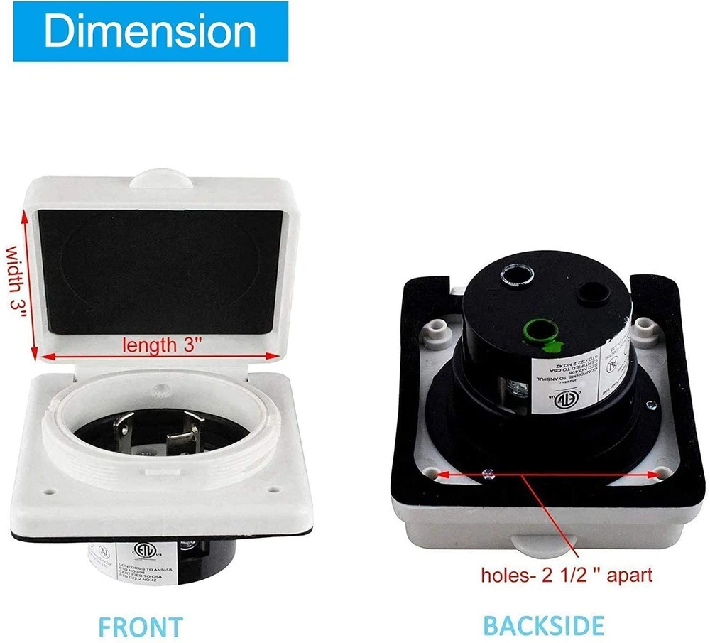 Features: Quanity: One power inlet receptacle ,One female twist locking connector, One weather-proof boot. Amps: 30 amp Voltage: 125V AC Hole Saw :2-7/8" , 30amp inlet requires the use of 8awg or 10awg wire, 3-wire :Black -load(125 volt) ,white - neutral, green - -equipment ground, Works great and was easy to install. RV Inlet constructed from corrosion-resistant plastic and stainless steel materials. Cover constructed with a bright yellow rubber body and Black heavy-duty plastic ring for extra longevity with no leaks. Specification: Item Weight:15.2 ounces Package Dimensions:6.4 x 5.6 x 3.3 inches Notice: In case the item is defective, please inform us within 15 days of receipt, we will arrange reship or refund. Buyers have to pay for the return cost and we will pay the cost for resend. If you are unsatisfied with our item or service, please contact us before leaving any feedback. We are committed to resolve all issues in a friendly and satisfactory manner. We always reply to messages within 2 business days (off-duty at weekend).If you do not get a response from us, then please check your junk or spam mailbox.