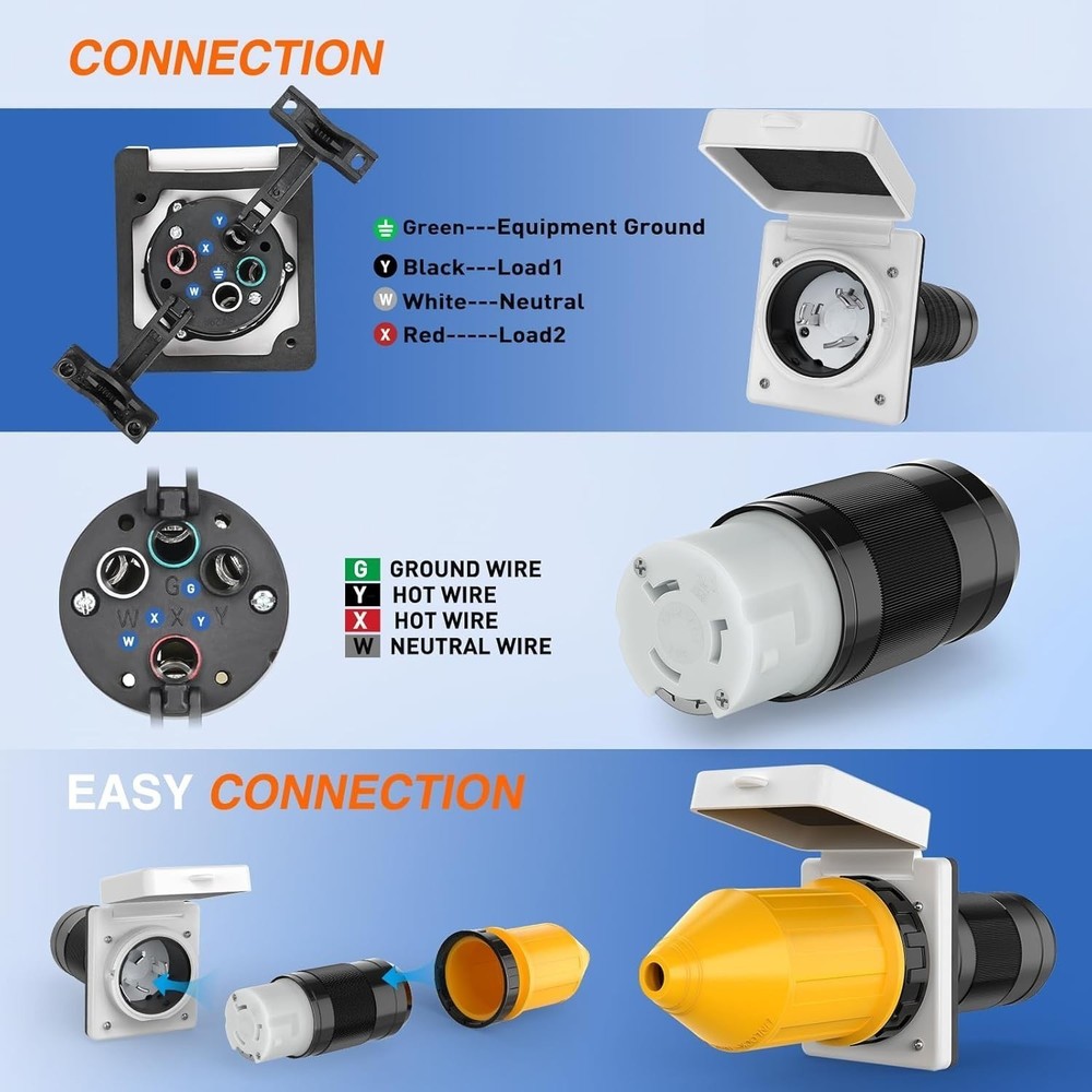 Features: Includes 50 amp RV power inlet receptacle ,female twist locking connector, weather-proof boot with locking ring.Rating: 125V AC 50A; Withstand Voltage. The RV power inlet box is constructed from a high quality PVC. The cover is made of corrosion resistant materials and perfect for water-proof. Fits for RV,Trailer, Boat, Caravan, Camper, Truck ,Yacht and so on.For indoor or outdoor use with specific transfer switches, manual transfer panels and generator-ready load center. With color coded wire installation,easy to install. W=white wire G=green wire X=red wire Y=black wire. Specification: Item Weight: 15.2 ounces Package Dimensions: 7.1 x 5 x 3 inches Material: Nylon, Metal P ackage List: 1 x50A Power Inlet 1 x50A Female Twist Locking Connector 1 x 50A Weather-proof Boot with Locking Ring Notice: In case the item is defective, please inform us within 15 days of receipt, we will arrange reship or refund. Buyers have to pay for the return cost and we will pay the cost for resend. If you are unsatisfied with our item or service, please contact us before leaving any feedback. We are committed to resolve all issues in a friendly and satisfactory manner. We always reply to messages within 2 business days (off-duty at weekend).If you do not get a response from us, then please check your junk or spam mailbox.