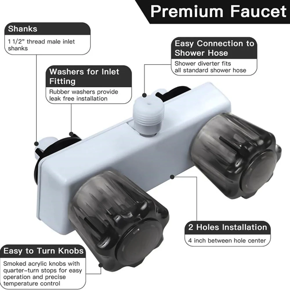 Product Description Features: Premium Construction: Constructed of sturdy smoked crystal acrylic knob, fully functional diverter and premium lightweight synthetic waterways. The classic style for rv camper shower faucet is easy to match most for rv bathroom and easy to clean. Easy Operation: The dual knobs faucet are easy to turn and work smoothly which provide precise temperature control and aerated water pressure. Easy Installation: Easy to change the old one with the new for rv shower faucet. Compact design is great for small for RV shower, no more worries about that accidentally turn on the valve due to large handles. Specifications: Condition: New Type: Classic Material: Plastic Color: White+Black Handle Location: Left Fitment: Suit for RV/ camper/ motorhome/trailer/boat. It is a shower valve diverter forIndoor bathroom shower faucet.Indoor or outdoor shower faucet. Note: 1. The real color of the item may be slightly different from the pictures shown on website caused by many factors such as brightness of your monitor and light brightness. 2. Please allow slight manual measurement deviation for the data. Packaging Includes: 1 x 4" RV Camper Shower Faucet Shipping Returns Contact Us Payment 1. Items sent from US warehouse. 2. Receiving time = Processing time + Shipping time. 3. Processing Time: Around 1-2 business Days. 4. Shipping Time: 3-5 business day. It may have a little delay during some holiday (such as Christmas), any problem, please feel free to contact. Always believe we can figure things out with communication, if it comes to return, the pacakge must be intact and the same as you receive. If you have any questions, please feel free to email our service specialists 24 Hours a Day, 7 Days a Week. We will reply you ASAP. Return/refund is accepted within 30 days after the buyer receives the item. NO exchange will be accepted after 30 days from the date when the item is received. Please contact us first before returning your product!!! If you have any questions, our Customer Service staffs welcome you to email us. We strive to answer all questions and resolve any problems as quickly as possible. We care about our valued customers, and will always try to help you. So if you have any problems, You can contact us 7*24, we will reply at the first time. We accept all verified payments from ebay. Orders will be shipped after receiving cleared payment. Shipping 1. Items sent from US warehouse. 2. Receiving time = Processing time + Shipping time. 3. Processing Time: Around 1-2 business Days. 4. Shipping Time: 3-5 business day. It may have a little delay during some holiday (such as Christmas), any problem, please feel free to contact. Returns Always believe we can figure things out with communication, if it comes to return, the pacakge must be intact and the same as you receive. If you have any questions, please feel free to email our service specialists 24 Hours a Day, 7 Days a Week. We will reply you ASAP. Return/refund is accepted within 30 days after the buyer receives the item. NO exchange will be accepted after 30 days from the date when the item is received. Please contact us first before returning your product!!! Contact Us If you have any questions, our Customer Service staffs welcome you to email us. We strive to answer all questions and resolve any problems as quickly as possible. We care about our valued customers, and will always try to help you. So if you have any problems, You can contact us 7*24, we will reply at the first time. Payment We accept all verified payments from ebay. Orders will be shipped after receiving cleared payment. Steering Wheel Short Hub Adapter Lightweight Durable For Jeep Wrangler 1986-1995 35.14 USD 36.99 USD 19.99 USD 5% off MOST Fiber Optic Optical Loop Bypass Male&Female Kit Adapterr For Audi BMW BENZ 13.29 USD 13.99 USD 19.99 USD 5% off 4pcs Olympic White Door Handles Fit For Chevrolet Suburban 2500 2007-2013 37.99 USD 39.99 USD 19.99 USD 5% off Car Radio Stereo Hidden Antenna Stealth FM AM For Vehicle Truck Motorcycle Boat 11.39 USD 11.99 USD 19.99 USD 5% off Waterproof Motorcycle Mobike Front Chrome Handlebar Mount Thermometer Luminous D 13.29 USD 13.99 USD 19.99 USD 5% off Auto Air Cleaner Box Housing Repair Part For Toyota Corolla SE 2.0L 2019-2022 44.64 USD 46.99 USD 19.99 USD 5% off Bluetooth Car Adapter Module 2RCA AUX Input for Music Streaming from Phone 11.39 USD 19.99 USD Replace Speed Sensor Kit For ADC Motor Style Club Car DS/IQ/Precedent Golf Carts 16.14 USD 16.99 USD 19.99 USD 5% off Center Console Wireless Charging Tray New Fit For Toyota Tundra 2014-2021 64.59 USD 67.99 USD 19.99 USD 5% off Replacement Rear Manual Sliding Back Window Glass Latch Durable High Quality 14.24 USD 14.99 USD 19.99 USD 5% off 8pcs Fuel Injectors For Ford Crown Victoria 4.6L V8 1992-1998 F0TED5B 0280150556 37.04 USD 38.99 USD 19.99 USD 5% off Upgraded Car Solenoid Boost Control Valve For Polaris RZR TURBO S/S4 4011285 59.84 USD 62.99 USD 19.99 USD 5% off 1Pcs Left Door Hinge LH 55256915AG Replacement For DODGE DURANGO 2000-2009 50.34 USD 52.99 USD 19.99 USD 5% off New Car Center Console Lid Armrest PU Leather Cover For Lexus LS430 2001-2003 18.04 USD 18.99 USD 19.99 USD 5% off Left & Right Parking Brake Actuator For Ford Edge Fusion Escape DG9C2B713AB 56.99 USD 59.99 USD 19.99 USD 5% off Female AUX Auxiliary Audio Input Kit Adapter Cable For BMW E60/61/65/66/81/83/87 11.2 USD 11.79 USD 19.99 USD 5% off 2pcs Xenon Ballast Igniter HID D2S Bulb Kit For Infiniti JX35 QX60 2012-2015 66.49 USD 69.99 USD 19.99 USD 5% off Blue Aluminum Car Battery Hold Down Tie Down Mount Bracket with Hook Bolt Kits. 15.57 USD 16.39 USD 19.99 USD 5% off Replacement Front Bumper Grille Wire Harness Fit for Ford Fusion 2013-2016 31.34 USD 32.99 USD 19.99 USD 5% off 6L80 Transmission Control Module TCM For GM For Cadillac For Chevy 24239647 161.49 USD 169.99 USD 19.99 USD 5% off Car Charge Pipe C Clip With O Ring Seal Gasket For BMW E92 E93 335i E60 535i 12.82 USD 13.49 USD 19.9