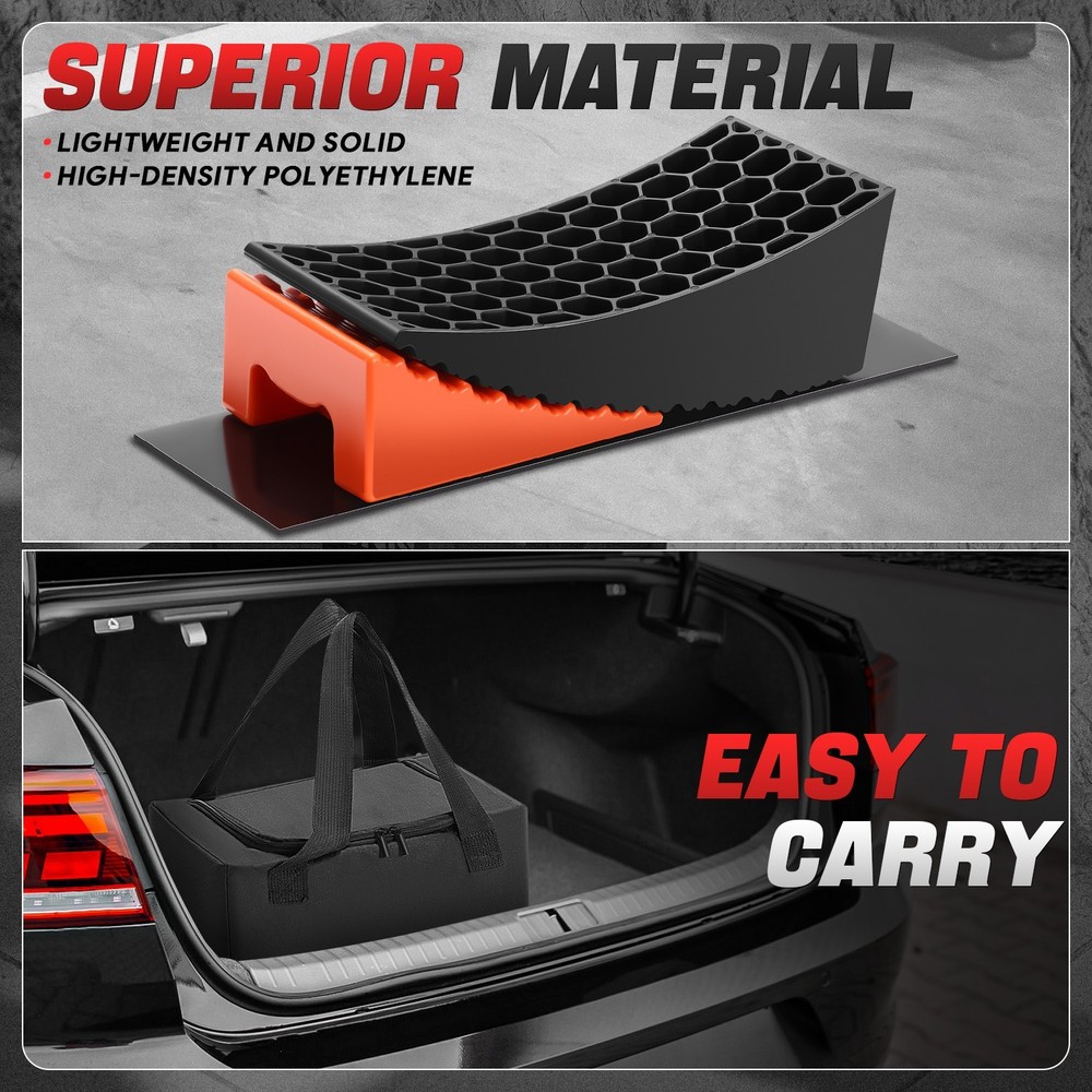 These leveling ramps are a game-changer for RV trips! Super sturdy and easy to use, they hold weight like a champ while the non-slip design keeps everything secure. The included mats and chock add extra stability, and the carry bag makes storage a breeze. Perfect for quick, hassle-free leveling—highly recommend for smoother camping adventures!