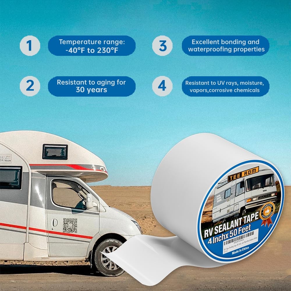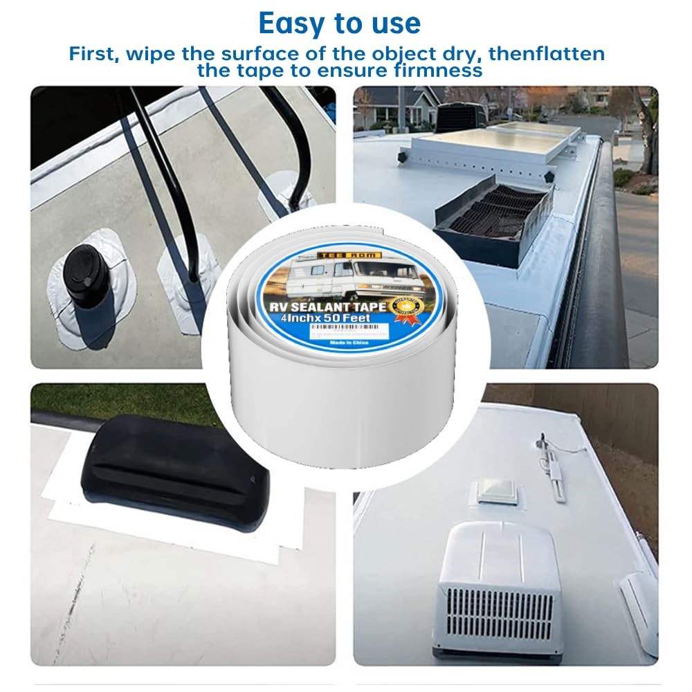 Made of high-quality butyl, this tape can resist leaks from bad weather such as rain, snow, wind, etc., protecting your RV from leaks. The waterproof strong tape can resist UV rays, moisture, steam, corrosive chemicals and other leaks, protecting your RV from extreme weather. It is widely used for sealing RV, roof, windows, doors, wooden furniture, metal, water pipes, motor homes, trailers, fifth wheels, airstreams, trucks, buses and more. High-quality butyl sealing tape: 4 inches wide and 50 feet long. It is windproof, rainproof, UV-resistant, and can be used in multiple scenarios. Easy to install: The characteristics of super strong adhesion and flexibility enable you to install it on most surfaces, preferably on flat, curved or corner surfaces. RV waterproof sealant: It is elastic, breathable and will not shrink, and can form a strong seal with the edge of the roof and vents to prevent leaks Tape: Made of high-quality butyl, it can resist leaks in severe weather such as rain, snow, wind, etc., protecting your RV from leaks. Mobile RV repair: Designed and manufactured for your RV repair, it can easily repair roofs, windows and doors to prevent leaks, and can also be applied to other roofs, metal buildings, trailers, drain pans, drain pipes, boats, etc.