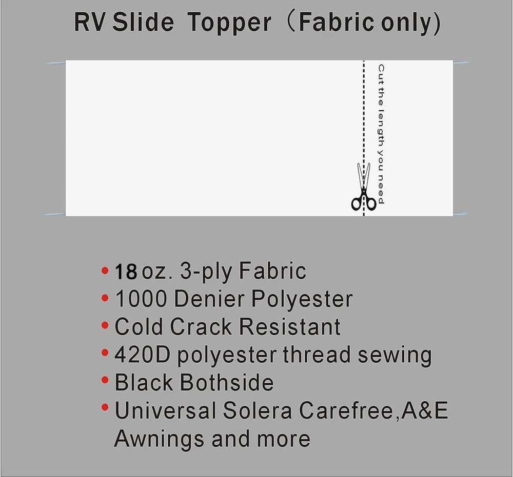 Welcome to My Stores, Happy Shopping. RV Slide Out Awning Fabric Replacement-46" x 170", White- Fabric only About This Item CAMPER SLIDETOPPER:You can replace your old or broken travel trailer awning by yourself. Getting a high quality fabric and it's much cheaper than going to the RV shop to replace it. You will be sitisfied with this slide out awning replacement. HIGH QUALITY AWNING:Dulepax uses heavy duty 18Oz- 3 ply premium-grade vinyl fabric that resists UV and waterproof. This type of fabric receibes a Special treatment to provide crack resistance down -30 degrees. It can fit all the weather conditions in the United States. SIZE AND COLOUR:Dulepax offers a 46'' wide and length available (110'',140'',170'',200'',250 ''300''). Customers can cut it to any size that fits your RV Slide awning.Some Length can be cut to fit 2-12 Slide out awnings. White and Black colors available. INSTALLING :Dulepax's Universal slide awning replacement Fabric is sewn with two polycords. One polycord slide into the RV body canopy rolltube slot. The another polycord slide into the extended canopy slot. All installations require no special tools and are easy to install. RENEW YOUR SLIDE OUT AWNING:Slide out awning is necessary accessories to protect your slide out system.Our universal fabric fits most RV Awning Brands,Such as Dometic (A&E), Carefree, Lippert, Fiamma, Solera, etc. Specifications Material Vinyl Color White Size 170inch Fabric Only Item Weight 18 Ounces Shipping Tracking number: Available We use a selection of shipping services such as UPS, FedEx, USPS etc. We only ship to the lower 48 states, no APO/FPO addresses or PO Boxes allowed. Local pickups and combined shipping options are not provided at this time. Contact us We can be contacted at any time through eBay messages if you have any questions, comments or product requests. We will respond to you within 24 hours and do our best to help you out! We encourage our customers to contact us with any questions or concerns! We'd like to be sure you are completely satisfied with your purchase.
