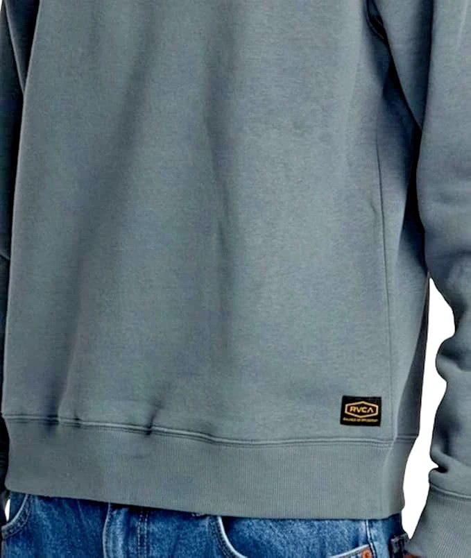 The RVCA Men's Relaxed Fit Fleece Crewneck in Balsam Green is a stylish and comfortable sweatshirt perfect for everyday wear. Made from a blend of 80% cotton and 20% polyester, this pullover features a classic crew neckline and long sleeves, making it easy to care for with machine washable fabric. The relaxed fit and logo accents add a touch of sporty flair, making it a versatile option for various activities such as walking. With its solid color and quality construction, this RVCA sweatshirt is a must-have for any man's wardrobe. Fit: Relaxed fit. Neck: Crew neck. Sleeves: Long sleeve. Closure:Pullover closure. Ribbed cuff, collar and hem.