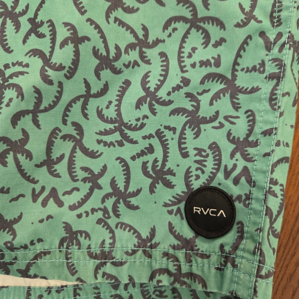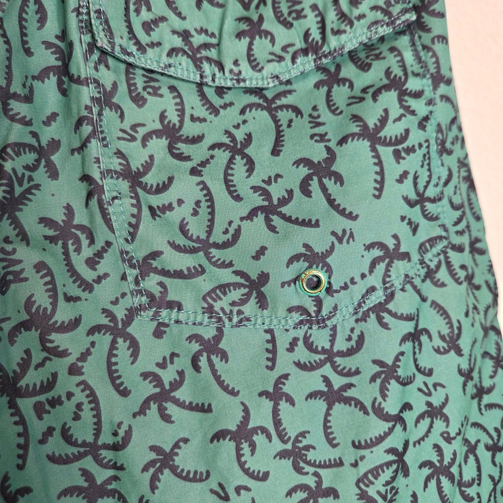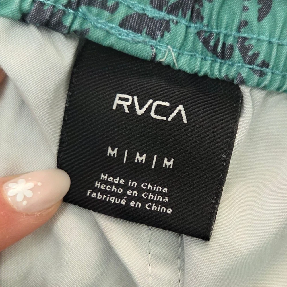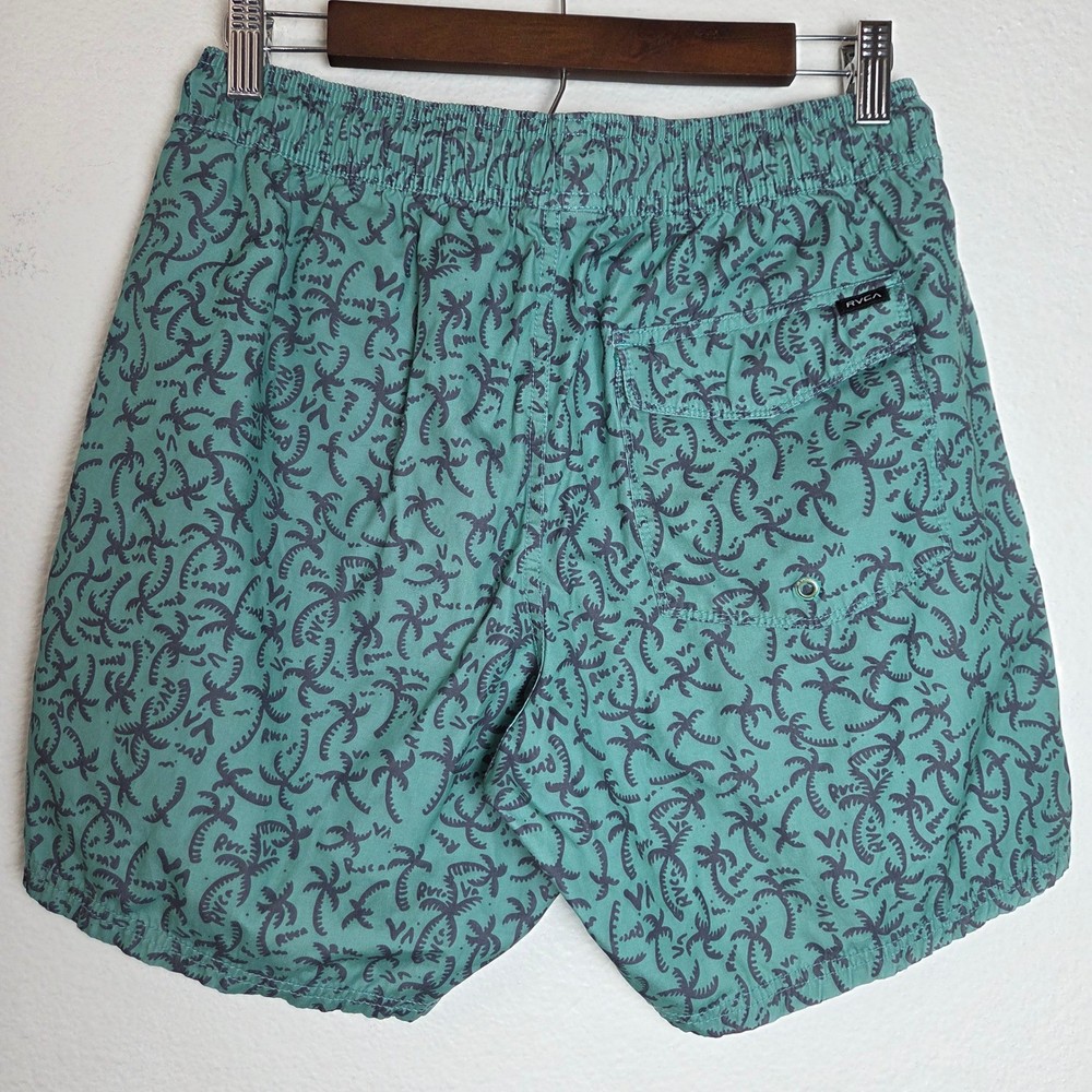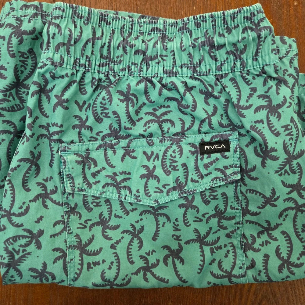 RVCA Palm Tree Print Board Shorts Elastic Waist Drawstring Swim Trunks board shorts Quick Dry Mens Medium Green palm tree print board shorts Drawstring, elastic waist Good preowned condition. The metal grommets have some paint that has come off, does not effect the wearability of this item. Please see photos Smoke free home