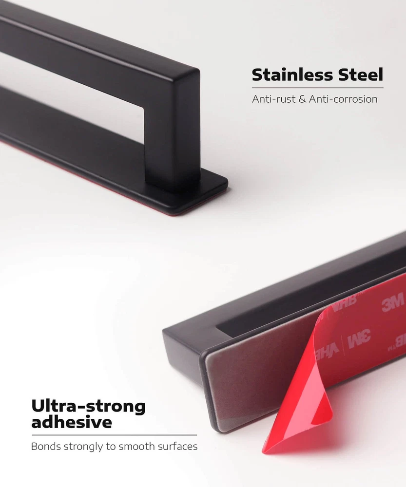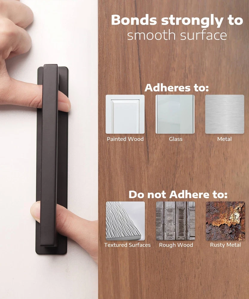 EASY TO INSTALL - Our self stick cabinet handles require no drilling and no tools, simply peel off the red backing from the adhesive cabinet pulls and adhere it to the surface of the furniture with firm pressure STRONG ADHESION - The bottom of the stick on cabinet handles is made of high tech heavy duty double sided tape for superior adhesion and durability, which is unmatched by other self-adhesive handles that use ordinary double sided tape ALL METAL MATERIALS - Adhesive door handles are made of high quality stainless steel with excellent rust resistance and comfortable grip, in a classic matte black finish, simple, modern and elegant style to complement your furniture WIDE APPLICATION - These no drill cabinet handles work great on kitchen cabinet, drawers, glass sliding doors, shower door, closet door, pocket door and just about anything that can open RISK-FREE 12 MONTH TRIAL - We are so confident in the quality and durability of these black drawer pulls that we offer a 12-month free return policy, so buy with confidence