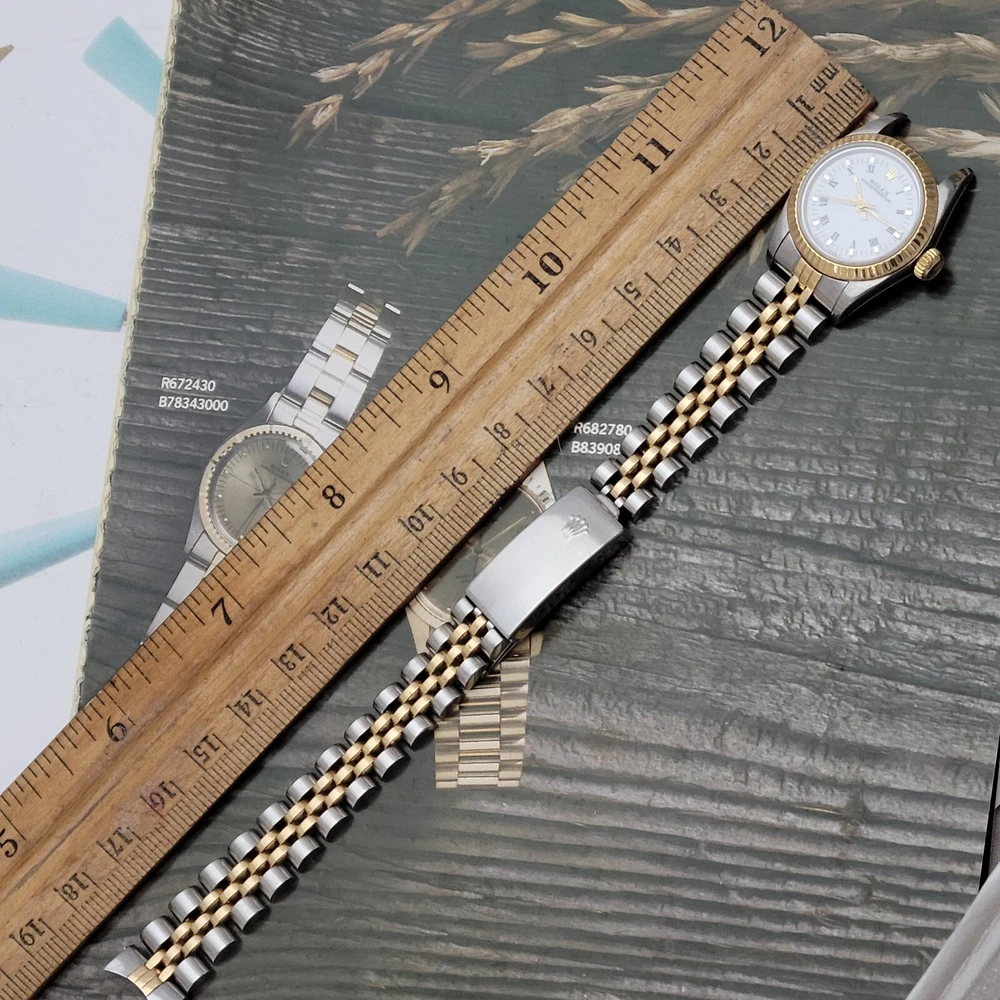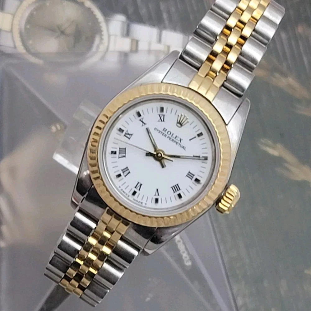 Presented here in true auction format starting at only one penny is this magnificent ladies automatic 18 karat gold and stainless steel 100% original Rolex oyster perpetual. This beauty has just been fully serviced and comes with a 3-month service warranty for your added satisfaction and convenience! This Rolex Oyster Perpetual model 67193, a timeless Swiss masterpiece that seamlessly blends luxury and functionality. Her quality is unsurpassed, crafted with a harmonious combination of18k yellow gold and stainless steel, embodying both elegance and durability. You're going to love the 100% original brilliant white dial set with the midnight black Roman numerals that accurately indicate the passing time, beneath the sapphire crystal, to the gorgeous solid 18k gold hands. Each of the hour markers are raised above the dialed surface and solid 18 karat gold. Key Features: Case and Bracelet: The 24mm stainless steel oyster case is complemented by an 18k yellow gold fluted bezel and a matching two-tone solid 18k & steel bracelet. The original Rolex logo 18 karat gold screw down crown completes the instantly recognizable Rolex two-tone look ensuring a sophistication and style that stands out in any setting. Movement: Swiss quality reliability is the key feature of the fully automatic Rolexs renowned automatic self-winding oyster perpetual movement. This watch guarantees precision and reliability, certified as a chronometer and has just been fully serviced by a master watchmaker, coming with a 3-month service warranty. Dial: The white dial, adorned with elegant Roman numeral hour markers and gold hands, offers a classic yet striking appearance suitable for every event in your life from a day in the office, a night on the town or a weekend at the beach.The scratch-resistant sapphire crystal ensures the dial remains pristine over time. Crown: The 18k yellow gold crown, featuring the iconic Rolex logo, adds a touch of luxury and ensures easy time-setting. To set the time, rotate the crown counterclockwise unscrewing it from the body of the watch. This will put you in the winding position should you need to wind her. To set the time, pull the crown outwards to the time setting position. This Rolex Oyster Perpetual is not just a watch; its a statement of elegance and sophistication. Whether youre attending a formal event or enjoying a casual day out, this timepiece will elevate your style and leave a lasting impression. Indulge in the luxury of Rolex and experience the perfect blend of tradition and innovation with the Oyster Perpetual. Somebody is going to be very pleased when they place the winning bid. Check out all the pictures of this watch that truly do not do her Justice! Good luck to you all! ___________________________________ Take a few minutes and read some of the tens of thousands of positive feedback that we have received from our users here at Decowatches and our sister site Decowatchesparts and you will understand why buying a watch from us is an enjoyable and safe experience! Our shipping fee ensures that this watch is carefully packaged, fully insured, has door to door tracking and comes with a three-month service warranty for your added piece of mind satisfaction and convenience! We are pleased to say that we are now shipping twice a week, either Wednesday or Thursday and Saturdays. Thank you for viewing this gorgeous ladies Rolex and good luck to you all! Emerson