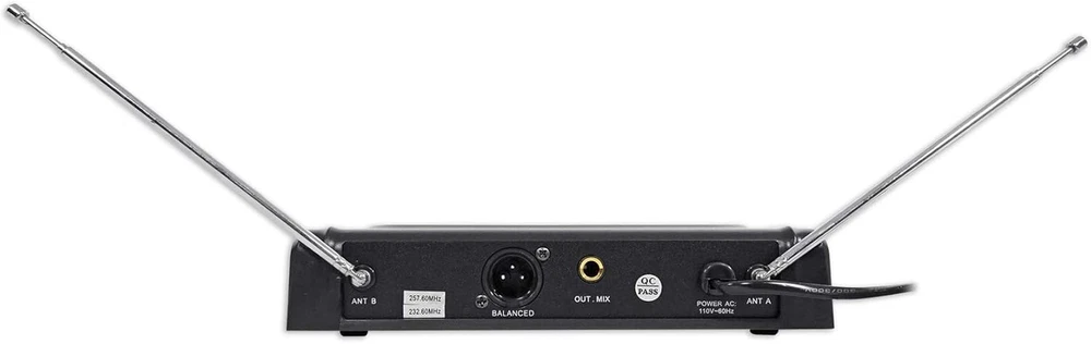 Rockville RWM1203VH VHF Dual Channel Handheld Wireless Microphone System. Large display on receiver + digital display on each mic. Each mic is large and solid with a nice weighted feel. Improved high performance wireless handheld microphone capsule. Includes transmitter with two handheld, high sensitivity, unidirectional, wireless cardioid microphones. Featuring a dual filter design to limit feedback and interference. Ultra signal stability eliminates unwanted distortion. Transmitter automatically links to receiver for ease of use. Use two handheld mics at once. Individual microphone volume controls. Low power consumption for longer battery life. System comes in 4 different frequency options. You can request a specific one in the notes, A. 255. 1/227. 1 MHZ , B. 224. 9/256. 9 MHZ, C. 228. 9/253. 4 MHZ, D. 230. 8/255. 8 MHZ Operating Range: 150 feet or more. Channel: Two Channel. Frequency Range: 210MHz - 270MHz. Frequency Response: 40Hz-18KHz. S/N. : >103dB (1KHz-A). Operating Temp: 14° F 122° F. Oscillation Mode: Quartz Crystal. Frequency Stability: ± 0. 005%. Modulation Mode: VHF. Harmonic Radiation : < 63dBm. RF Output Power: 10mW. Power Voltage: AC110V- 60Hz. Mic Battery: AA x 2. Sensitivity: (S/N=30dB) >2mV. Audio Output Impedance: 600Ω . Audio Output Level. : 0-0. 5V. Power Supply: AC110V 60Hz. Current Consumption: ≤ 50mA. Audio Out Connector: 1/4" unbalanced. Transmitter: Frequency Stability: ± 0. 005%. RF Output Power: ≤ 10mW. Modulation Mode: VHF. Maximum Deviation Range: ± 50KHz. Microphone Mode: Fixed. Power Supply: AA/1. 5V× 2. Current Consumption: ≤ 35mA. Includes: 2 wireless handheld microphones 1 receiver unit User manual Batteries Transfer Cable Features: Rockville RWM1203VH VHF Dual Channel Handheld Wireless Microphone System Large display on receiver + digital display on each mic Each mic is large and solid with a nice weighted feel Improved high performance wireless handheld microphone capsule Includes transmitter with two handheld, high sensitivity, unidirectional, wireless cardioid microphones Featuring a dual filter design to limit feedback and interference Ultra signal stability eliminates unwanted distortion Transmitter automatically links to receiver for ease of use Use two handheld mics at once Individual microphone volume controls Low power consumption for longer battery life System comes in 4 different frequency options. You can request a specific one in the notes A. 255. 1/227. 1 MHZ B. 224. 9/256. 9 MHZ C. 228. 9/253. 4 MHZ D. 230. 8/255. 8 MHZ Specifications: System: Operating Range: 150 feet or more Channel: Two Channel Frequency Range: 210MHz - 270MHz Frequency Response: 40Hz-18KHz S/N. : >103dB (1KHz-A) Operating Temp: 14 DegreeF - 122 DegreeF Oscillation Mode: Quartz Crystal Frequency Stability: ± 0. 005% Modulation Mode: VHF Harmonic Radiation : 2mV Audio Output Impedance: 600Ω Audio Output Level. : 0-0. 5V Power Supply: AC110V 60Hz Current Consumption: ≤ 50mA Audio Out Connector: 1/4˝ unbalanced Transmitter: Frequency Stability: ± 0. 005% RF Output Power: ≤ 10mW Modulation Mode: VHF Maximum Deviation Range: ± 50KHz Microphone Mode: Fixed Power Supply: AA/1. 5V× 2 Current Consumption: ≤ 35mA
