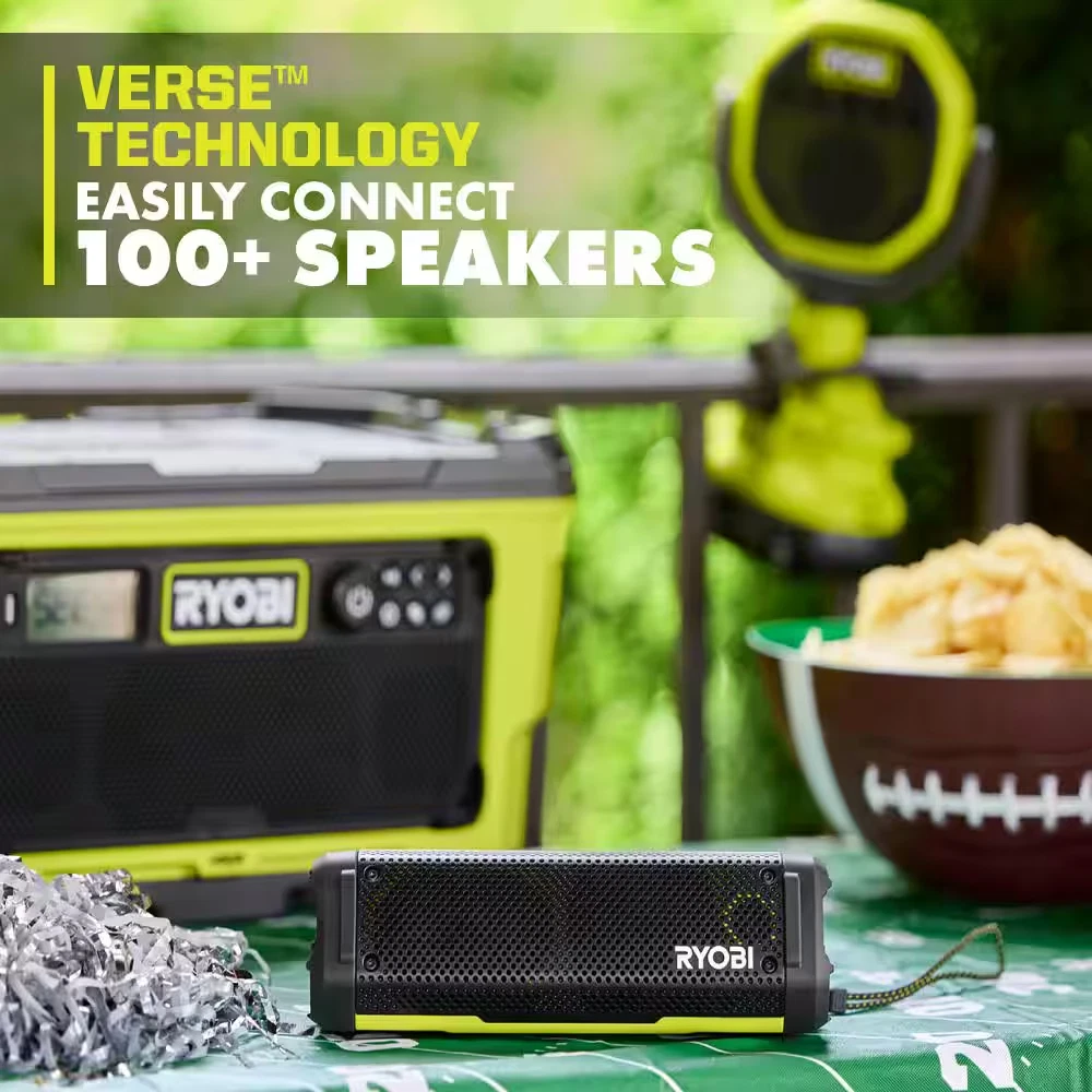Premium Sound Quality And VERSE Multi-Speaker Connectivity IP67 Dust And Waterproof Built To Withstand All Conditions Powered By The RYOBI USB Lithium Battery System The RYOBI USB Lithium VERSE Compact Speaker Kit is the perfect blend of portability and premium sound. The powerful speaker and tweeter create studio-quality sound, anywhere you go. The IP67 dustproof and waterproof rating ensures this speaker is a reliable solution built to withstand all conditions. Listen to what you want, where you want, with up to 250’ of BLUETOOTH range. Utilize this speaker independently or use VERSE technology to connect additional speakers for even greater sound, no app required. Quickly & easily connect 100+ RYOBI VERSE speakers with up to 125' of speaker to speaker connection range. Stay powered with up to 6 hours of runtime. Use the speaker’s on-board USB-C charging port for unlimited runtime or swap batteries and charge them remotely with the included USB cable. The included USB Lithium 2Ah battery features a USB-C port that also charges mobile devices, and a LED fuel gauge that clearly indicates the battery level status with the press of a button, eliminating guess work. The product also features an LED indicator to signal when the battery is charged (green) or has low battery (red) while in-use. Best of all, it is part of the RYOBI USB Lithium System of tools that provides compact, rechargeable, everyday solutions for cordless power and productivity. The USB Lithium VERSE Compact Speaker Kit is backed by the RYOBI 2-year manufacturer's warranty and includes a USB Lithium 2Ah Lithium Battery, USB Cable, Lanyard and Operator's Manual. Powerful speaker and tweeter for premium and dynamic sound Take this speaker anywhere with IP67 dustproof and waterproof rating Amplify your experience seamlessly by connecting 100+ RYOBI VERSE products without the use of an app (USB Lithium Compact Speaker, 18V ONE+ Clamp Speaker and 18V ONE+ LINK Stereo) Stay connected with up to 250’ of BLUETOOTH streaming range and up to 125’ to VERSE secondary speaker Up to 6 hours of runtime (With included 2Ah battery) Recharge USB Lithium Batteries while you listen with the on-board USB-C port providing unlimited runtime On-board LED indicators signal battery and connection status The included USB Lithium 2Ah battery features a USB-C port that also charges mobile devices LED fuel gauge on the battery indicates battery level status with the press of a button The RYOBI USB Lithium Battery System: Everyday Solutions. Rechargeable Power. 2-year manufacturer’s warranty Includes: FVA51 USB Lithium VERSE Compact Speaker, USB Lithium 2Ah Lithium Battery, USB Cable, Lanyard, and Operator's Manual