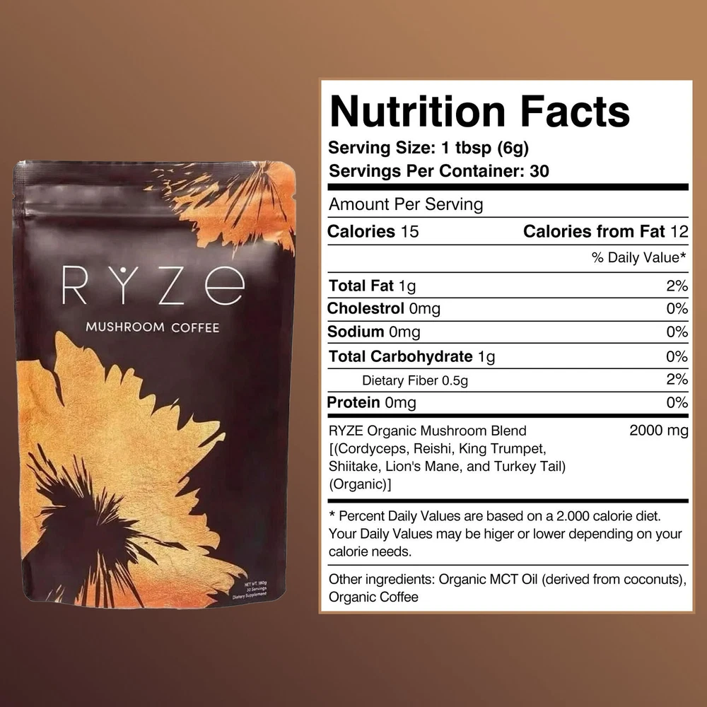 Effects: Digestive Health, Stress Relief,Focus&Immune Support Ingredients: Chaga, Cordyceps, Hericium erinaceus, Ganoderma lucidum, MCT Oil Directions: Brew with hot water and take 2 servings daily. Shipping: Ships within 48 hours on working days. Description: NATURAL ENERGY BOOST: Made from organic chaga and lion's mane mushrooms, this coffee provides a smooth energy lift without the crash or jitters of traditional coffee. DELICIOUS FLAVORS: Notes of cocoa and caramel complement the earthy mushroom flavor in each cup for a truly unique taste experience. INGREDIENTS: RYZE Organic Mushroom Blend (Cordyceps, Lion's Mane, Reishi, Shiitake), Organic Arabica Coffee, Organic MCT Oil, Organic Coconut Milk. Adaptogens in the mushrooms help support immunity, focus, and stress response for an all-day wellness boost. SIMPLE BREWING: Just add a tablespoon of powder to hot water and enjoy! No fuss required for this healthy coffee alternative. ENHANCED MENTAL CLARITY & FOCUS: Infused with Lion’s Mane and Chaga mushrooms, known for their cognitive-enhancing properties, to help sharpen your mind and increase focus without the crash associated with regular coffee. Document On Nov 7, 2024 at 09:01:43 PST, seller added the following information: