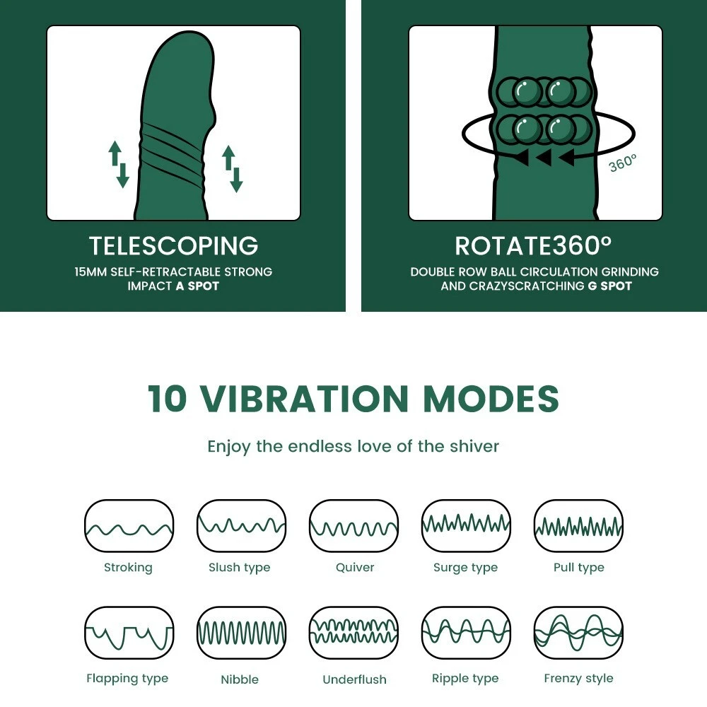 100% new and high quality Life waterproof ,easy to clean, Unique dildo design with 360° rotating beads Pattern: 10 thrusting &vibration &360° rotating modes (3 functions can work alone or together ) Material: Silicone,ABS Size: 8.78in *1.57in Power Supply: USB magnetic charging Charging Time: ≤2h Working Time: ≤ 1h Max Noise: ≤55 db Color: Green Package List: 1 x Vibrator without box 1 x Charger cable 1 x User manual How to Use: ---long press the power button for 3-5 s to turn on/off ---then click to change frequencies Privacy Guaranteed: We will discreet package, unmarked packaging, confidential delivery