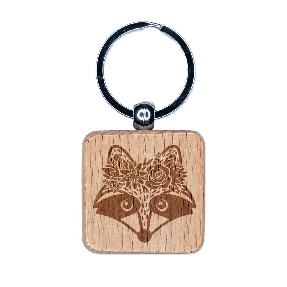 Raccoon Wearing a Flower Crown Engraved Wood Square Keychain Tag Charm