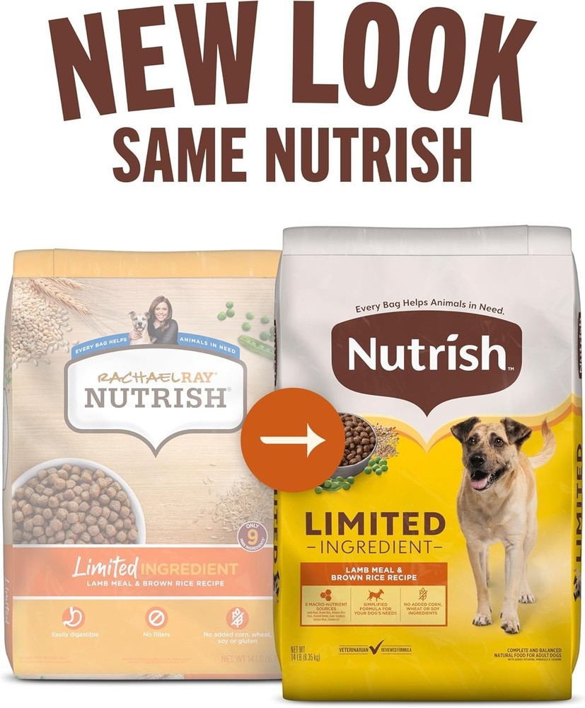 Contains one (1) 6 pound bag of Rachael Ray Nutrish Limited Ingredient Lamb Meal & Brown Rice Recipe dry dog food (packaging design may vary) Only 6 ingredients with added vitamins, minerals, taurine and other nutrients Lamb meal is the number one ingredient No fillers, artificial flavors, colors or artificial preservatives Safely USA cooked with the world's finest ingredients