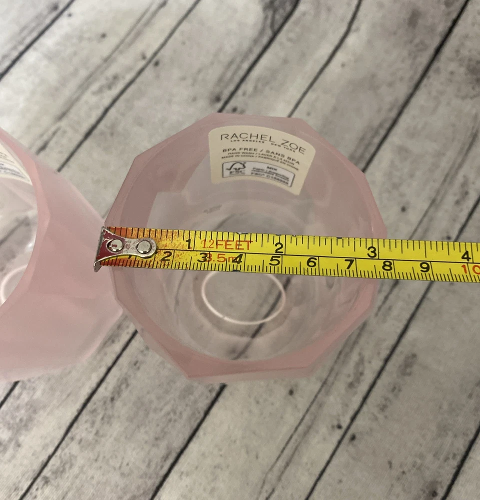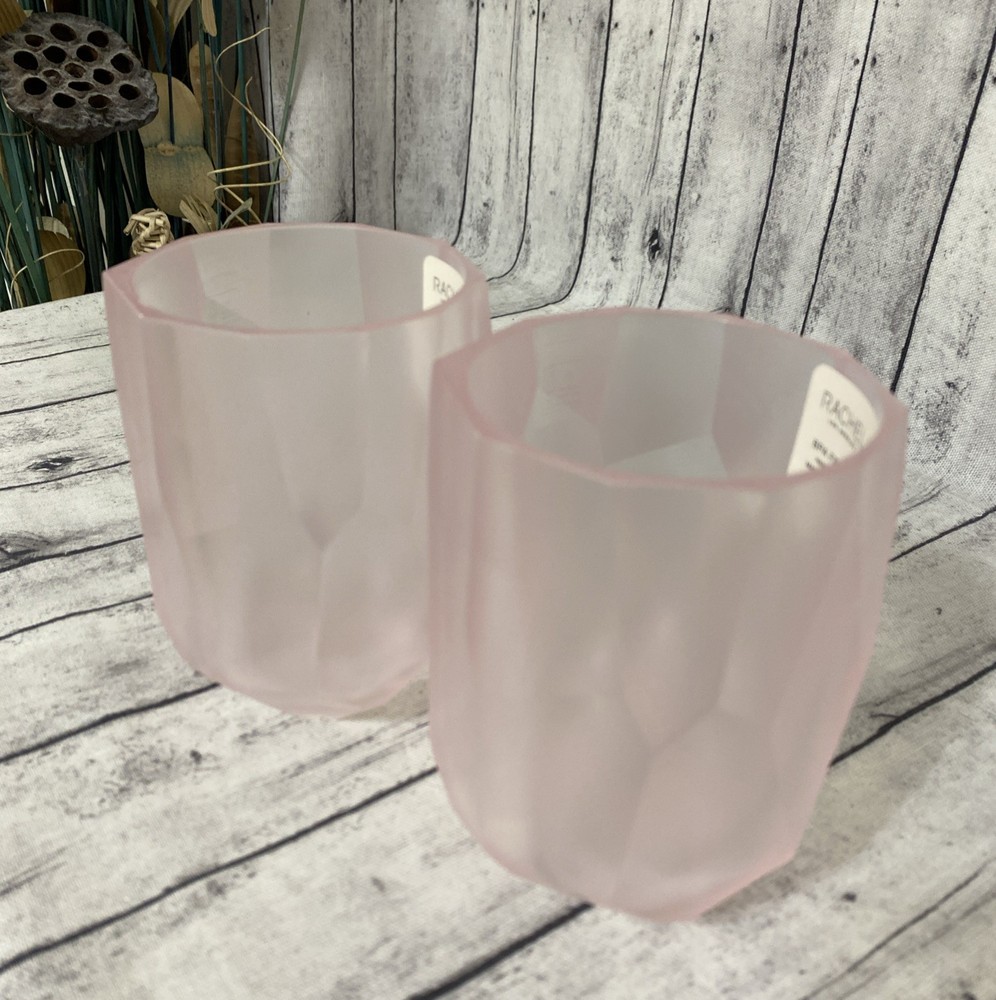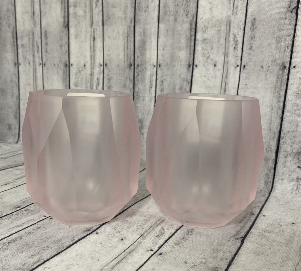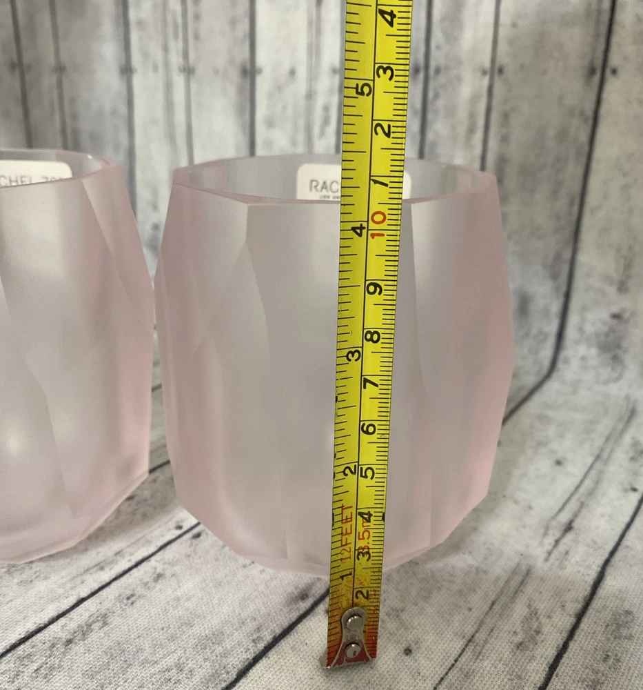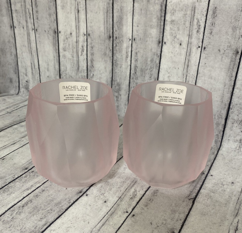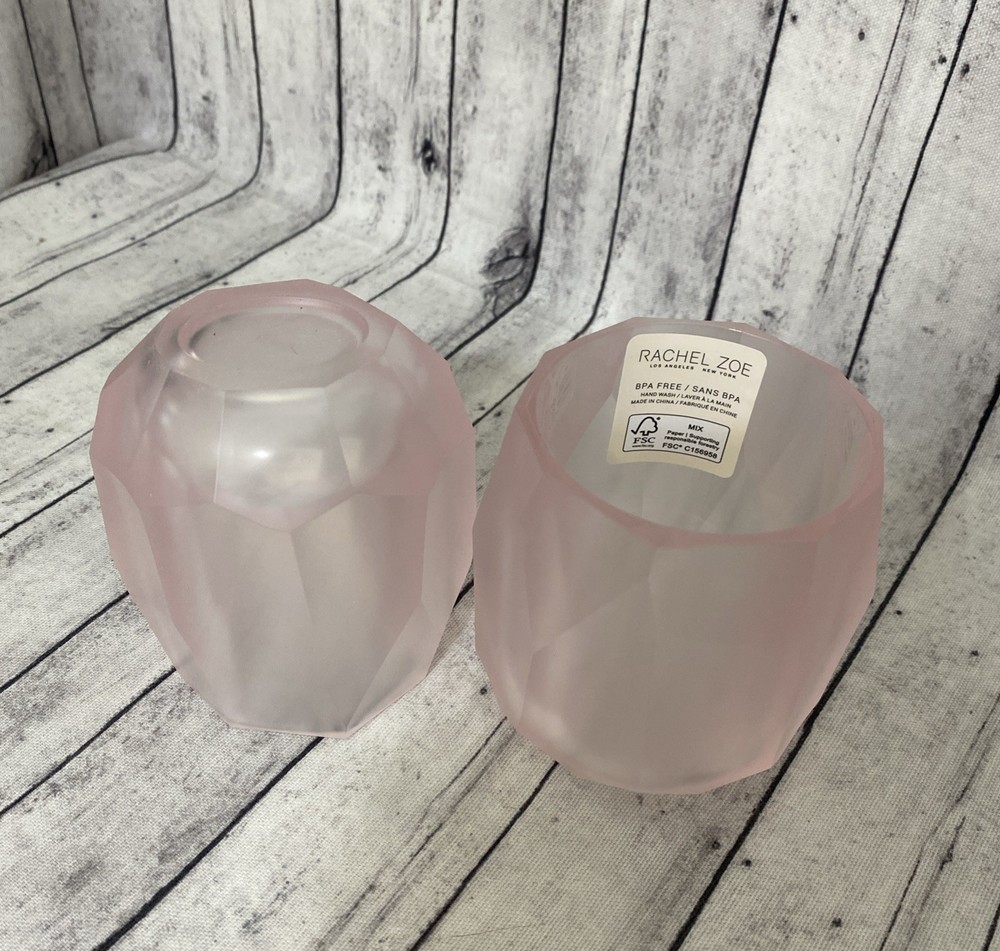 RARE!! Set! Frosted pink! Perfect for Easter! Elevate your drinking experience with this exquisite set of two Rachel Zoe stemless wine glasses. The frosted pink acrylic material is beautifully cut in a diamond pattern, adding a touch of class to your table setting. With a capacity of 16oz and a height of 4 inches, these glasses are perfect for all occasions, whether you're hosting a dinner party or enjoying a glass of wine after a long day. The round design and solid color pattern make them a contemporary addition to any home bar or kitchen. These glasses are perfect for anyone who loves to drink in style! NEW!!