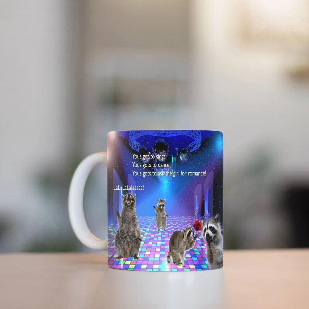 Racoon Disco Party funny coffee mug,11 oz. Brand new, made to order. I handmake these. Image printed on both sides of mug. A fun coffee mug to cheer up your everyday coffee!