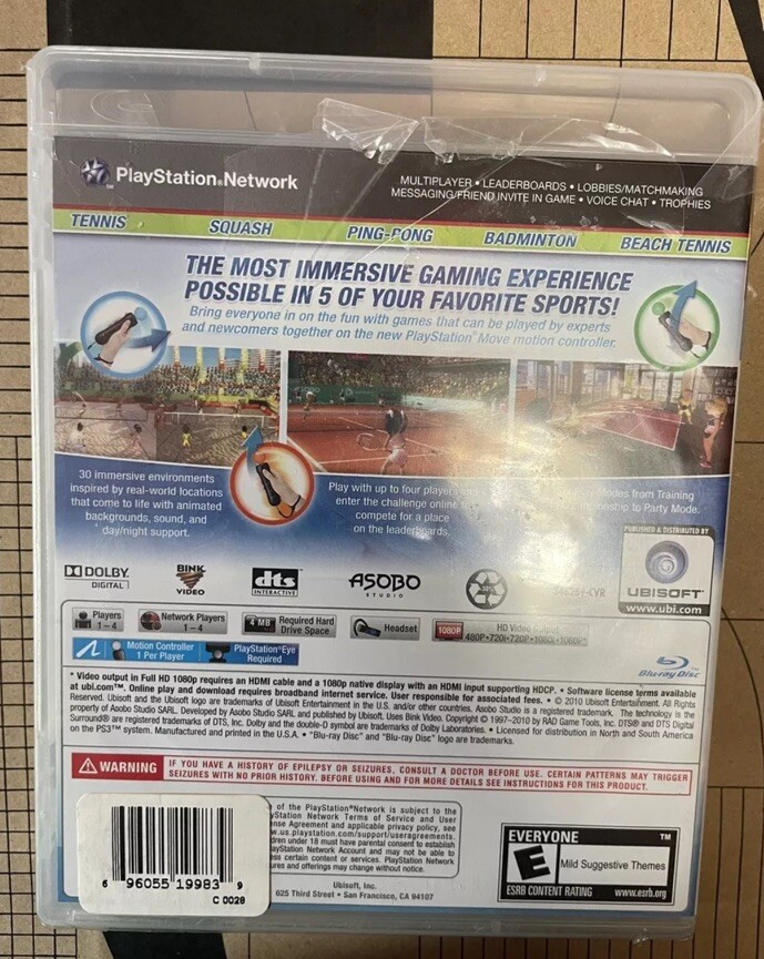 The product is "Racquet Sports (Motion)" for Sony PlayStation 3, published by Ubisoft. It is rated E-Everyone and is brand new, still sealed in its wrapper, although the wrapper may have some tears. Brand New copy but the shrink wrap is torn along the top. Damaged wrapper The game itself is brand new
