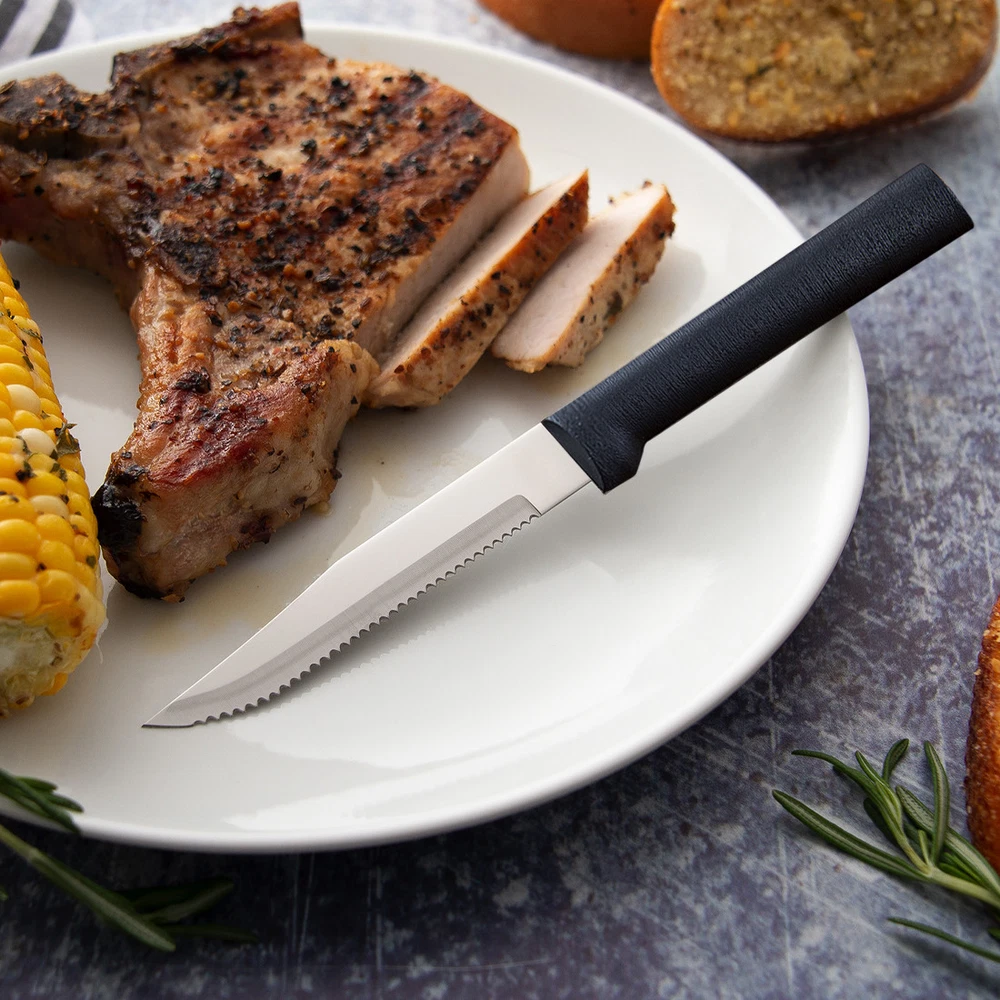 Made in a small town in Iowa, Rada knives are some of the finest on the market. Meticulously crafted one at a time, using a dozen or more steps. Choose between the original solid aluminum handle or the durable black resin handle. Cut pork chops, steaks and roasts quickly and easily. High carbon surgical quality stainless steel blade is hand-sharpened. Blade 3-7/8"L, overall 7-3/4"L. USA made. For best care, hand wash all quality cutlery. Black Resin Handle - A great alternative if you prefer to wash in the dishwasher. Made of durable resin, dishwasher safe. Visit Our Store Contact Us Rada Serrated Steak Knife - Black Resin Handle Made in a small town in Iowa, Rada knives are some of the finest on the market. Meticulously crafted one at a time, using a dozen or more steps. Choose between the original solid aluminum handle or the durable black resin handle. Cut pork chops, steaks and roasts quickly and easily High carbon surgical quality stainless steel blade is hand-sharpened Blade 3-7/8"L, overall 7-3/4"L USA made For best care, hand wash all quality cutlery. Black Resin Handle - A great alternative if you prefer to wash in the dishwasher. Made of durable resin, dishwasher safe.