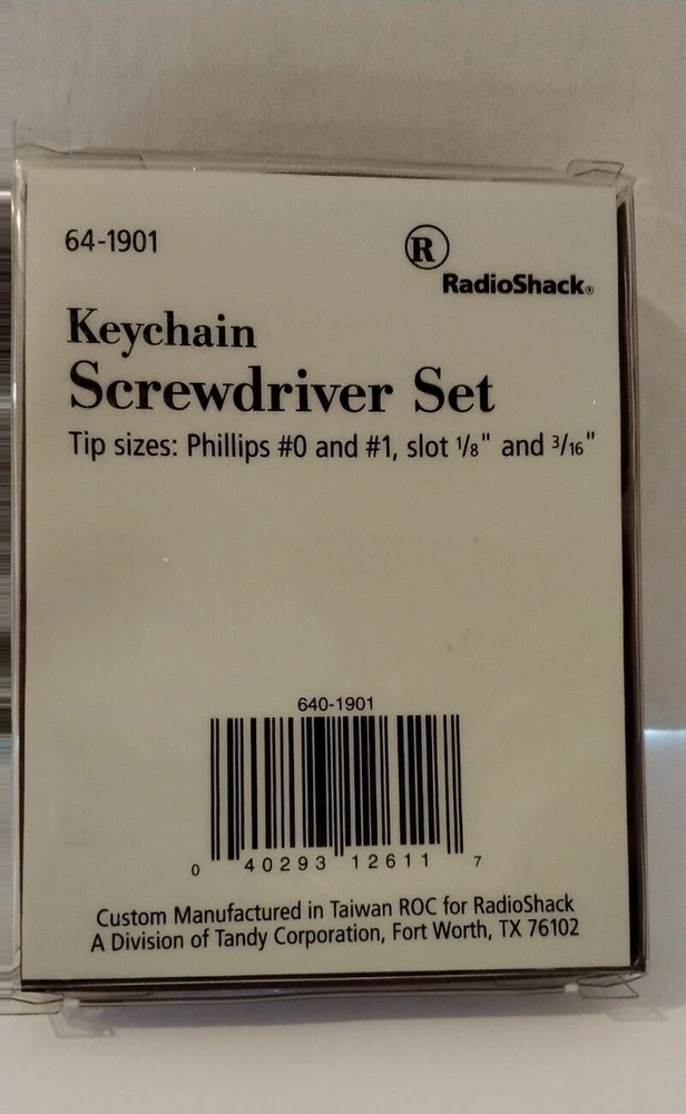 Radio Shack Item# 64-1901 New/Vintage/Collectible Keychain Screwdriver Set Keyring On Chain 4 Tip Sizes: Phillips#0 & #1, Slot 1/8 & 3/16 Color: Black Plastic Case Metal Tips As Seen In Photos From A Smoke Free Home This vintage collectible keyring set from Radio Shack is a must-have for any modern era enthusiast. The black color and plastic & metal material make it a durable accessory to keep your keys organized. The detachable keyring and screwdriver set features make it a versatile tool for everyday use. Perfect for collectors or anyone who appreciates a unique and functional keychain.