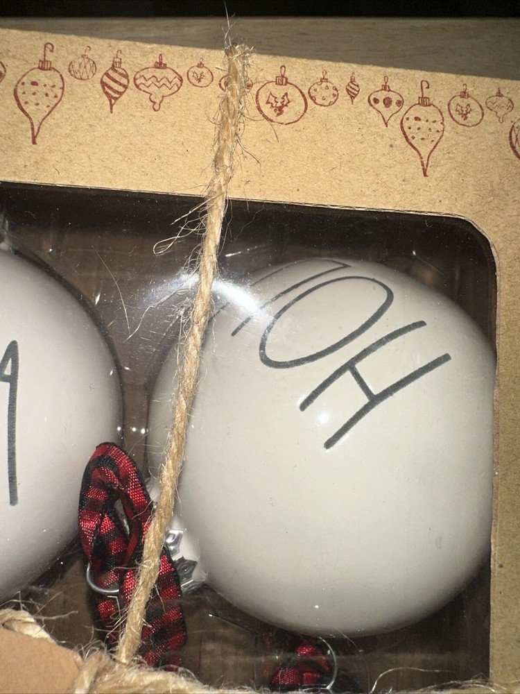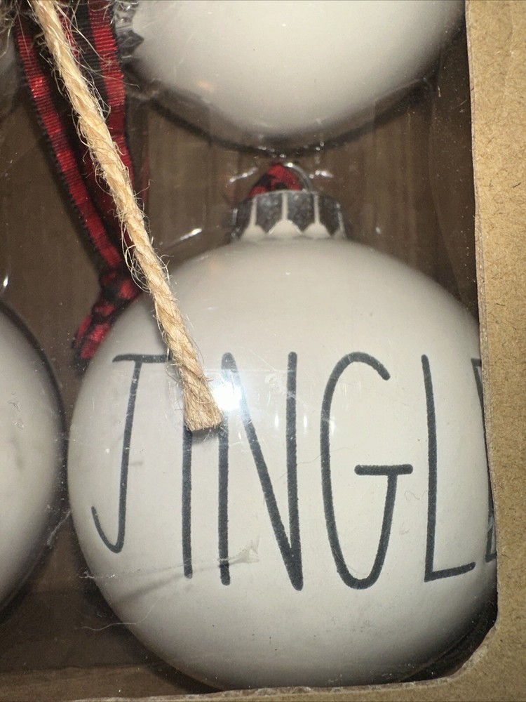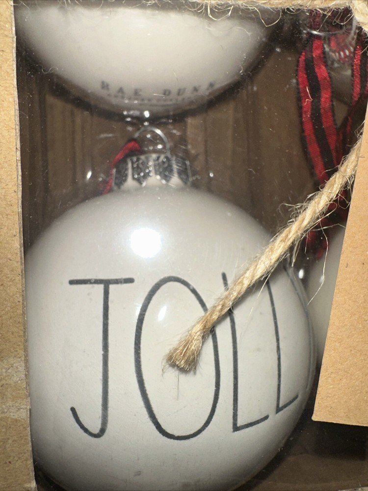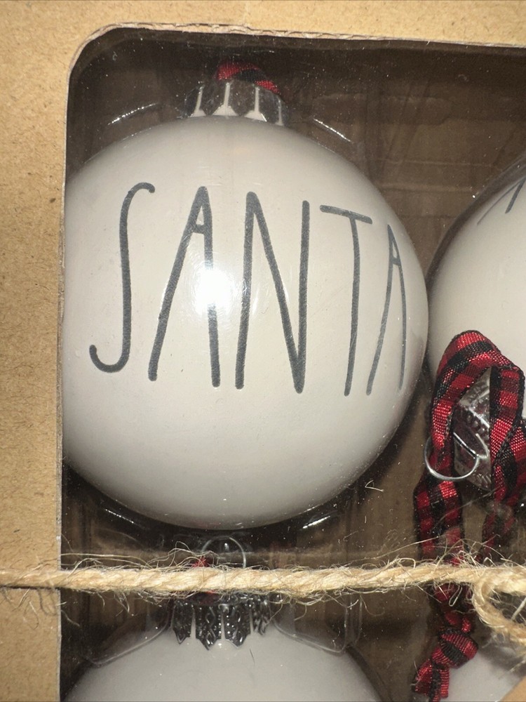 Rae Dunn by Magenta CHRISTMAS ORNAMENTS WHITE BALLS Santa/Holly/Jolly/Jingle New in the box Please see pictures All our products are in a smoke free and pet free home Kindly send me email if you have any questions Thank you for looking :) (BinA)