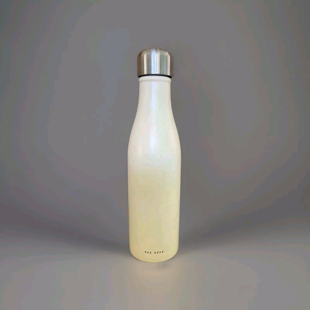This is a Rae Dunn designer water bottle in beige, featuring an insulated stainless steel construction with a screw-on lid. The bottle is BPA-free, phthalate-free, reusable, refillable, and has a vacuum wall for insulation. It also includes a child-resistant cap, is leakproof, and designed to keep beverages cold or hot. The set includes the water bottle, which is not a modified item.