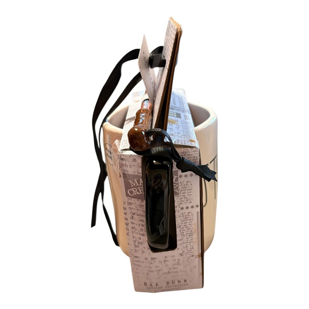 This is a Rae Dunn HARRY POTTER Hogwarts STUPEFY Wand Wizarding World Mug featuring a wand design. It is part of the Harry Potter franchise and belongs to the Wand type within the Fantasy genre. The mug is brand new with tags (BNWT) and would be a collectible item for fans of Harry Potter and the magical world of Hogwarts.