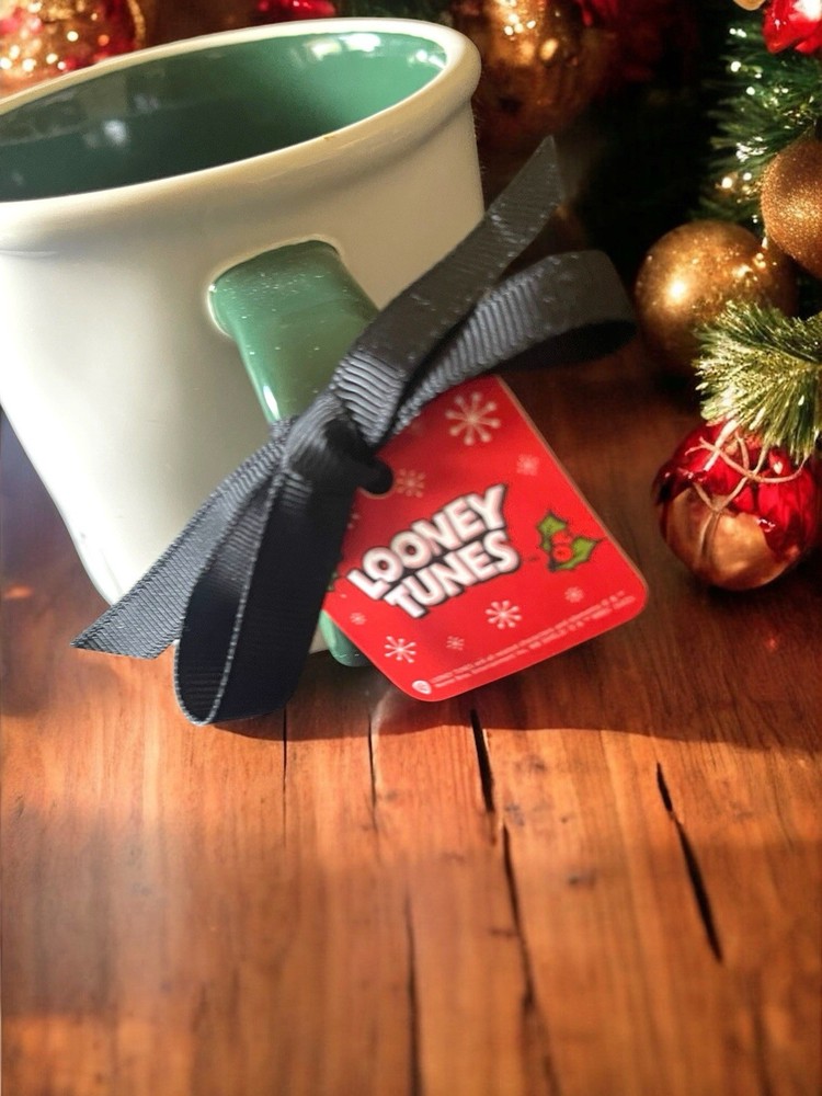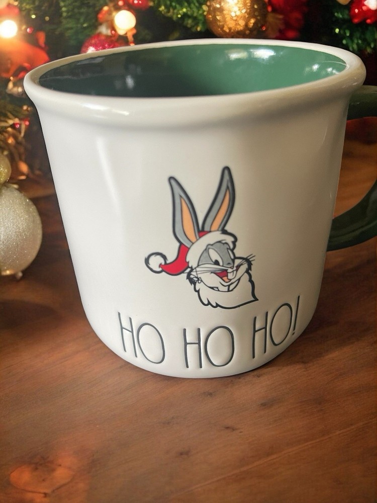 The Rae Dunn LOONEY TUNES Bugs Bunny Ho Ho Ho Coffee Mug is a round, medium-sized ceramic mug featuring an etched design of Bugs Bunny in a festive Ho Ho Ho Christmas theme. This 16 oz mug is both dishwasher and machine washable, making it easy to care for. Perfect for fans of Warner Brothers and Looney Tunes, this contemporary style mug is a unique and collectible piece that can be used for hot or cold beverages. Ideal for all occasions or as a thoughtful Christmas gift, this mug is sure to bring a touch of cartoon and TV character nostalgia to any kitchen or home collection. Brand new 🥰