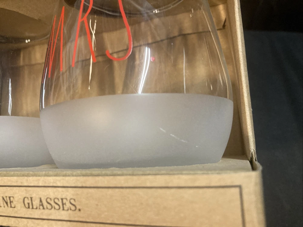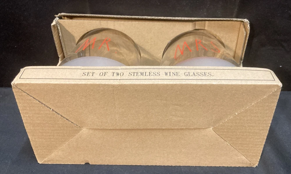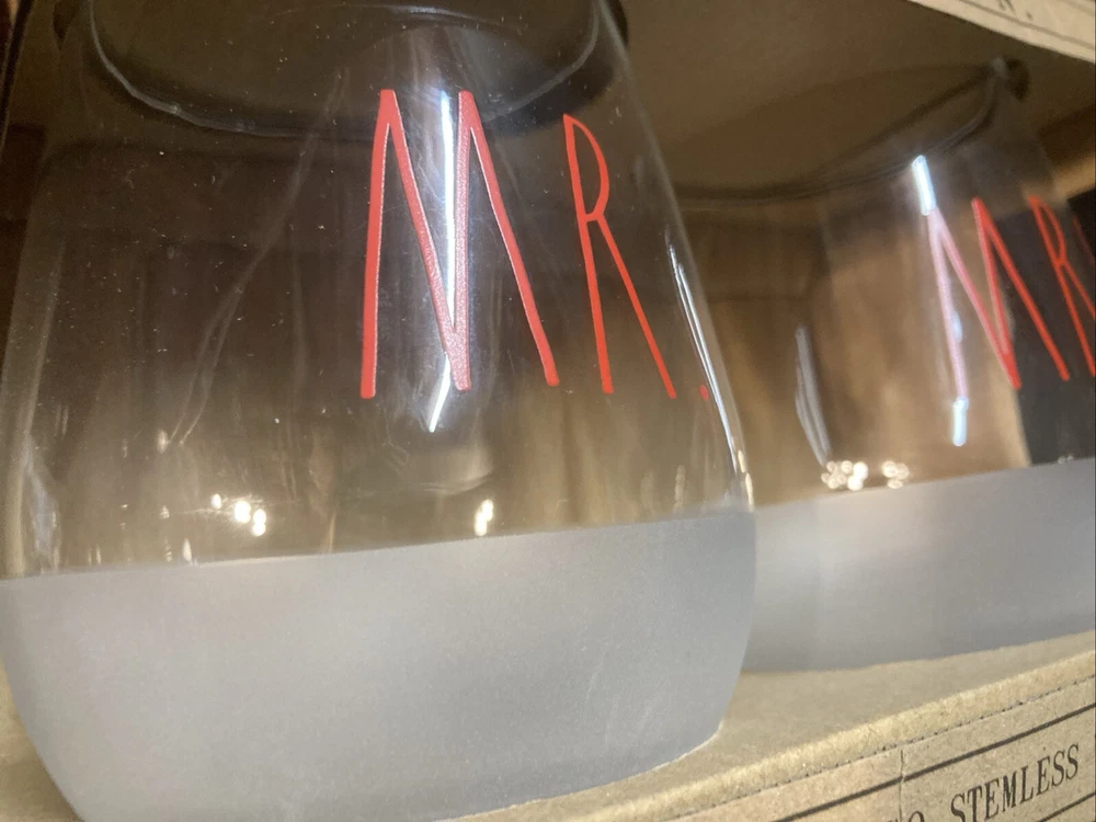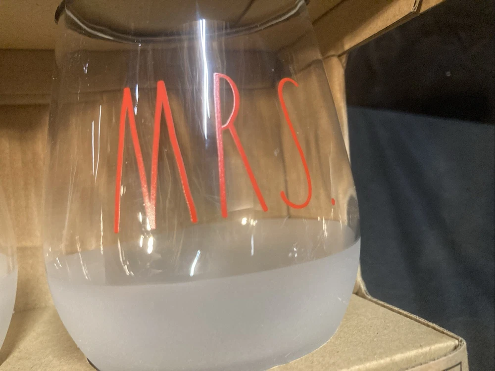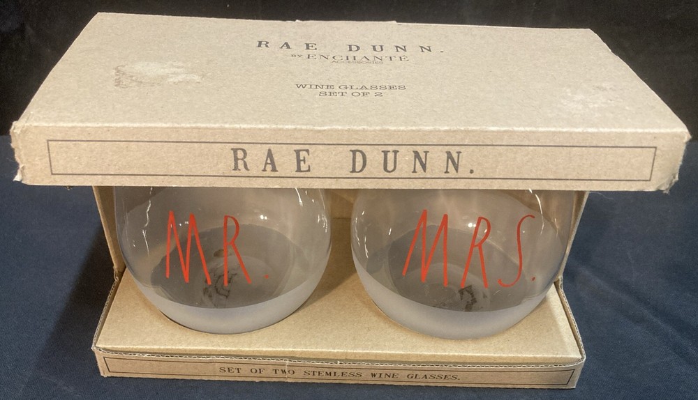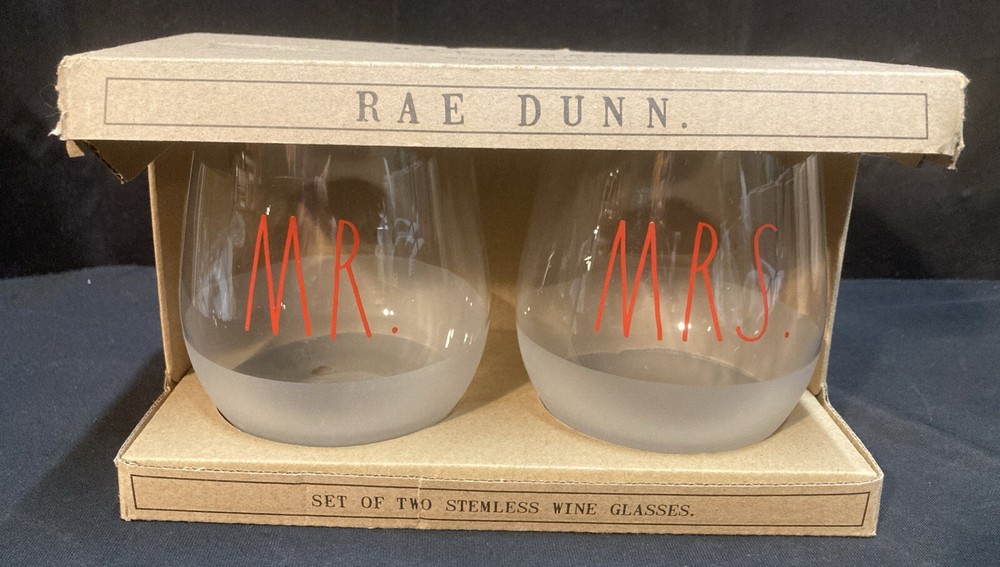 This Rae Dunn MR. & MRS. Stemless Wine Glasses Red Font Set of 2 comes in good, clean condition with no chips, cracks, or breaks. Please note that the outside box has some cosmetic imperfections and some sticker residue. Please see pictures for details. If you have any questions or concerns, please do not hesitate to contact us. Check out our other items and message us if interested in more than one listing as combining items could save you money on shipping.