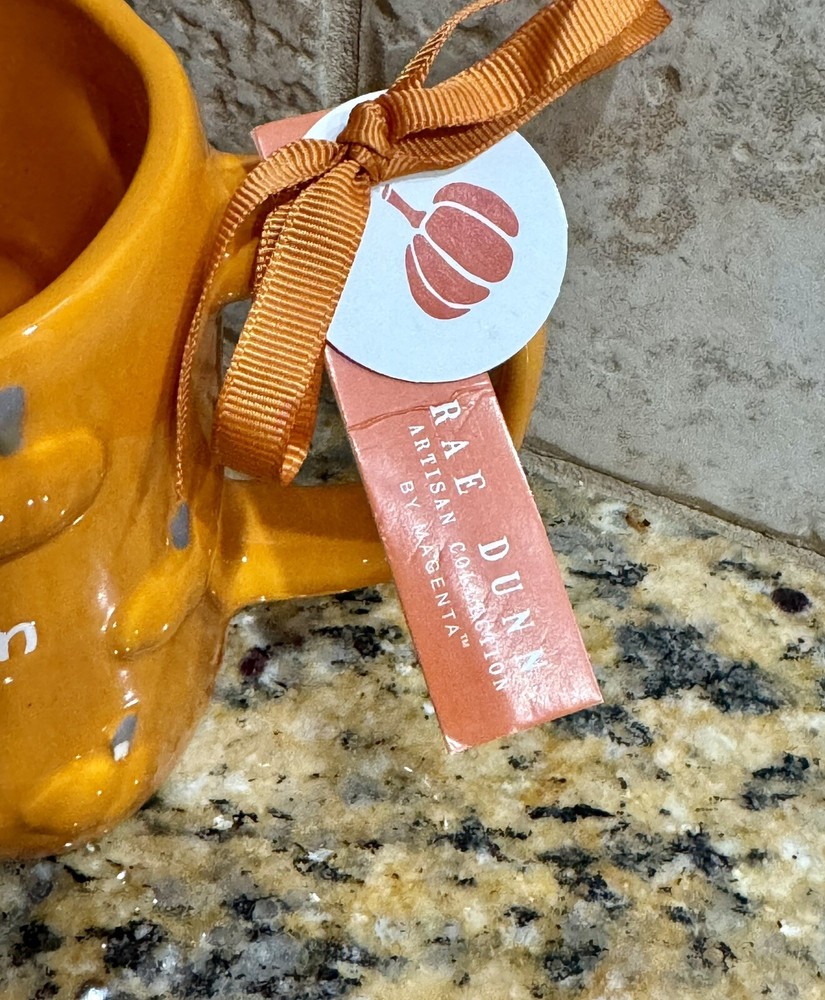 Rae Dunn PUMPKIN SPICE Orange Mug With Raised Pumpkins Fall Vibes NEW With Tags Colors may appear different depending on screen or monitor viewed on.