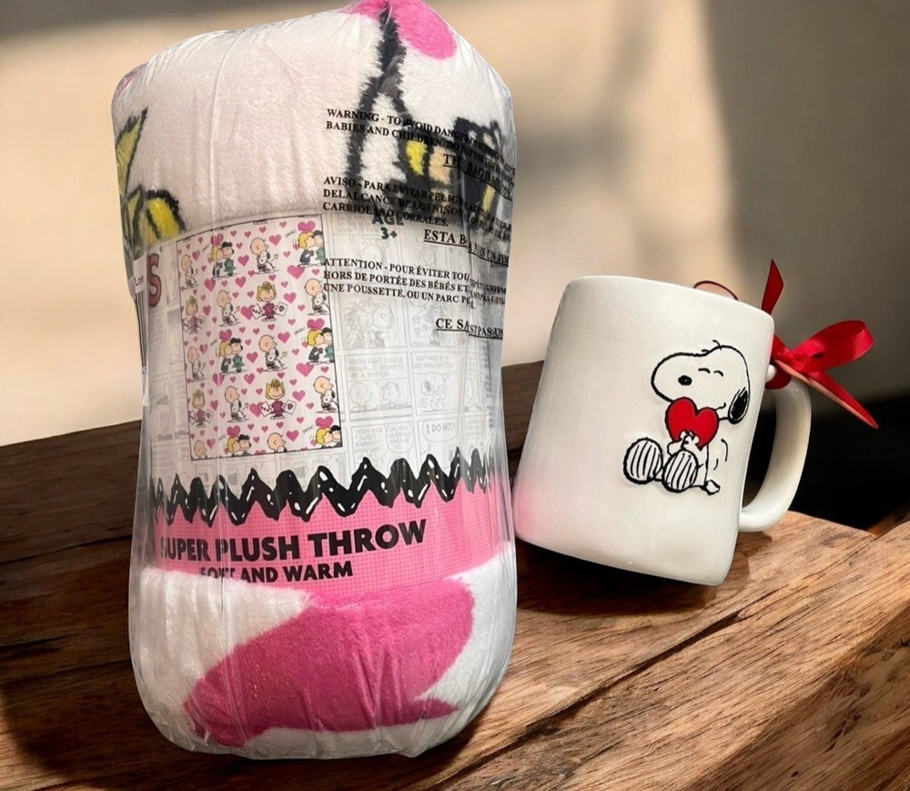Peanuts Valentines Day Throw Blanket. ・Peanuts super soft 46" x 60" Micro Rashel Throw ・Lightweight and easy to carry the throw ・Perfect to cuddle up with ・The Throw can be tossed into the washer and dryer for easy care ・Polyester ・Machine wash Peanuts Rae Dunn Valentines Mug ・”Be My Valentine “ ・double sided ・New
