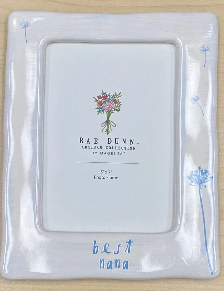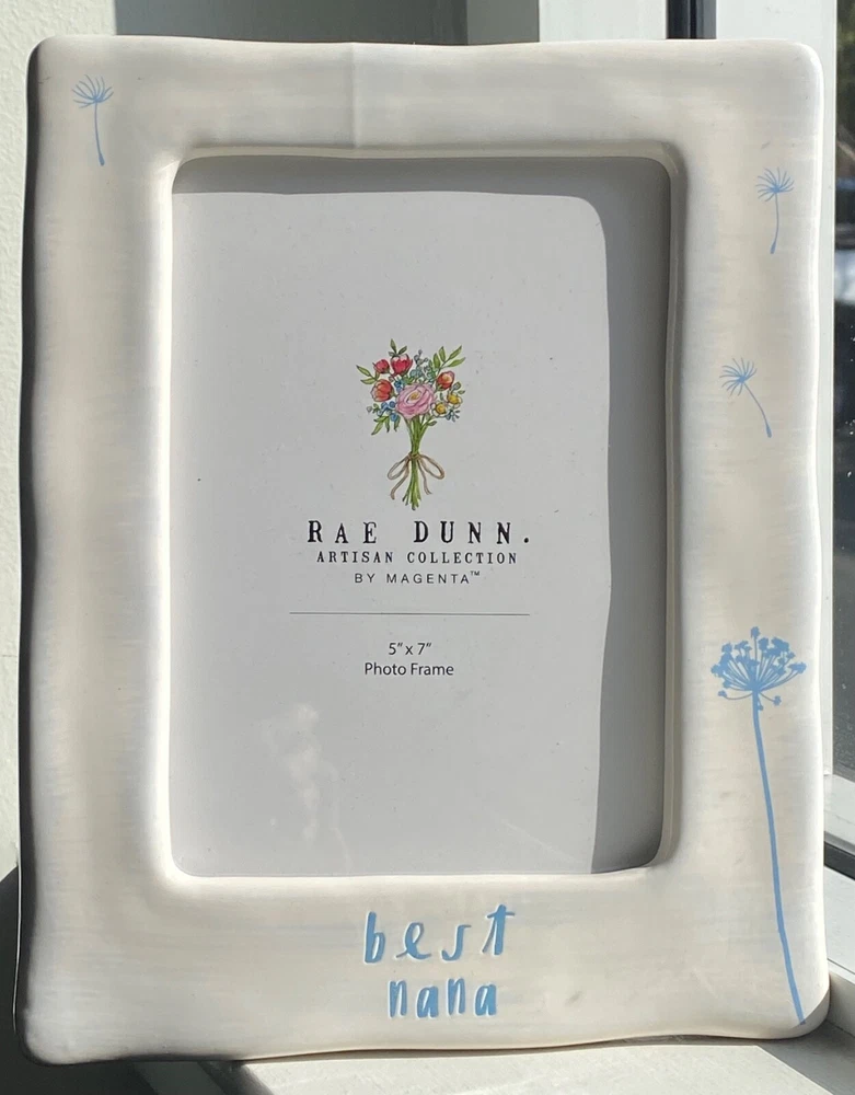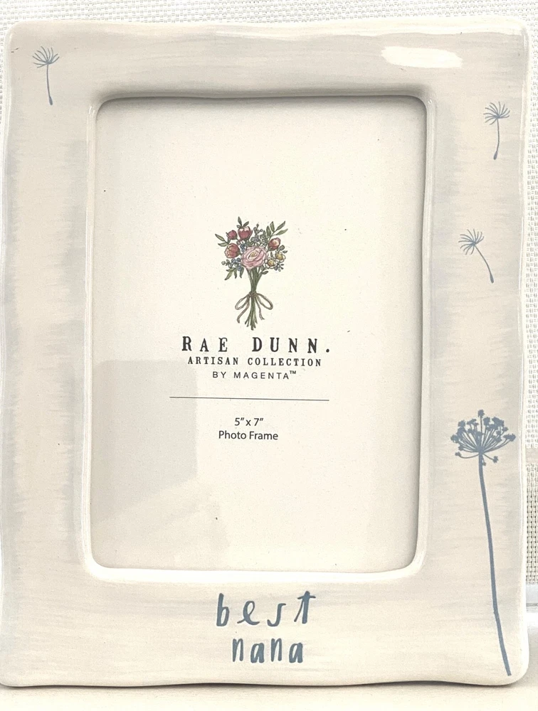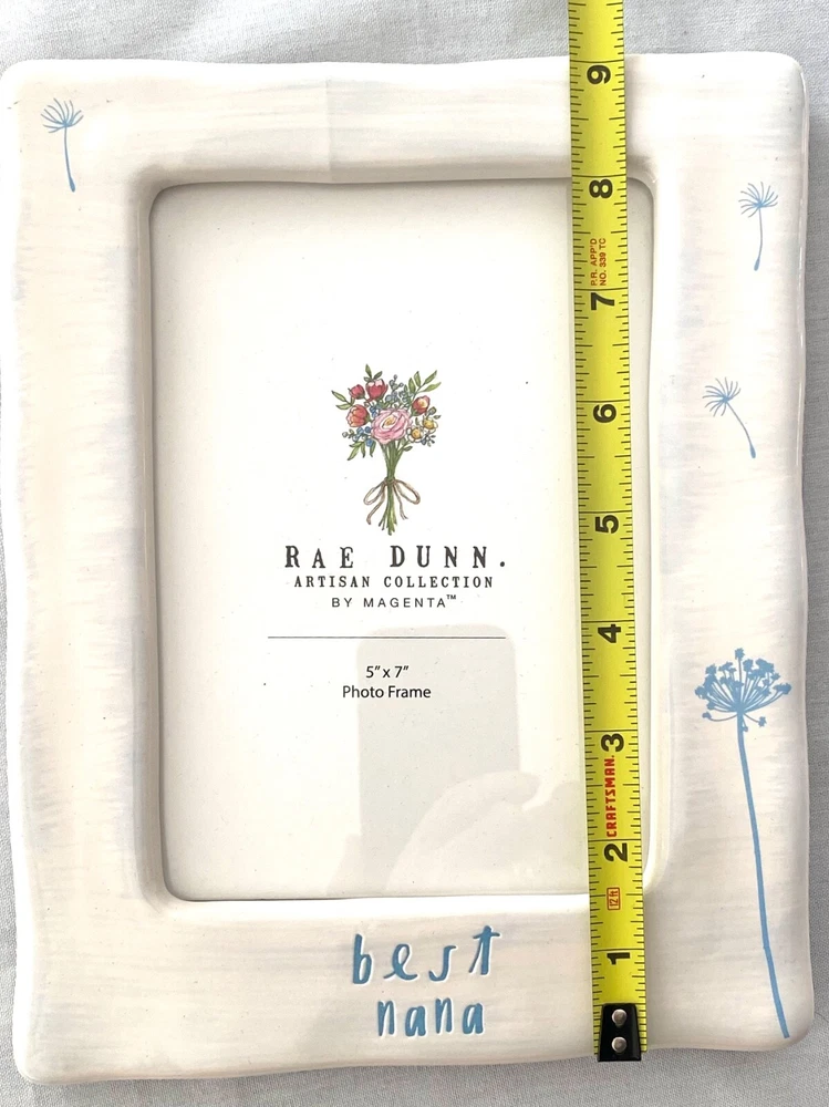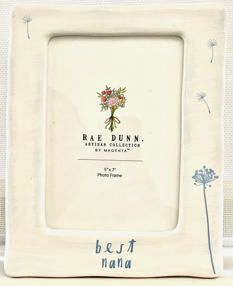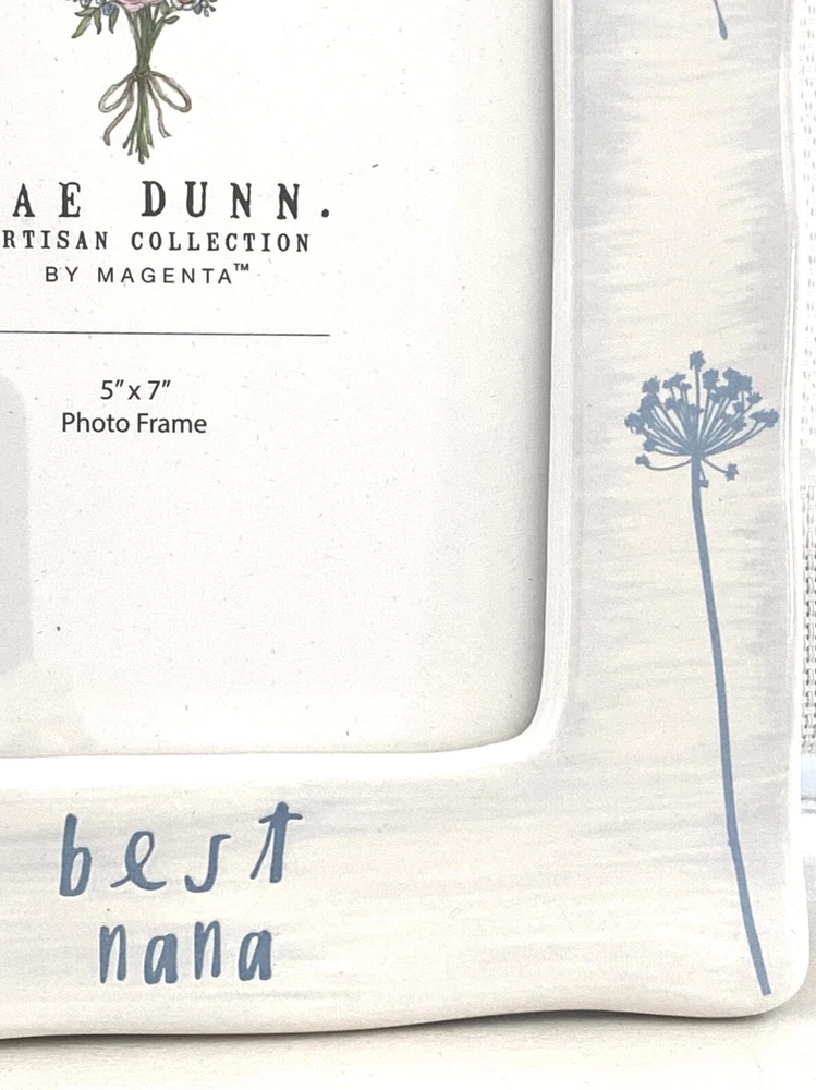Elevate your cherished memories with the Rae Dunn White Ceramic Photo Frame, adorned with blue accents and a heartwarming "Best Nana" and floral theme. This elegant 5x7 inch frame is designed to showcase your most treasured moments in a portrait orientation, complete with a rear-loading design for easy photo insertion. Crafted with a glossy finish and clear glass, this frame is a blend of functionality and style. Measuring 9 inches in height, 7 inches in width, and 3.5 inches in length, it's the perfect size for displaying a single photo, making it a meaningful addition to any space or occasion. Whether it's for your own collection or as a thoughtful gift, this frame is sure to delight.