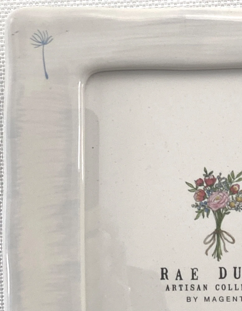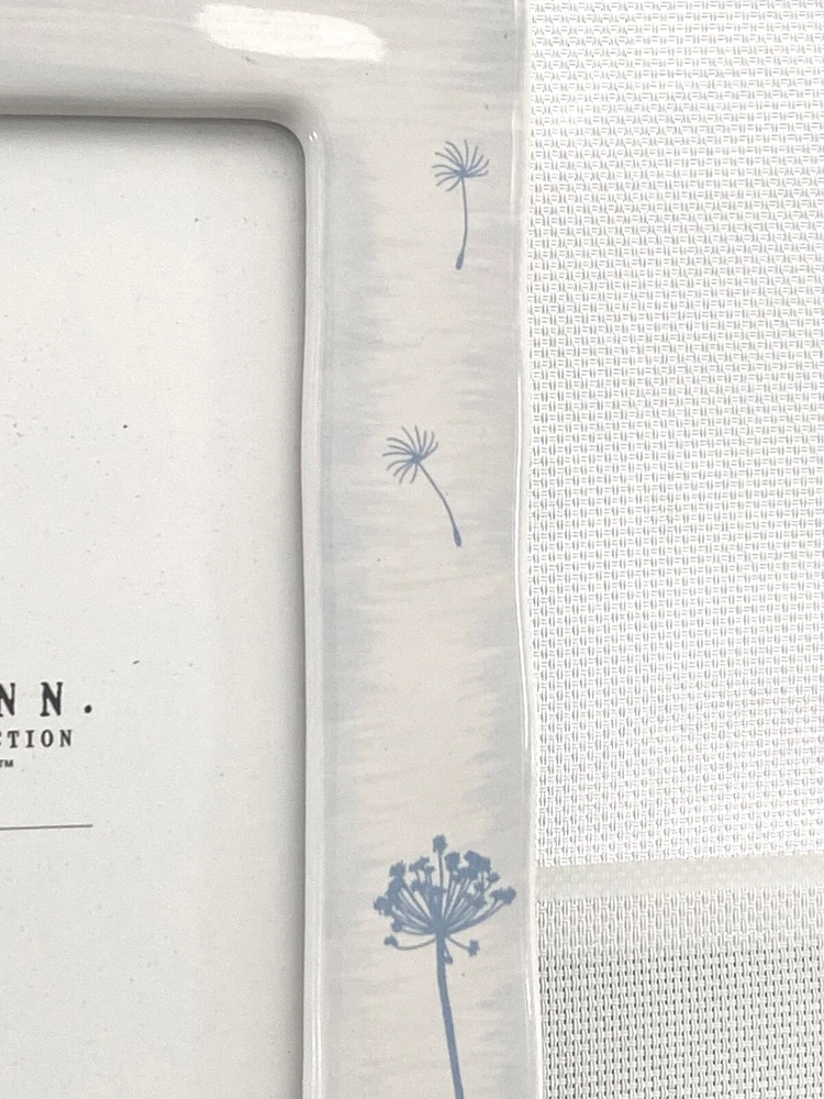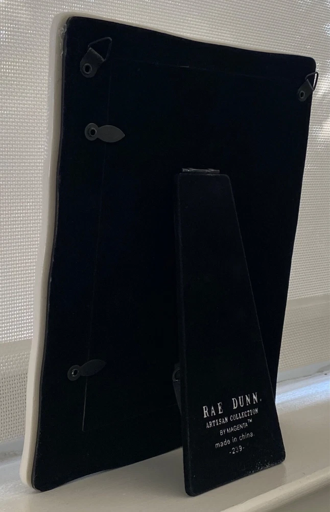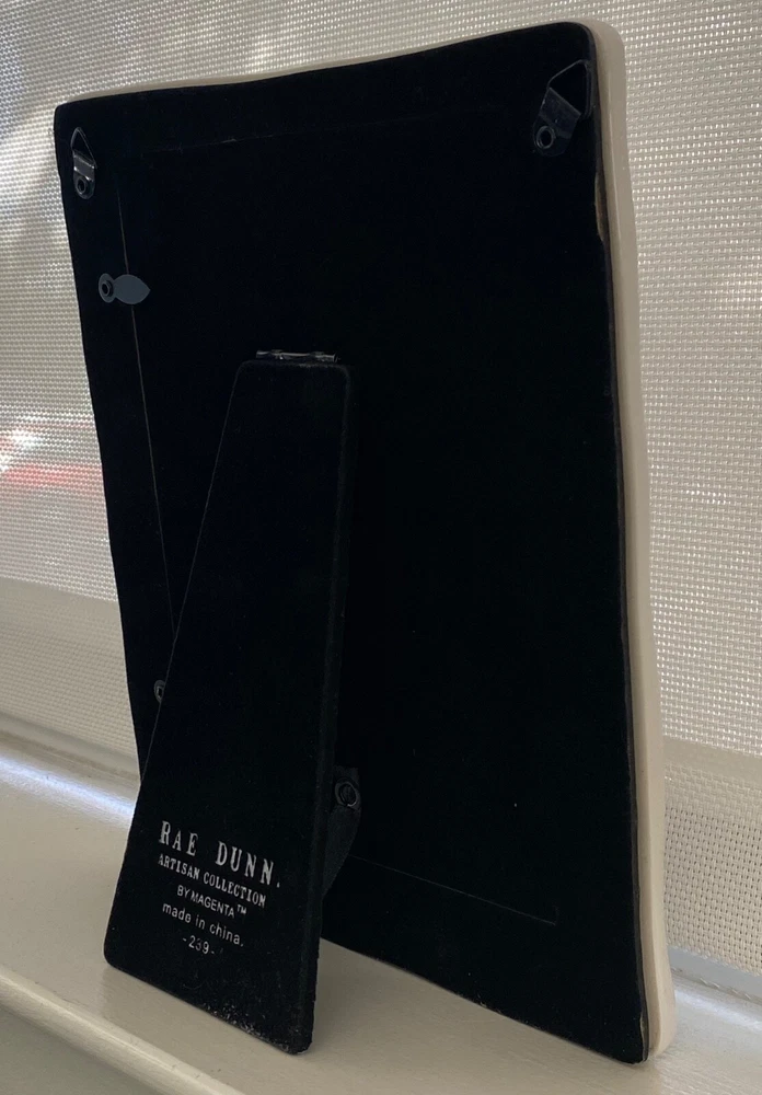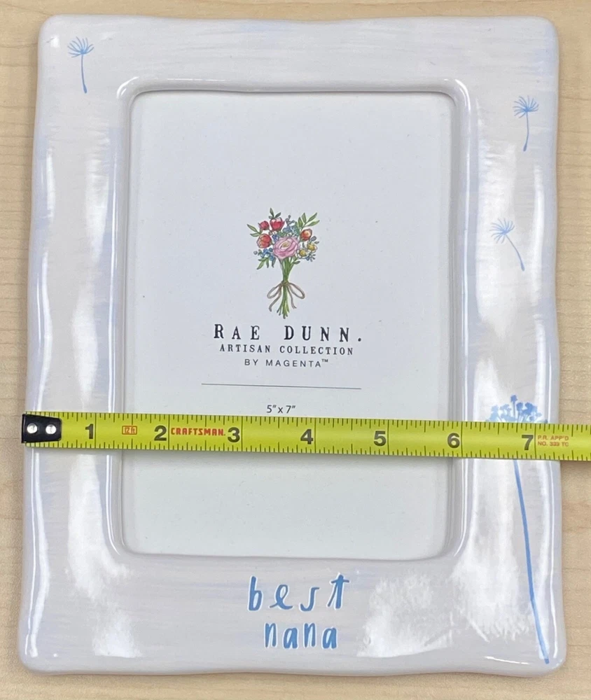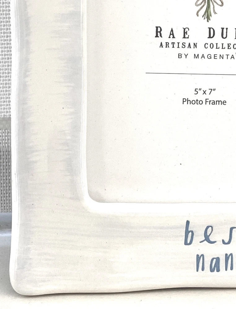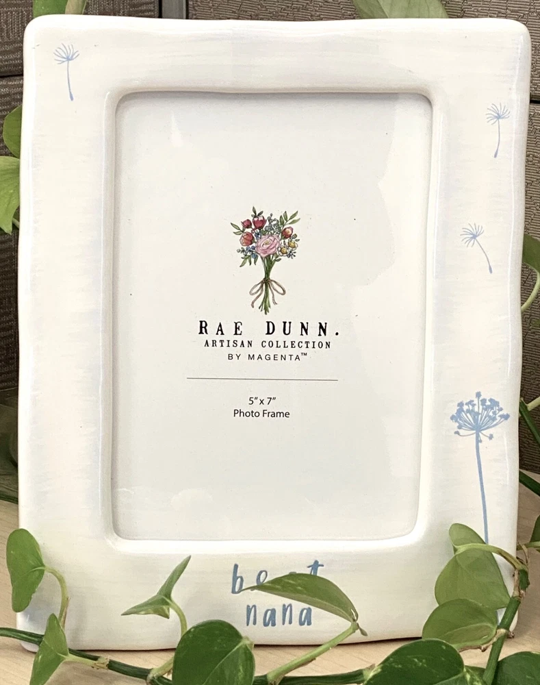 Elevate your cherished memories with the Rae Dunn White Ceramic Photo Frame, adorned with blue accents and a heartwarming "Best Nana" and floral theme. This elegant 5x7 inch frame is designed to showcase your most treasured moments in a portrait orientation, complete with a rear-loading design for easy photo insertion. Crafted with a glossy finish and clear glass, this frame is a blend of functionality and style. Measuring 9 inches in height, 7 inches in width, and 3.5 inches in length, it's the perfect size for displaying a single photo, making it a meaningful addition to any space or occasion. Whether it's for your own collection or as a thoughtful gift, this frame is sure to delight.