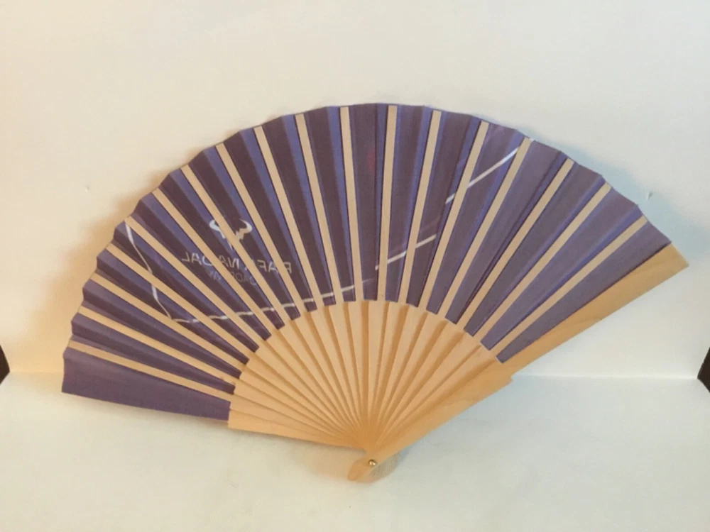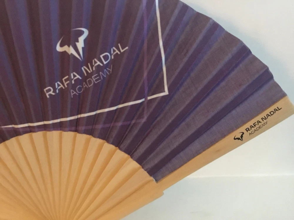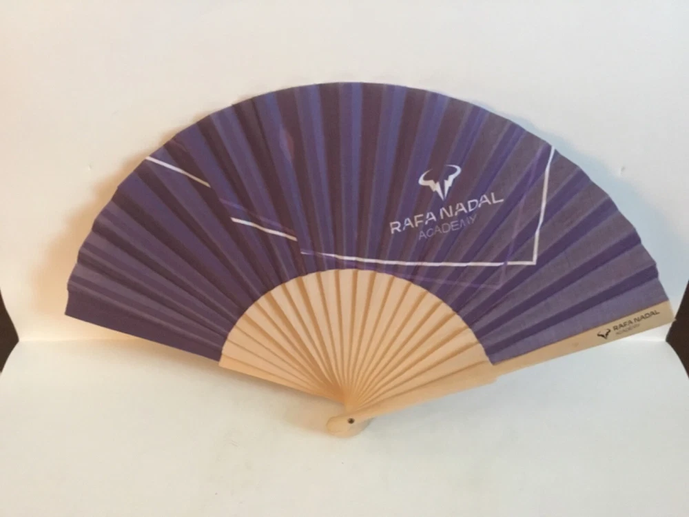 Rafa Nadal Academy Folding Blue Fan. Polyester Fabric, Wooden Slats. L 16.5” H 9” The Academy Logo, A Stylized Version Of A Bull ,A Reference To His Nickname “Raging Bull” A Small Faded Spot (See Photo) Otherwise In Excellent Condition.Bought At French Open,2022 When Nadal Won.