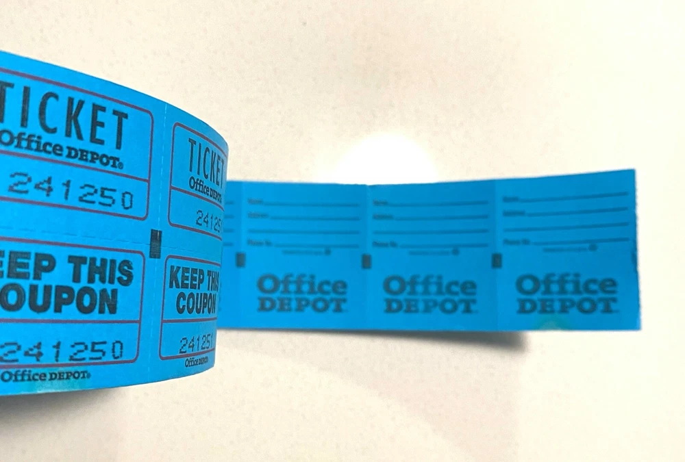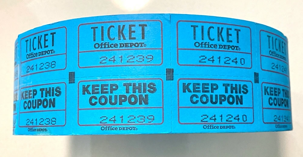 Raffle Ticket Roll Double Stub 50/50 “Keep This Coupon”, Office Depot Brand You will receive one (1) full roll of double stub 50/50 raffle tickets (2000 tickets) This roll is consecutively numbered The ticket portion in the back has lines for name, address, and phone Each ticket measures 1 3/4" long x 2" wide The roll color is blue What you see in the pictures is what you will receive. · If you have any questions, please ask before purchase.