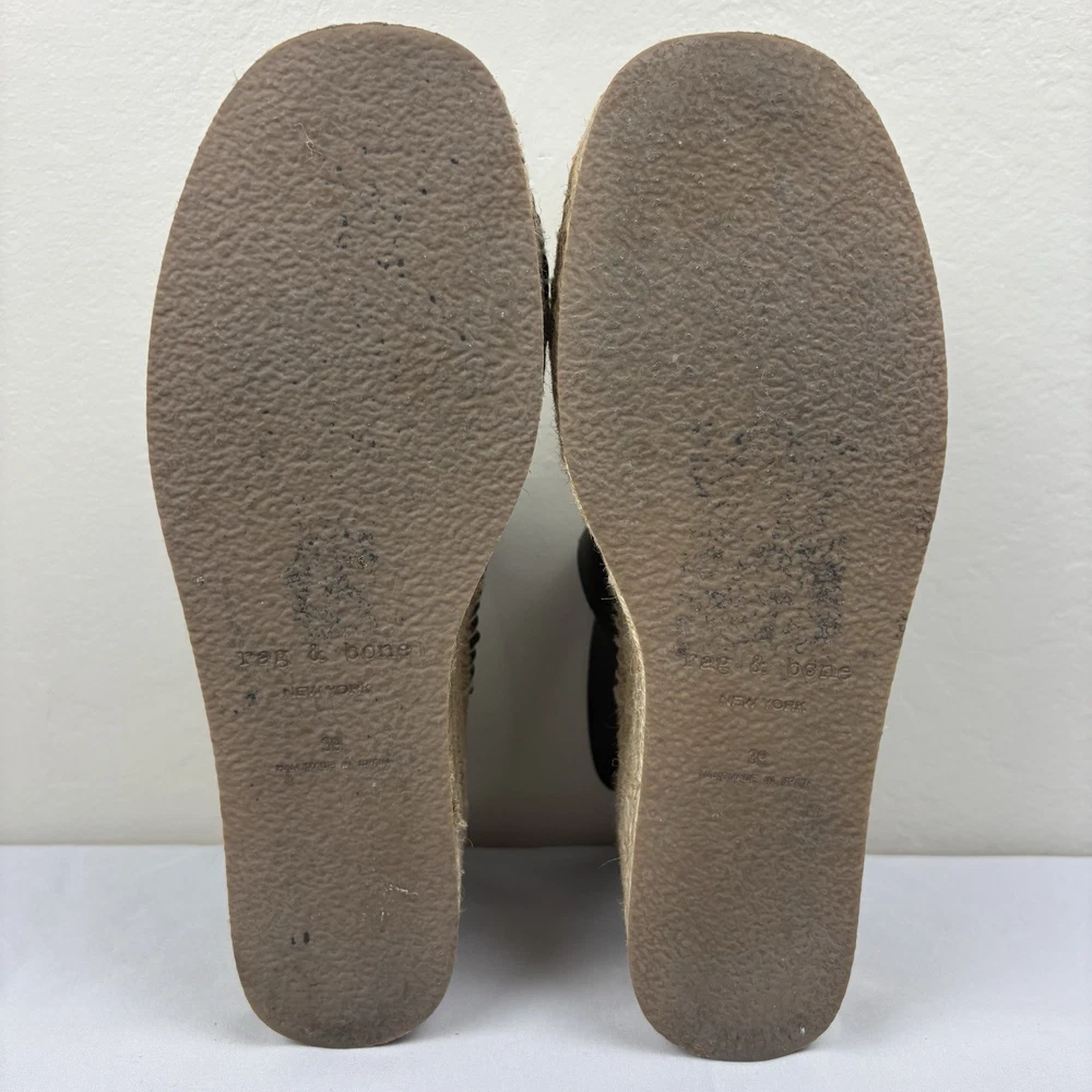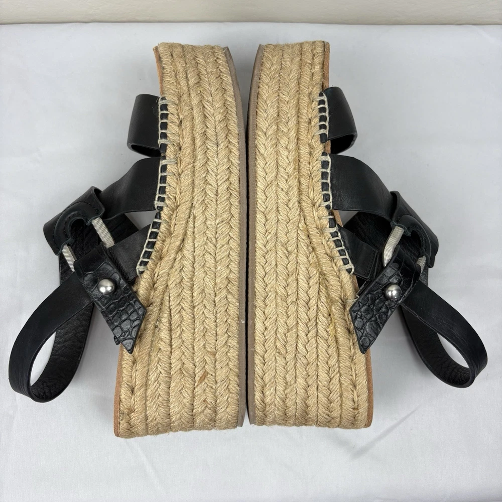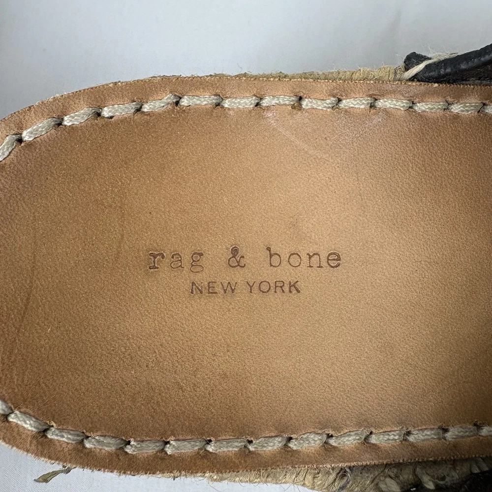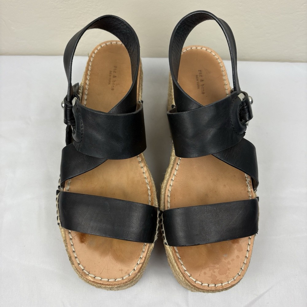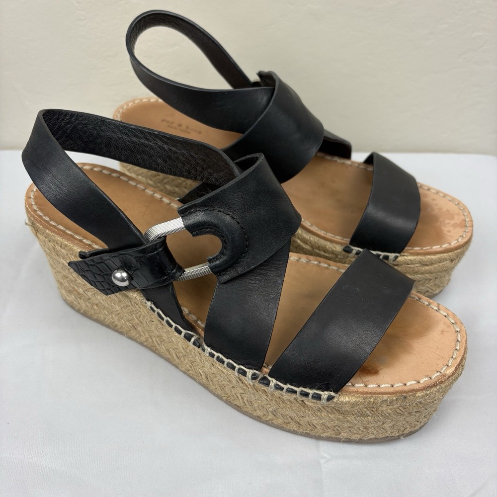 Handmade in Spain, these leather platform espadrilles feature a soft footbed, cross cross ankle straps, and jute wedges. Textured hardware mixes with soft leather straps on this slingback sandal, while a jute-wrapped platform wedge heightens the style's summer appeal. Push-stud silver tone closure. SIZE: EUR 39 (according to the rag & bone website, this is equivalent to a US size 9) COLOR: Black MATERIAL CONTENT: Leather upper and lining/rubber sole STYLE: August COO: Spain CONDITION: Excellent pre-owned condition with only minor signs of wear. Please see photos for details. MEASUREMENTS (approximate; please see photos) Heel: 3" Platform: 2" Heel to Toe: 10" Please note, these shoes are a bit heavy. Each one weighs about 1 lb, 4 oz. If you have any questions, please don’t hesitate to ask. Thanks for viewing our listing! Espadrilles, sandals, platform sandals, resortwear, summer, spring, beach