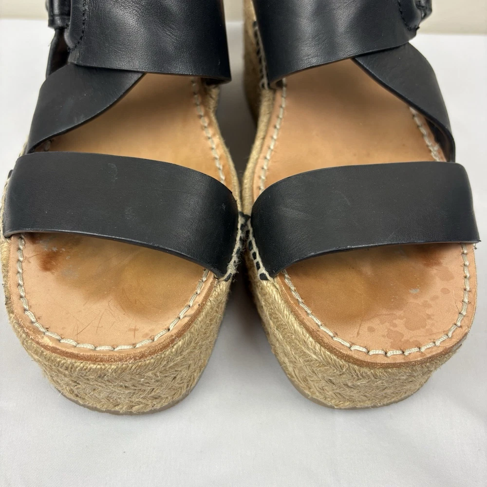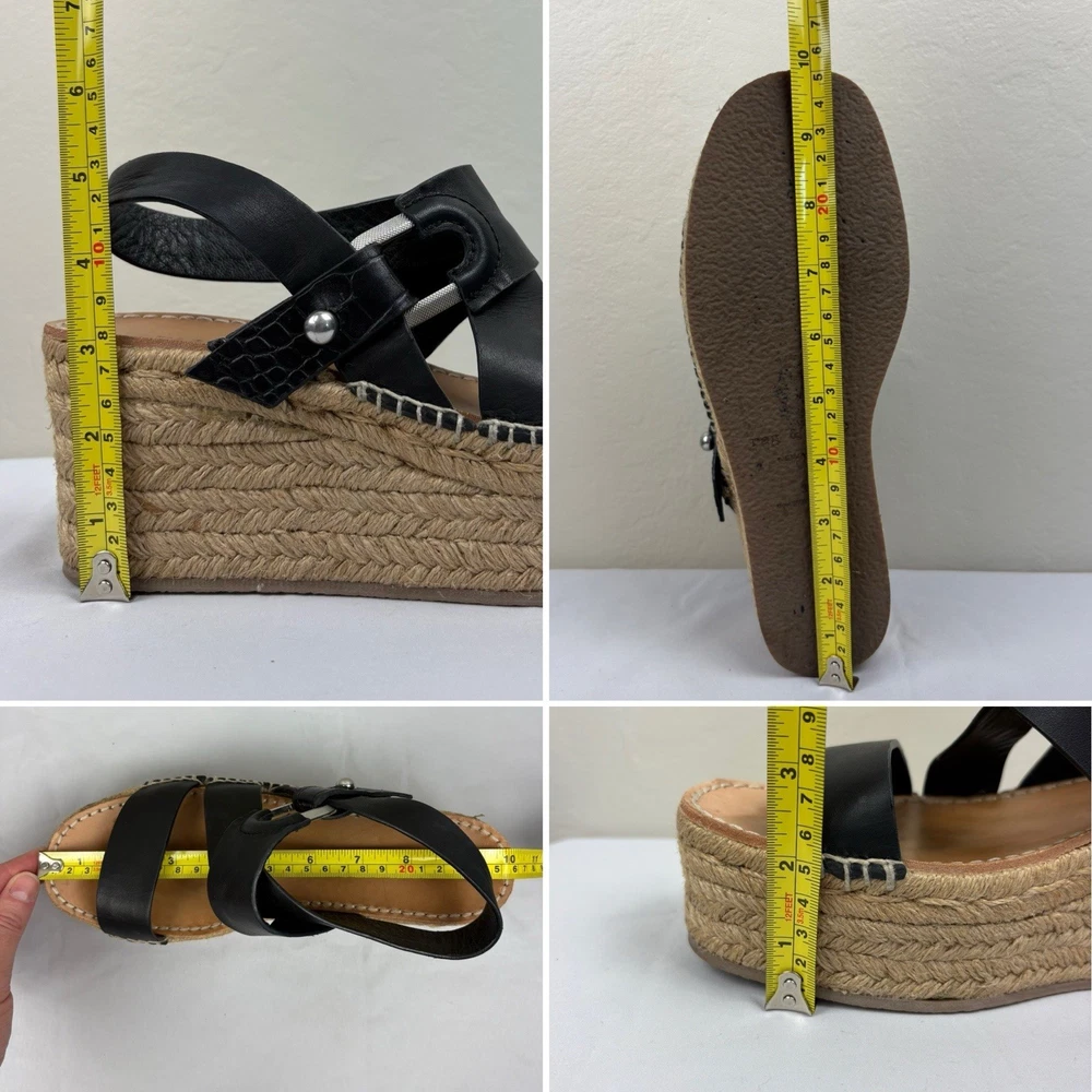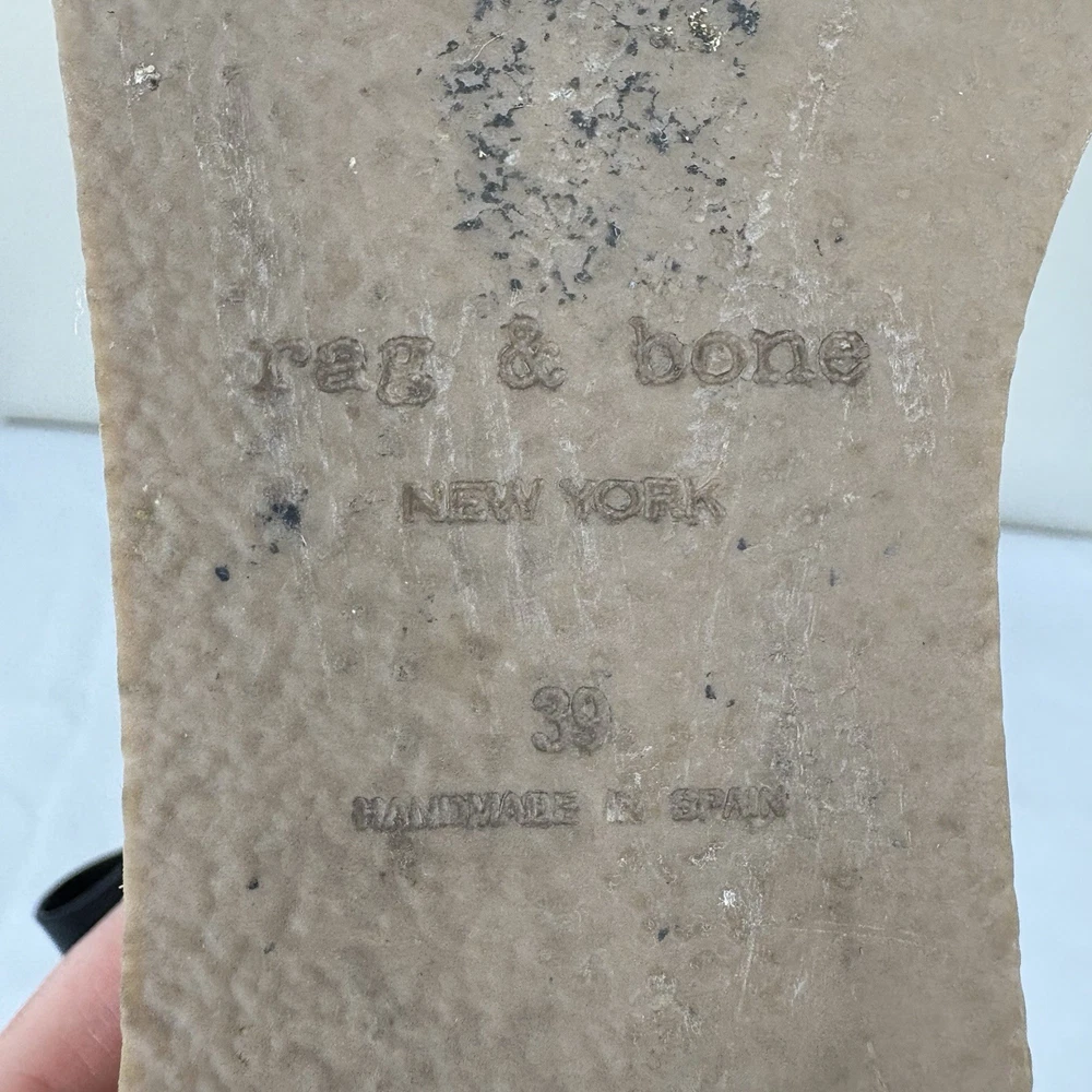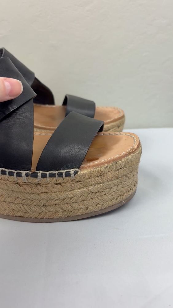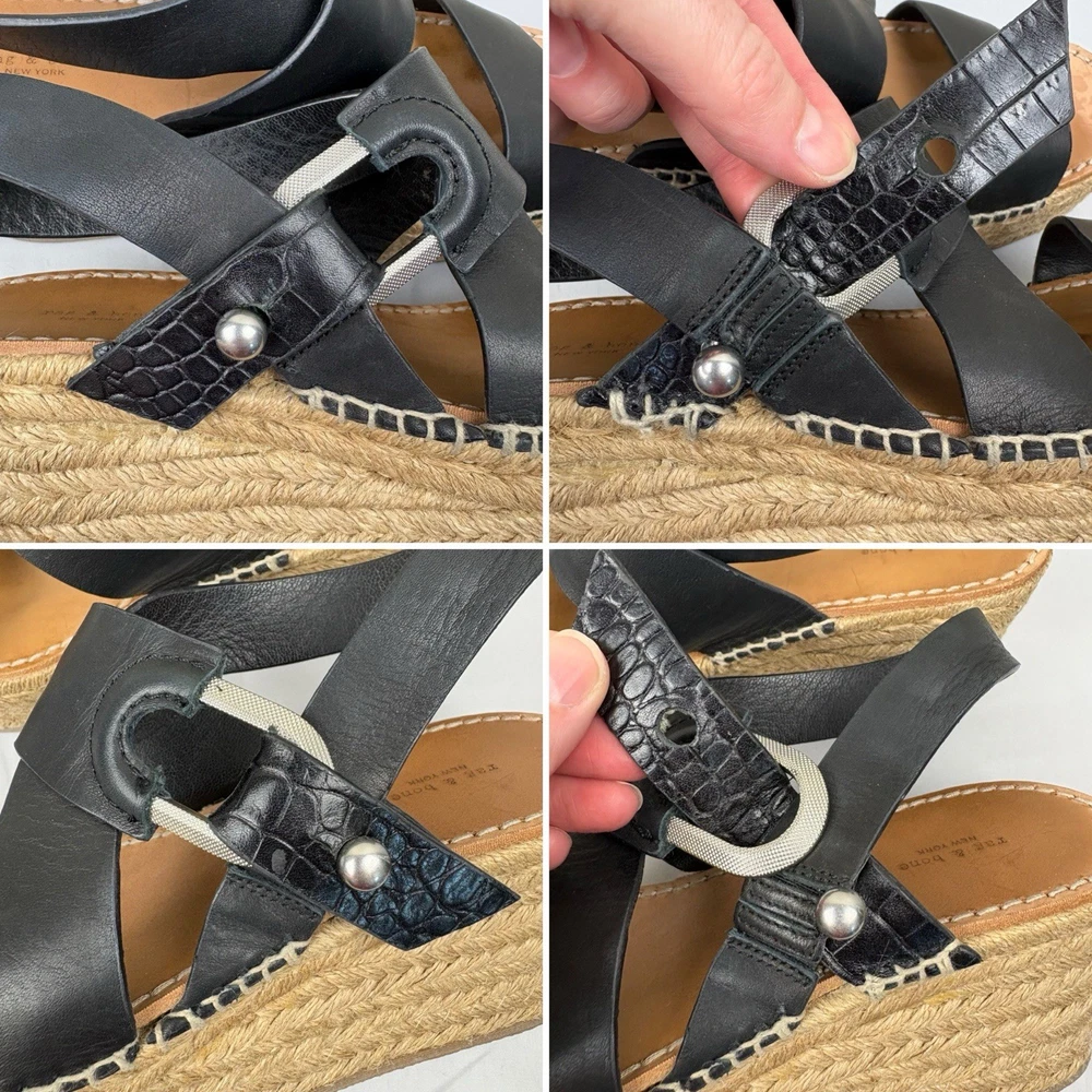 Handmade in Spain, these leather platform espadrilles feature a soft footbed, cross cross ankle straps, and jute wedges. Textured hardware mixes with soft leather straps on this slingback sandal, while a jute-wrapped platform wedge heightens the style's summer appeal. Push-stud silver tone closure. SIZE: EUR 39 (according to the rag & bone website, this is equivalent to a US size 9) COLOR: Black MATERIAL CONTENT: Leather upper and lining/rubber sole STYLE: August COO: Spain CONDITION: Excellent pre-owned condition with only minor signs of wear. Please see photos for details. MEASUREMENTS (approximate; please see photos) Heel: 3" Platform: 2" Heel to Toe: 10" Please note, these shoes are a bit heavy. Each one weighs about 1 lb, 4 oz. If you have any questions, please don’t hesitate to ask. Thanks for viewing our listing! Espadrilles, sandals, platform sandals, resortwear, summer, spring, beach