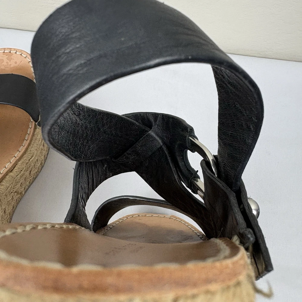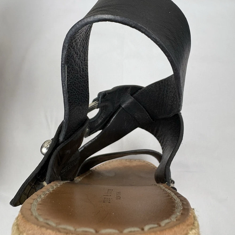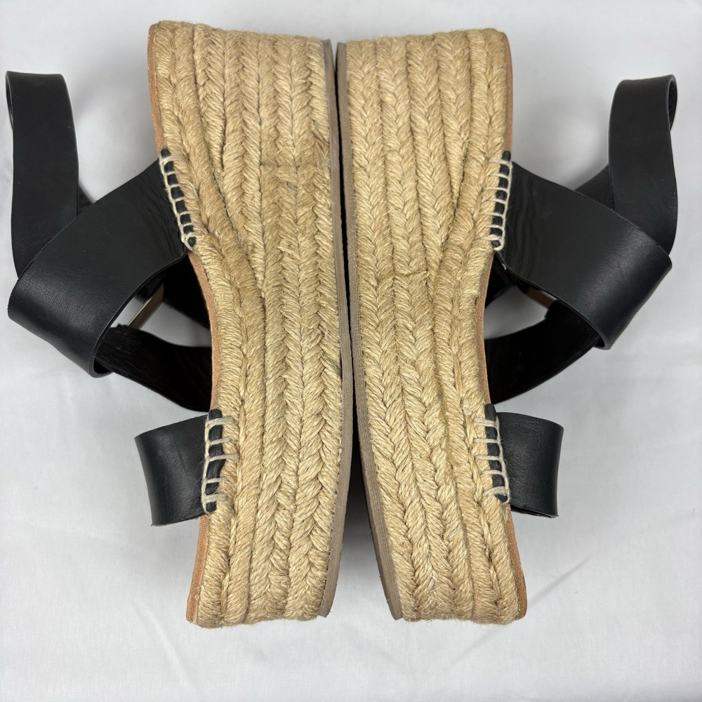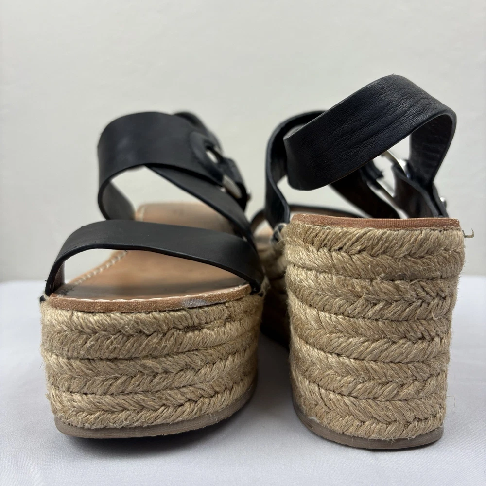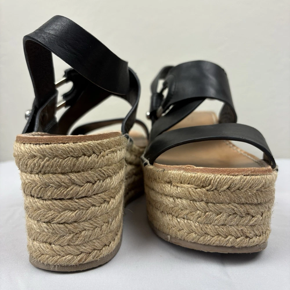 Handmade in Spain, these leather platform espadrilles feature a soft footbed, cross cross ankle straps, and jute wedges. Textured hardware mixes with soft leather straps on this slingback sandal, while a jute-wrapped platform wedge heightens the style's summer appeal. Push-stud silver tone closure. SIZE: EUR 39 (according to the rag & bone website, this is equivalent to a US size 9) COLOR: Black MATERIAL CONTENT: Leather upper and lining/rubber sole STYLE: August COO: Spain CONDITION: Excellent pre-owned condition with only minor signs of wear. Please see photos for details. MEASUREMENTS (approximate; please see photos) Heel: 3" Platform: 2" Heel to Toe: 10" Please note, these shoes are a bit heavy. Each one weighs about 1 lb, 4 oz. If you have any questions, please don’t hesitate to ask. Thanks for viewing our listing! Espadrilles, sandals, platform sandals, resortwear, summer, spring, beach