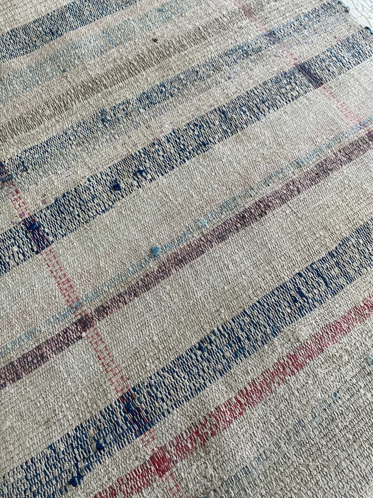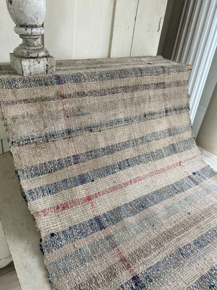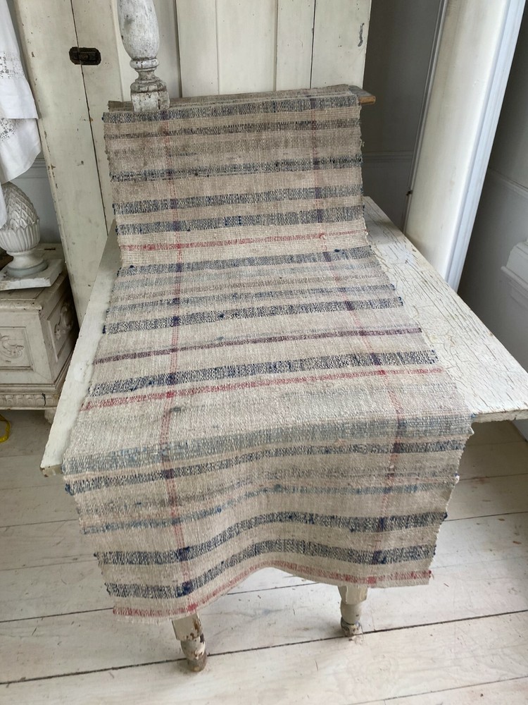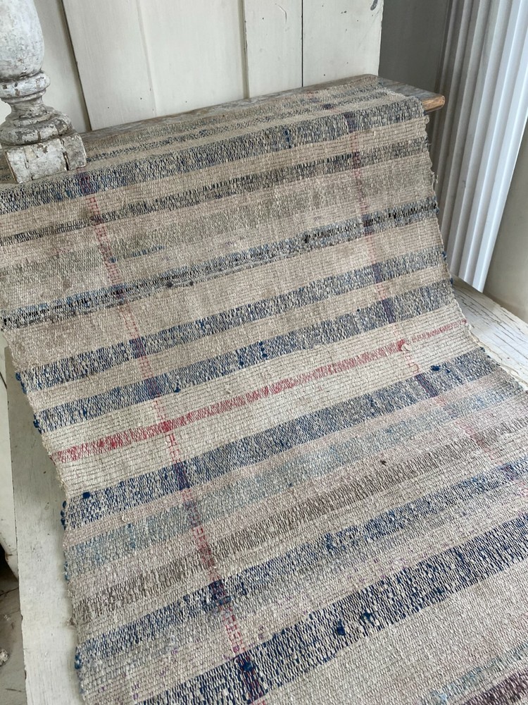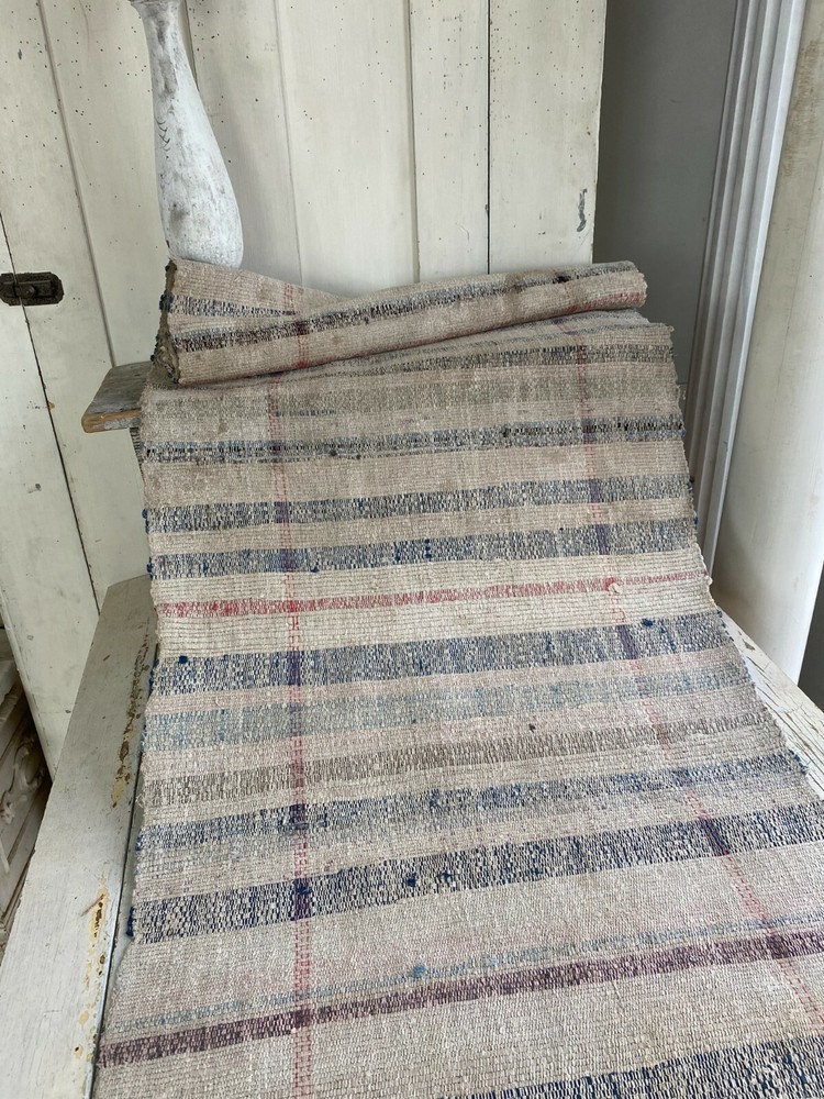 ~*~Hello and Welcome to the Textile Trunk~*~ Please follow us on Instagram! We are : textiletrunk Wonderful natural tones! This bolt is very dirty, but once cleaned I think it will be lovely !~ ( condition reflected in the price) ~*~ This lovely textile is a hand loomed rag rug from Europe, dating from the early to mid 1900's ~ . ~ Gorgeous farmhouse striped pattern and colors! This textile was woven by hand and used as floor covering. This bolt was woven with a cotton and sometimes a linen thread warp and the weft is woven with strips of various cloths! So many wonderful tones and colors. This textile would add so much flair to an interior ,Wonderful for a décor for a relaxed and fun vibe! ~ These textiles can be used in SO many ways : Ideal used as a hallway carpet, table runner, stair runner, place mats, bathmats, pillow and upholstery fabric, etc! ( please see condition details below) MEASUREMENTS : ~ This lovely piece measures about 25 inches wide by 1.75 yards ( * because these textiles are all woven by hand, the width can vary throughout the bolt as the weaver uses more or less tension! ~*~ The width on these textiles can vary by up to a few inches in places, giving that charming hand-made quality to these wonderful textiles ~*~) CONDITION : This rag rug is in as found, not freshly laundered condition.~ This bolt needs to go straight to the cleaners!!! It's being sold as damaged, but I think it will wash beautifully !! *~ These bolts were used as floor coverings and then put away, uncleaned! I've sold these wonderful textiles for many years now, and have never had an unhappy customer, however it's very important to know that it is necessary to dry clean before it can be enjoyed! It's dusty and often with visible dirt marks which will wash beautifully ~~*~ The unwashed condition is reflected in the price! ~ *~ There are some small , pale marks ~Light signs of time and use , often inherent in these wonderful antique textiles ~*~( please use the zoom feature on the photographs to view closely~) ( condition reflected in the price) Inventory number : 69Y6