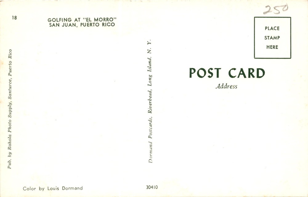 MAKE AN OFFER. THE MORE YOU BUY THE BETTER DEAL I WILL ACCEPT The postcard depicts golfing at El Morro in San Juan, Puerto Rico. The image was colored by Louis Dormand and published by Rahola Photo Supply in Santurce, Puerto Rico. The postcard is part of the Dormand Postcards series from Riverhead, Long Island, N.Y.