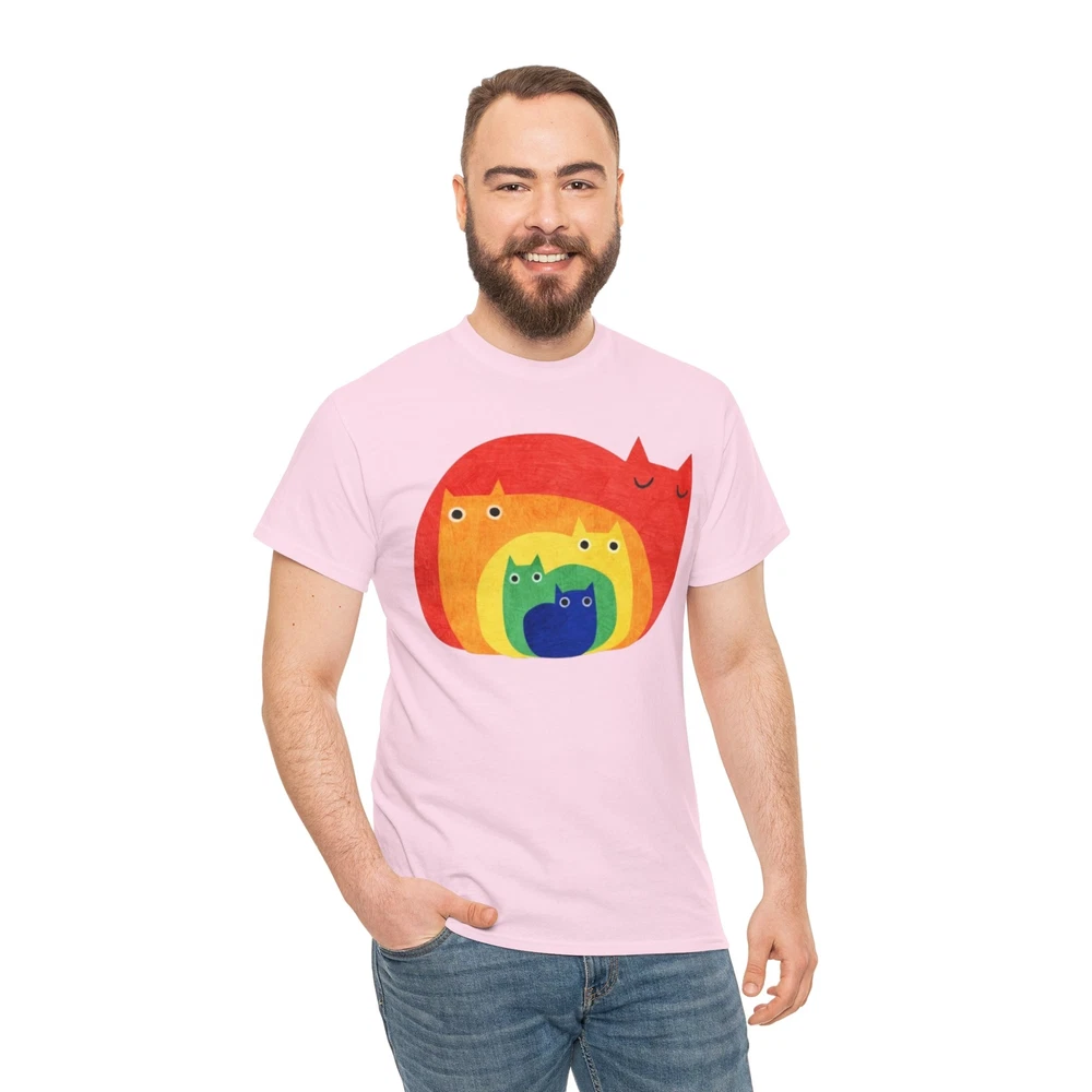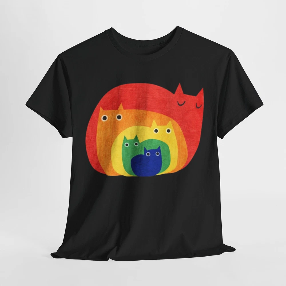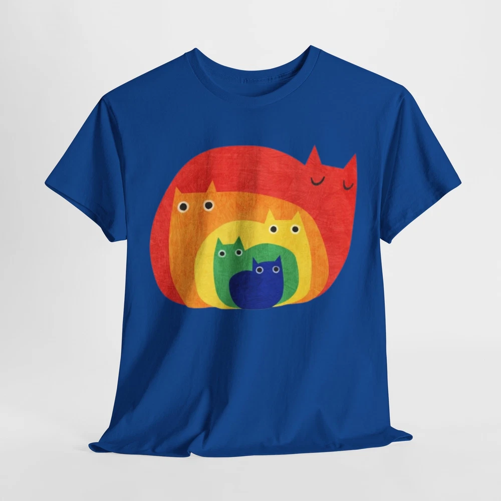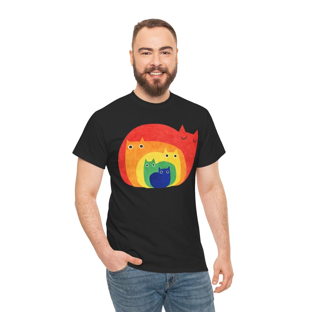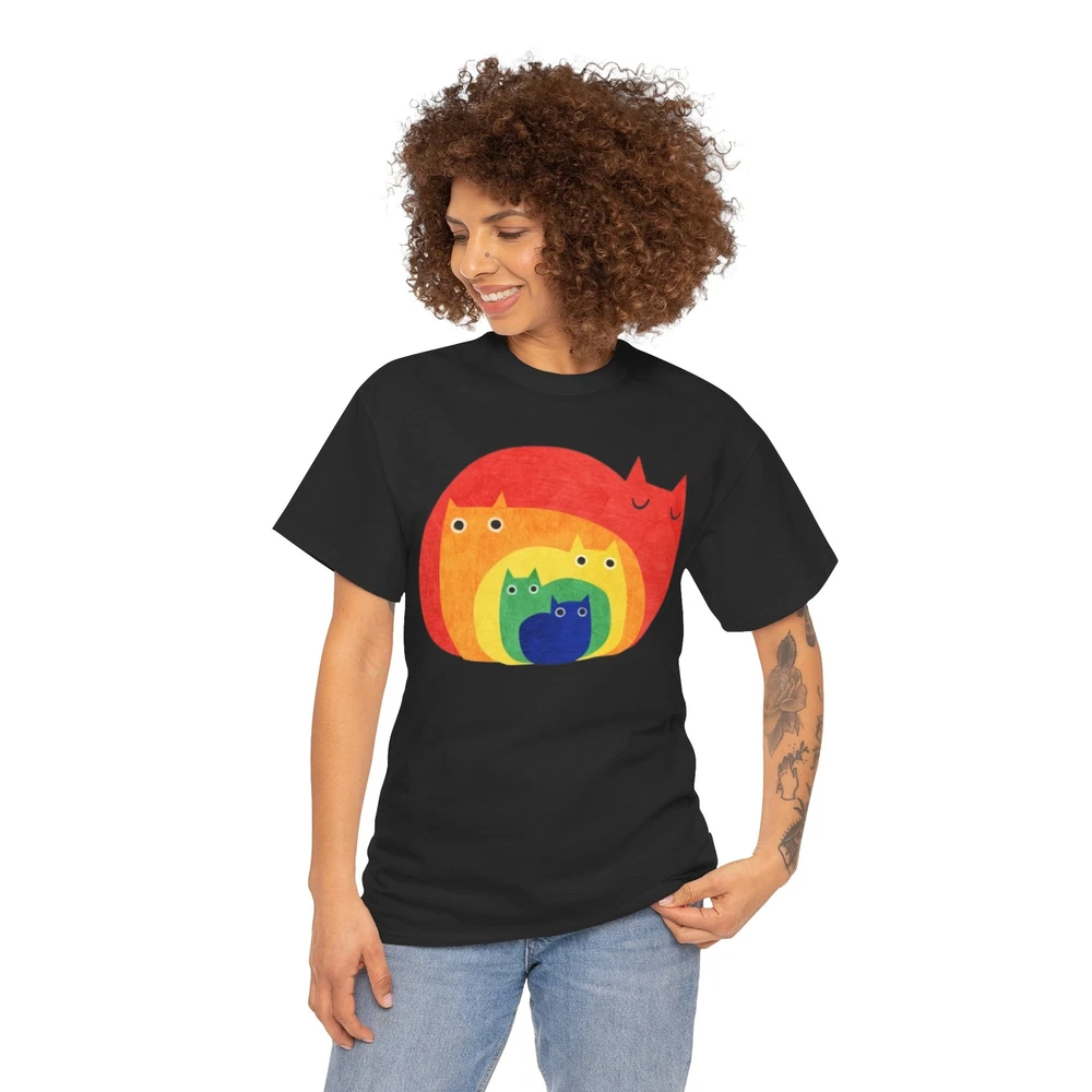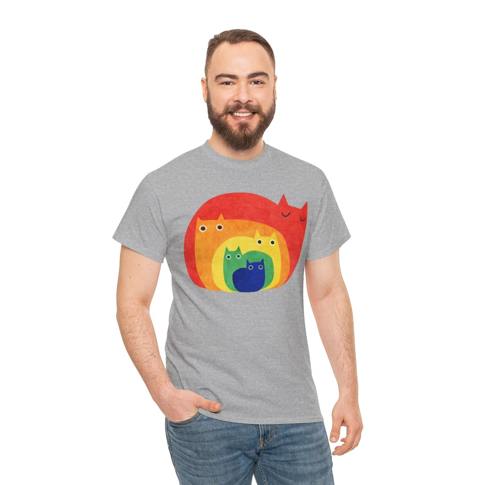 Rainbow Cats Cat Art Pride Day Unisex Gildan T-Shirt The unisex heavy cotton tee is the basic staple of any wardrobe. It is the foundation upon which casual fashion grows. No side seams mean there are no itchy interruptions under the arms. The shoulders have tape for improved durability. .: 100% cotton (fiber content may vary for different colors) .: Medium fabric (5.3 oz/yd² (180 g/m²)) .: Classic fit .: Tear-away label .: Runs true to size