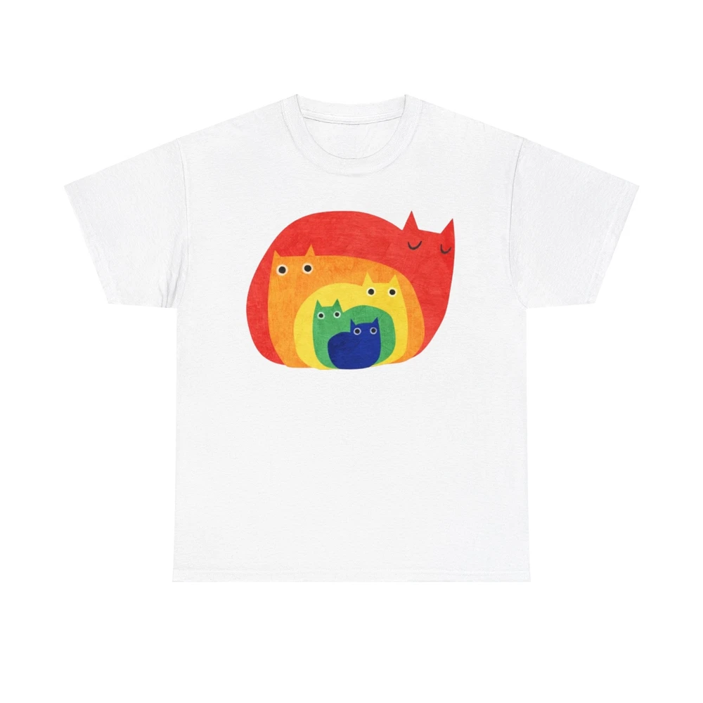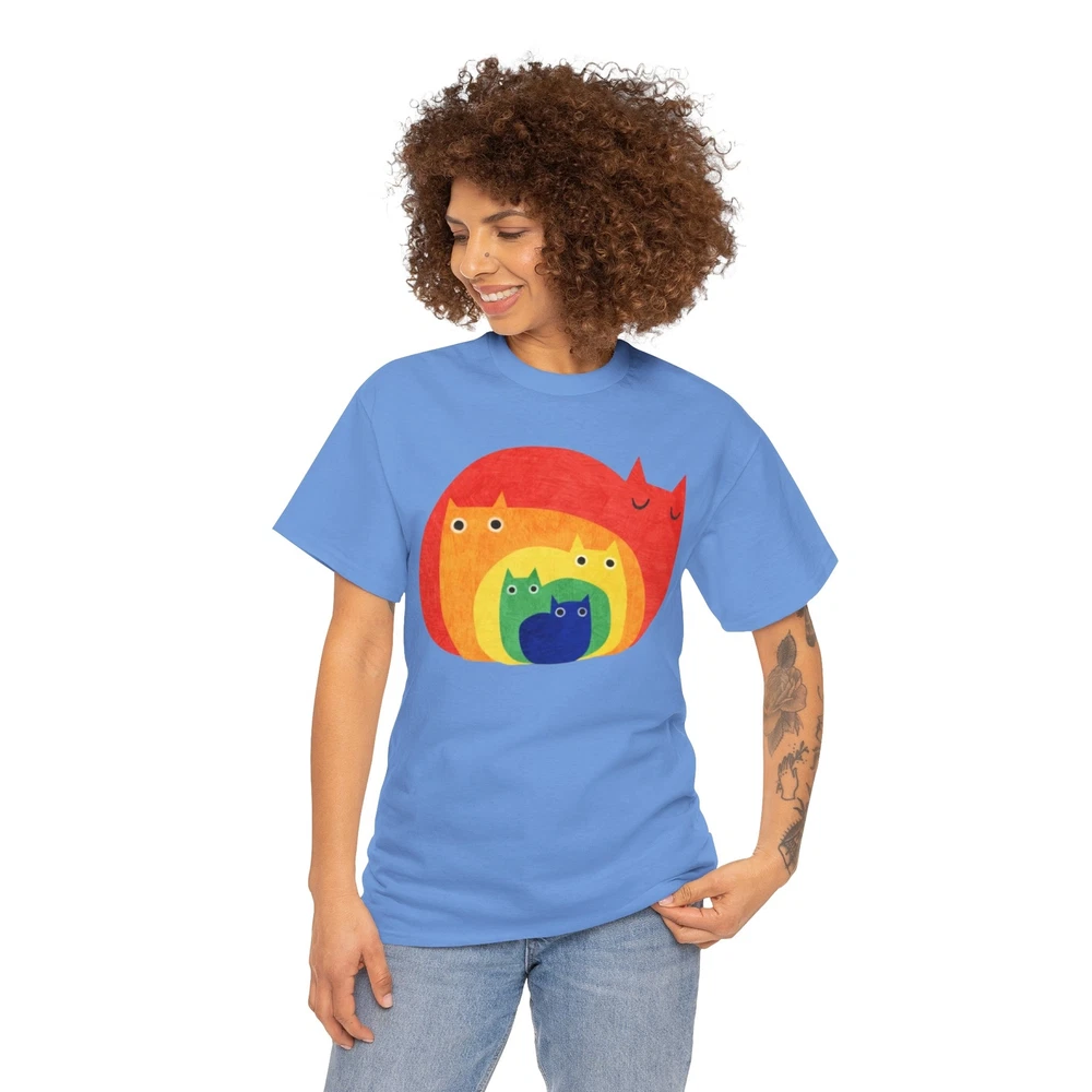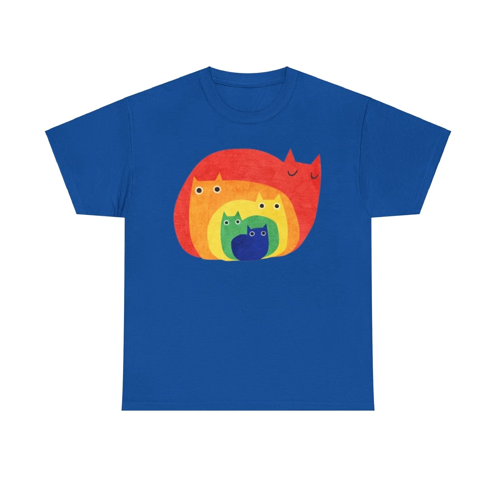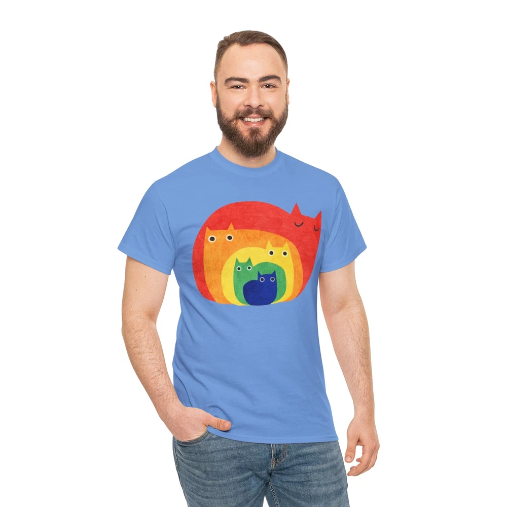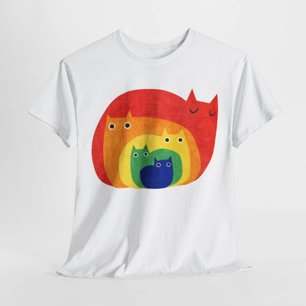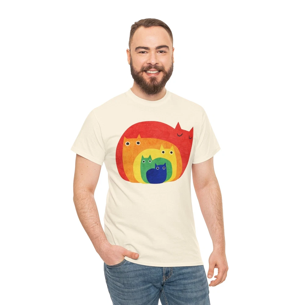Rainbow Cats Cat Art Pride Day Unisex Gildan T-Shirt The unisex heavy cotton tee is the basic staple of any wardrobe. It is the foundation upon which casual fashion grows. No side seams mean there are no itchy interruptions under the arms. The shoulders have tape for improved durability. .: 100% cotton (fiber content may vary for different colors) .: Medium fabric (5.3 oz/yd² (180 g/m²)) .: Classic fit .: Tear-away label .: Runs true to size