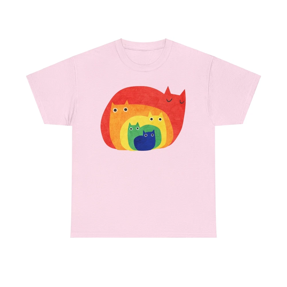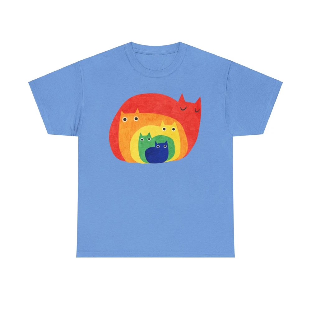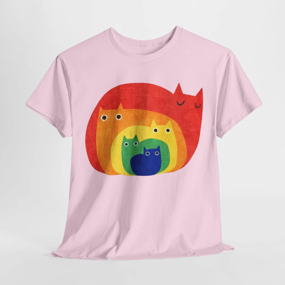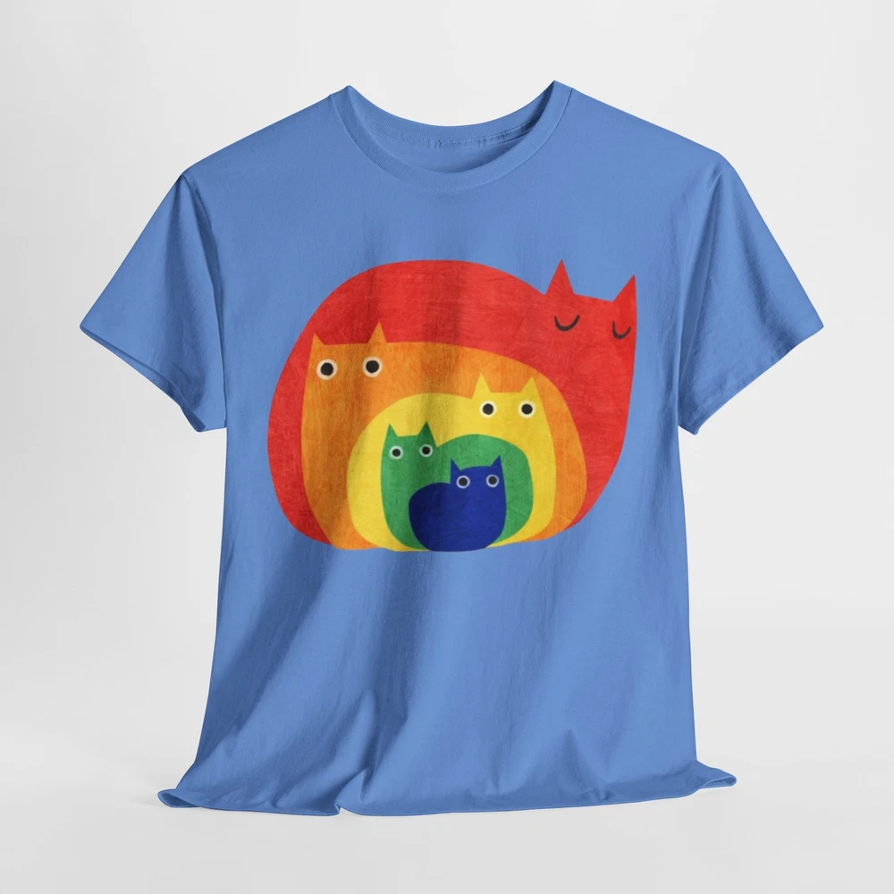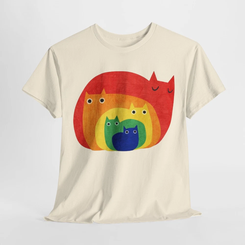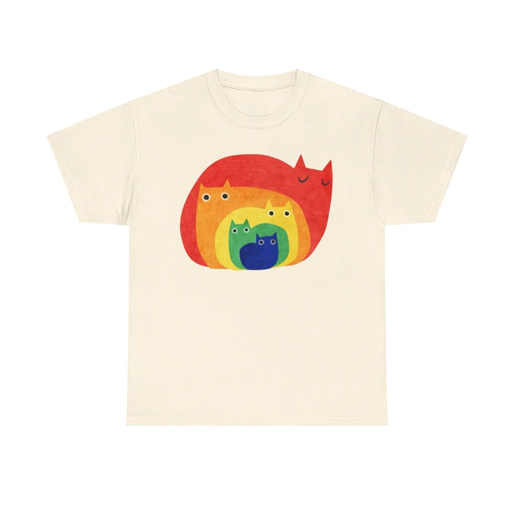 Rainbow Cats Cat Art Pride Day Unisex Gildan T-Shirt The unisex heavy cotton tee is the basic staple of any wardrobe. It is the foundation upon which casual fashion grows. No side seams mean there are no itchy interruptions under the arms. The shoulders have tape for improved durability. .: 100% cotton (fiber content may vary for different colors) .: Medium fabric (5.3 oz/yd² (180 g/m²)) .: Classic fit .: Tear-away label .: Runs true to size
