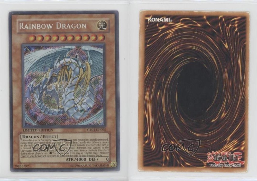 2007 Yu-Gi-Oh! Series 4 - Collectors Tins Limited Edition Promos #CT04-EN005 Rainbow Dragon COMC Item: 139446208 - YuGiOh Card - Featuring Rainbow Dragon Search for more: 2007 Yu-Gi-Oh! Series 4 Search for more: 2007 Yu-Gi-Oh! Series 4 - Collectors Tins Limited Edition Promos View all of our Listings Auctions Buy It Now About Us Located in the beautiful Pacific Northwest, COMC (Check Out My Cards) is the world's largest consignment service for trading card singles. More than 10,000 people have used our consignment service to list over 50 million trading cards. Find out how we can help you consign your items on eBay by contacting us through eBay messaging. COMC -- "The Safe & Easy Way to Buy & Sell" Raw Condition for Modern Cards Unless otherwise noted, raw modern cards are listed in Near Mint-Mint condition or better. A NM-MT card appears to be Mint at first glance, but upon closer inspection, may exhibit some of the following: minor print defects (e.g. roller marks, print line, dimple), minor scratches, slight edge wear, and slight corner wear. Centering is clearly visible in the images provided and does not factor into our condition assessment. Raw Condition for Vintage Cards Unless otherwise noted, raw vintage cards are listed in Excellent condition or better. An EX card may exhibit some of the following: minor rounding of corners, surface wear, print defects, light scratches, and slight edge wear/chipping. Centering is clearly visible in the images provided and does not factor into our condition assessment. Domestic Shipping Combined shipping for multiple items is available. To receive combined shipping, please ensure all desired items are in your eBay shopping cart before proceeding to checkout. eBay limits orders to 40 items per order. We automatically combine multiple orders placed on the same day. If you place multiple orders on the same day, please contact us to request a refund of applicable shipping costs. Signature confirmation may be required on invoices over $400. All cards are protected and shipped securely. International Shipping COMC offers eBay's International Shipping (EIS) for international orders under $2,500* (see country exceptions below). All duties and import fees are paid at checkout; in the rare event that there are additional import fees upon delivery, these are borne by the buyer. EIS packages route through a shipping hub in Erlanger, KY before shipping to their final destination. Please note that EIS does not allow for combined shipments. The shipping rates are determined by eBay and cannot be adjusted. *Maximum sale price exceptions: Colombia, Kuwait ($2,000); Taiwan ($1,539); Chile, Costa Rica, Guatemala, Honduras, Trinidad and Tobago ($1,000); Antigua and Barbuda, Aruba, Belize, Dominica, Grenada, Philippines, Saint Kitts and Nevis, Saint Lucia, Montserrat, Turks and Caicos Islands ($500); Dominican Republic, El Salvador ($200). Please request a shipping quote through eBay messaging for orders that exceed the maximum sale price supported by eBay's International Shipping. You will be responsible for all duties and import fees for international orders shipped outside the EIS. All cards are protected and shipped securely. Payment COMC does not accept offers on our cards through our eBay storefront. COMC utilizes eBay’s managed payments system. If you are experiencing difficulties making a payment, please contact eBay for assistance. Return Policy Returns are only accepted on the rare occasion the item is not as described. If you are making a return, please initiate the return process through eBay so a mailing label can be provided for you. Prior to listing, our expert team carefully assessed this item to represent it accurately. Please review the description and high-definition images prior to purchasing to ensure this item meets your satisfaction. We welcome you to contact us if you have further questions about this item. Trust and Integrity COMC carefully assesses each item consigned to us to prevent fraudulent items from entering the marketplace. If you believe an item offered on COMC may be fraudulent, please contact us with details so we can investigate the issue. Items we determine are outside our supported items policy may be removed. Last Modified: 5/27/2025 11:28:58 AM PDT