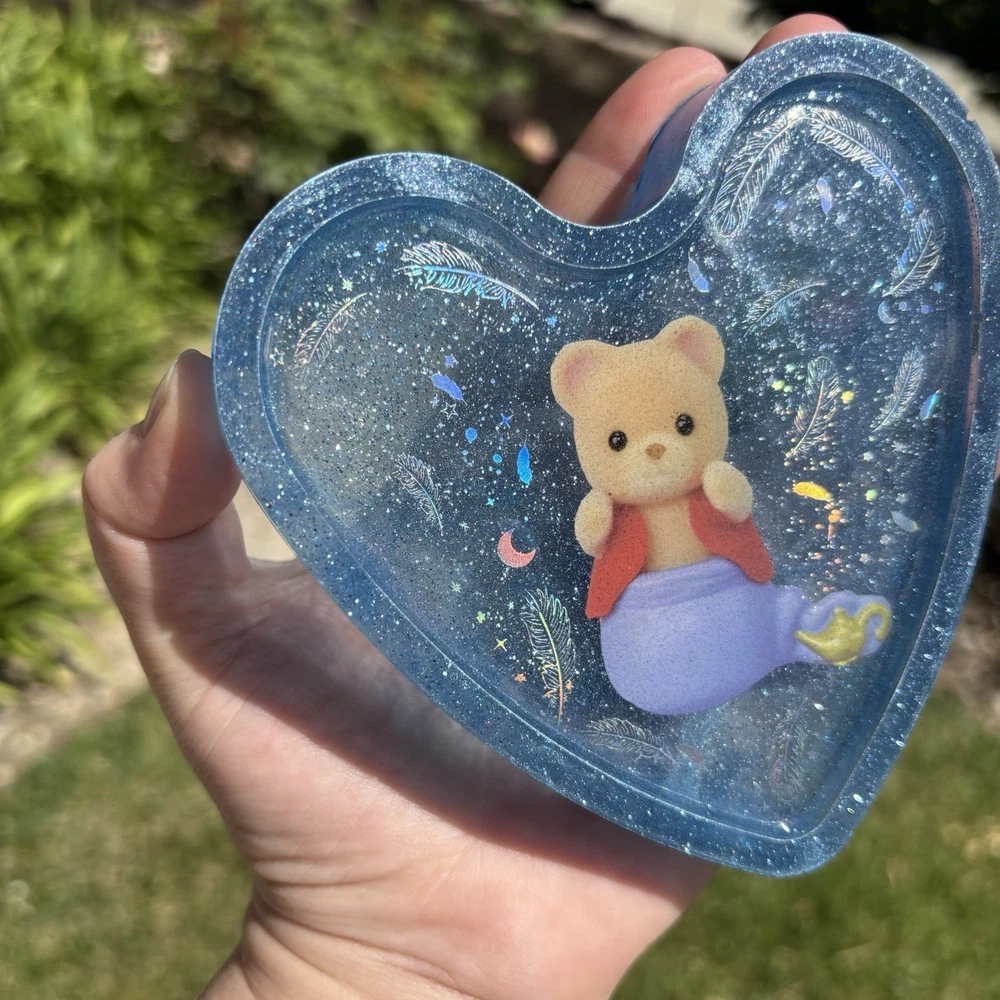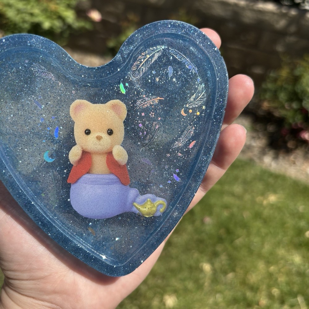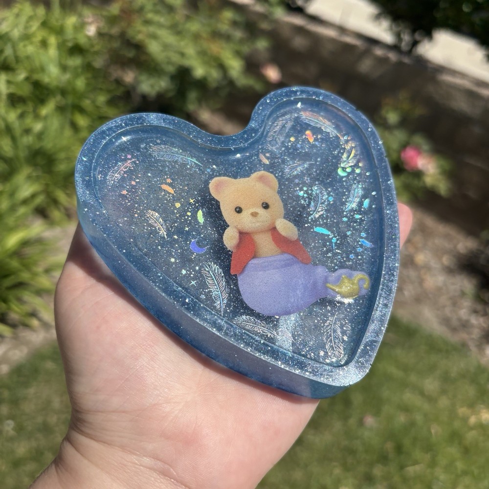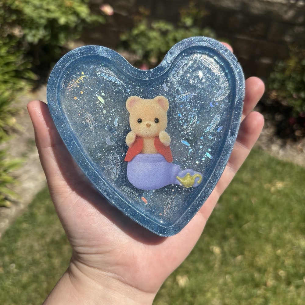 ‘Genie Does As You Wish’ Genie Calico Critters Rainbow Holographic Feather Insert Inspired Blue Glittery Heart Shaped Resin Coaster Handmade by Shop EarthySmurf. *Please note, resin is an imperfect art. Craters, holes, sharp edges, bubbles and more may be present in your piece. Please examine all pictures*