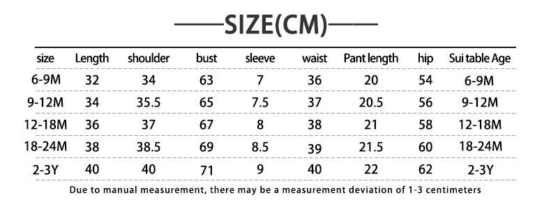 ⭐Department: Male infant/female infant ⭐Sleeve Length:Short Sleeve ⭐Material: Cotton blend ⭐ Closure type: Pullover ⭐ Thickness: Cool ⭐ Age Reference: 6-9 Months,9-12 Months,12-18Months,18-24Months,2-3 Years ⭐Colour: Apricot,Grey ⭐Season: Summer ⭐Occasion:Daily Life, Casual ⭐Accent: Rainbow Patchwork ⭐Type:Tracksuit Size Chart: ⭐Size 6-9M #, length 32cm; Sleeve length: 7CM;Chest circumference: 63cm;Pant length: 20CM; for 6-9 months. ⭐Size 9-12M #, length 34cm; Sleeve length: 7.5CM;Chest circumference: 65cm;Pant length: 21.5CM; for 9-12 months. ⭐Size 12-18M #, length 36cm;Sleeve length: 8CM;Chest circumference: 67cm;Pant length: 23CM; for 12-18 months. ⭐Size 18-24M #, length 38cm;Sleeve length: 8.5CM; Chest circumference: 69cm;Pant length: 24.5CM; for 18-24months. ⭐Size 2-3Y #, length 40cm; Sleeve length: 9CM;Chest circumference: 71cm;Pant length: 26CM; for 2-3years Please note that: 1. There is a difference of 0-3 centimeters in manual measurement. Before purchasing this product, please carefully check the measurement chart. 1 centimeter=0.39 inches 2. Please note that slight color differences due to lighting and screen are normal. If there are any quality issues with the product, please feel free to contact us and we will help you solve the problem as soon as possible. Package Content: 1 x Tops 1 x Pants Shipments & Payment: Your order will be handled within 1-2 business days after receiving your clear payment. Weekend excluded Tracking number will be provided for you ASAP. We accept PayPal.