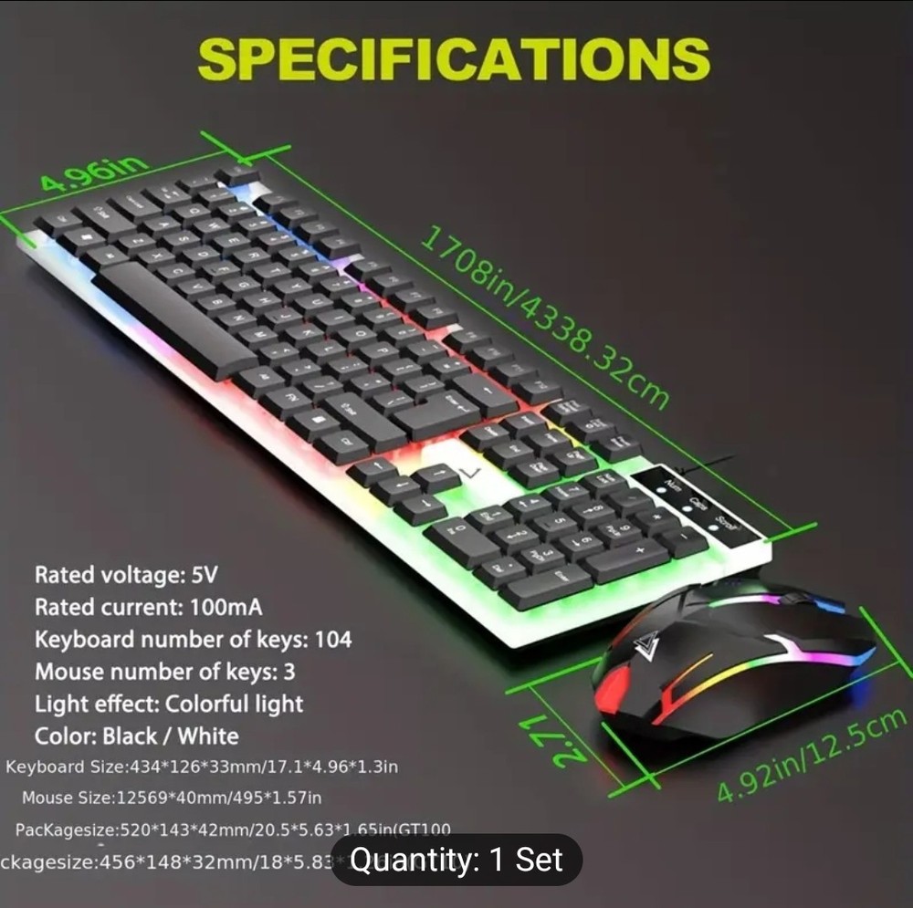 This is a Rainbow Gaming Keyboard and Mouse Combo featuring a ZIYOU LANG brand mechanical keyboard in black color. The keyboard has a QWERTY layout, illuminated keys, enhanced function keys, and is water-resistant. It is a wired USB connectivity with plug and play functionality. The set includes a Logitech BASE model keyboard and comes with English language keys.